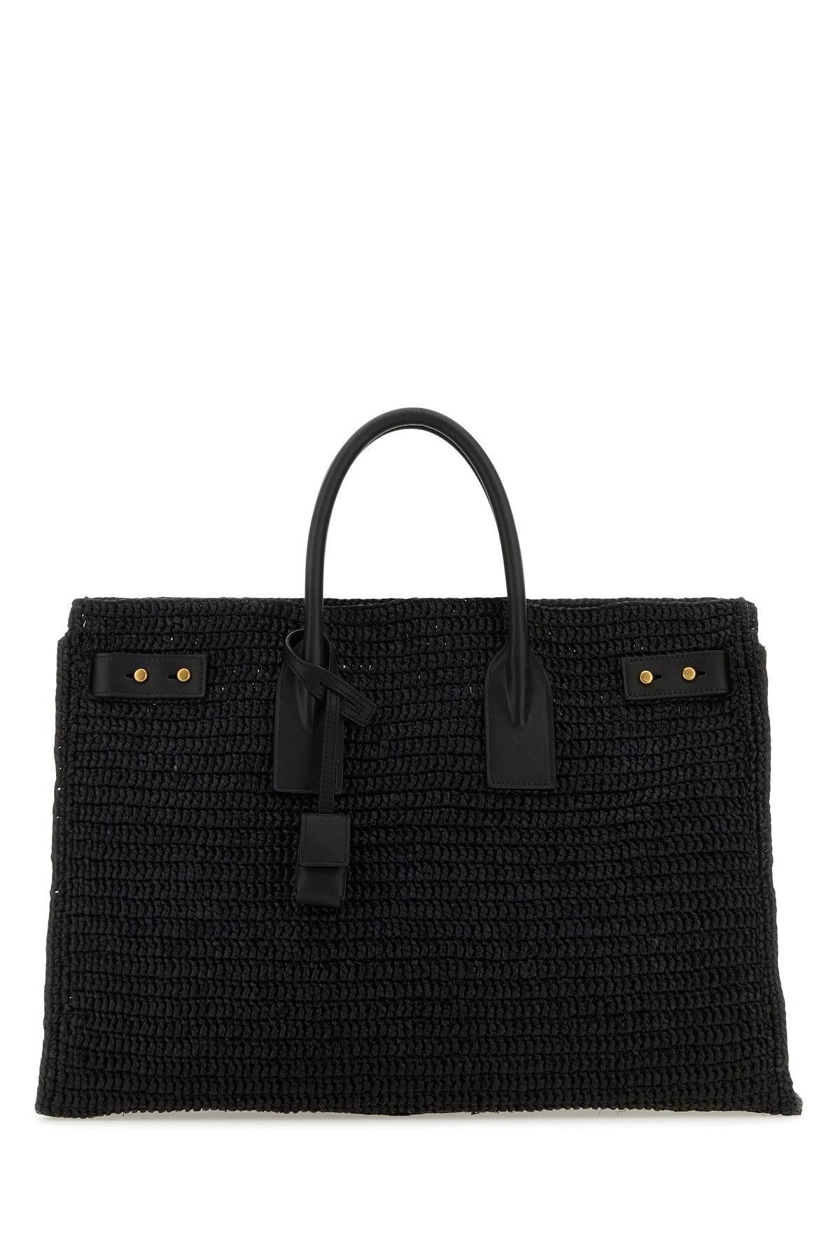 Shopping bag realized in raffia with tonal leather inserts enriched by tonal leather accessory.