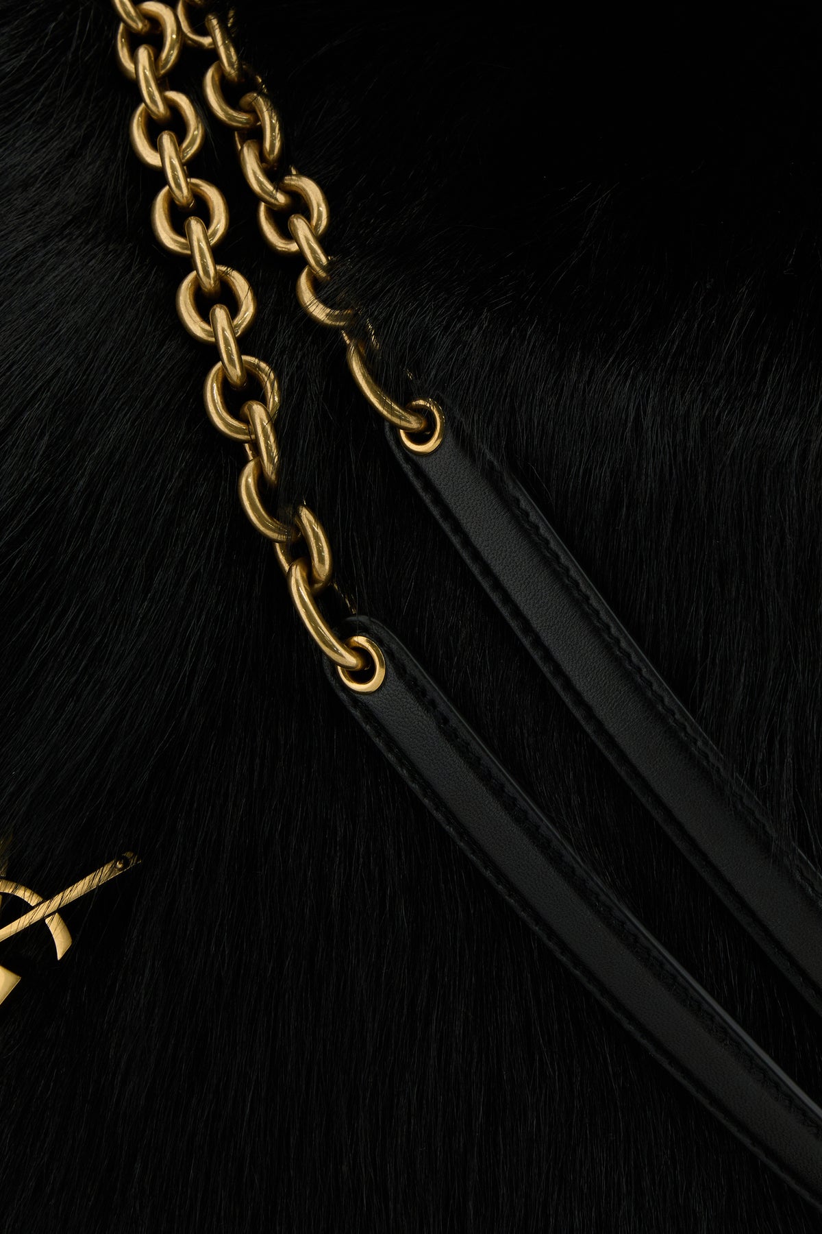 - Metal chain shoulder strap with leather shoulder pad that can be worn single or double