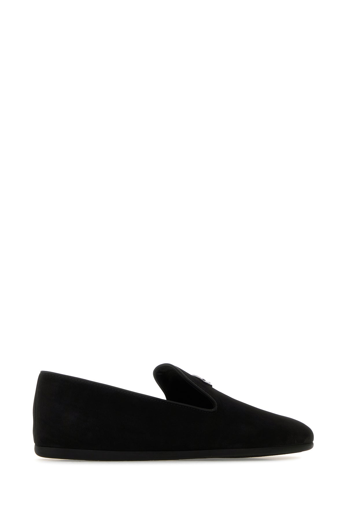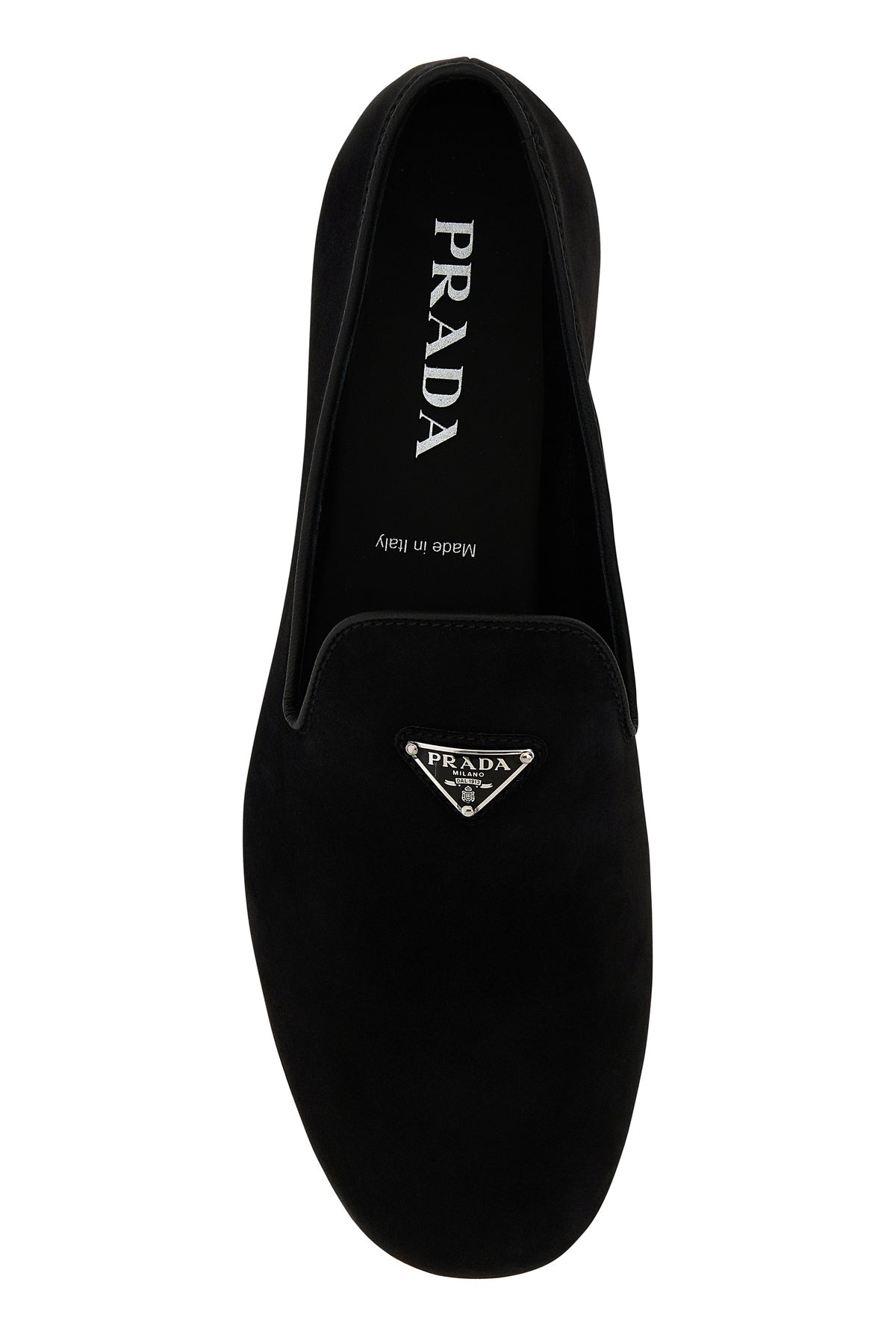 Loafers realized in suede enriched by iconic metal logoed triangle at the front.