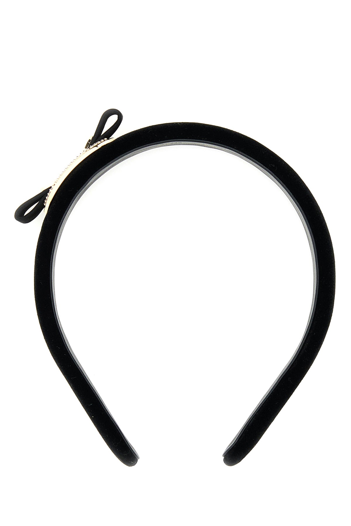 Hair band realized in velvet enriched by iconic tonal fabric Vara bow with metal logoed plate and rhinestones.