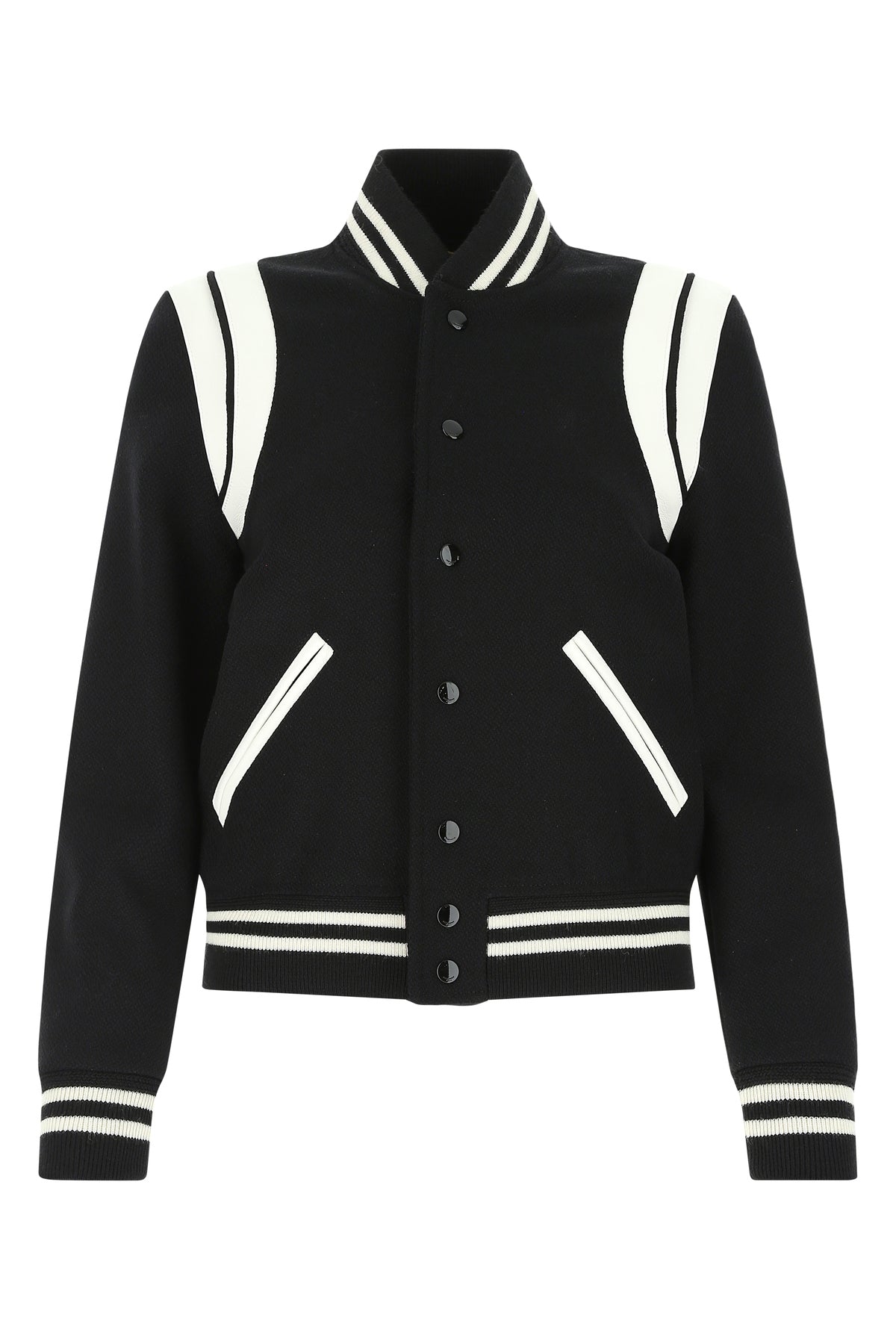 Bomber jacket realized in wool blend enriched by contrasting pebble leather inserts.
