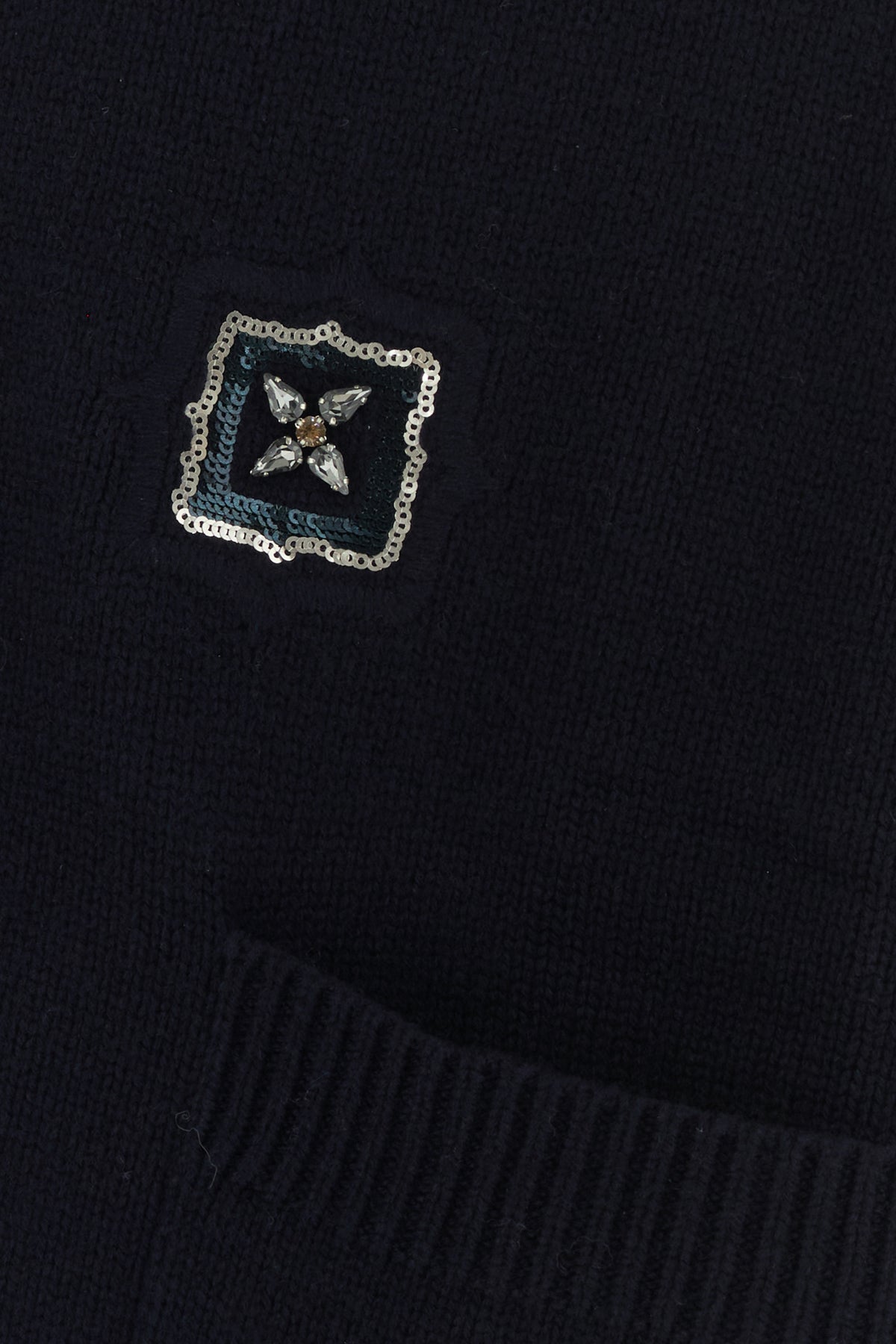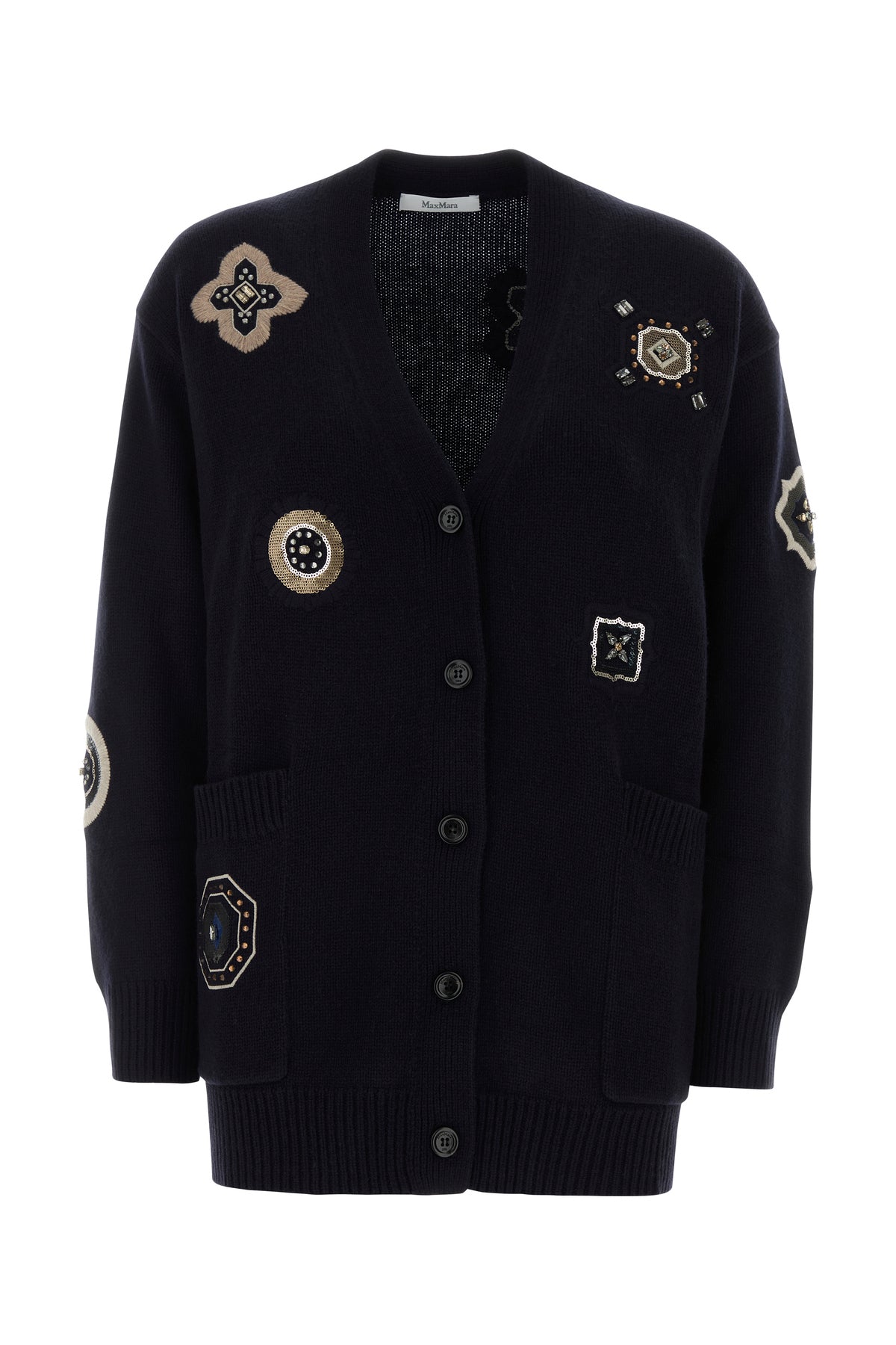 Oversize cardigan realized in wool and cashmere characterized by peculiar embroideries with rhinestones on the entire surface.