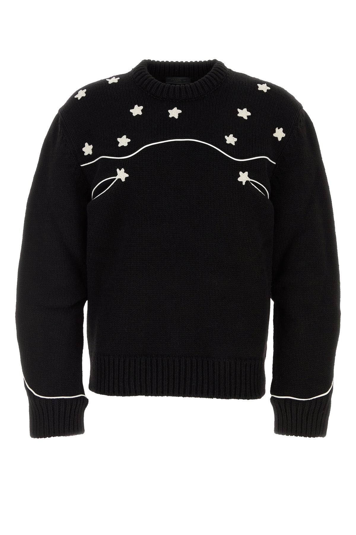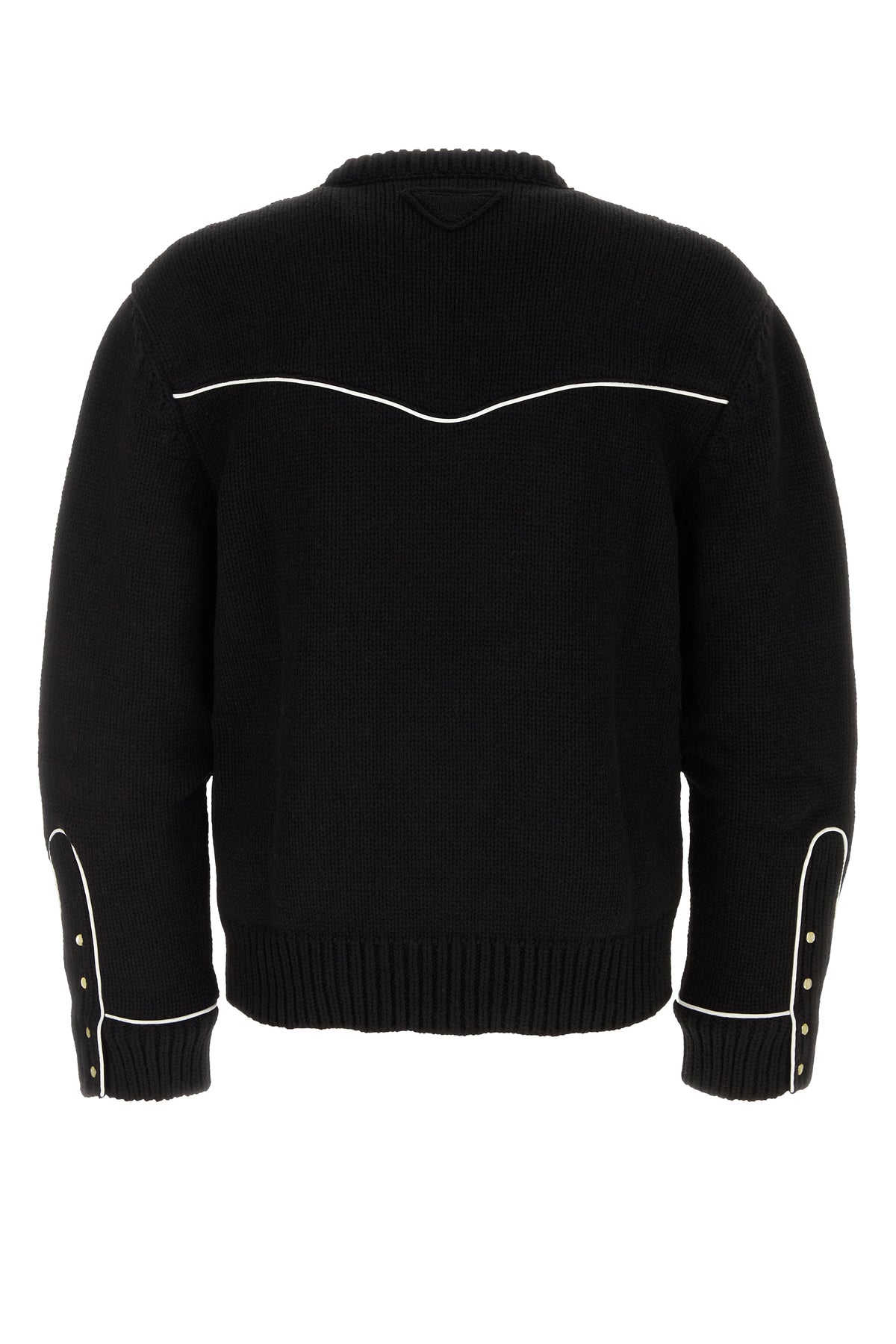 Sweater realized in pure wool characterized by peculiar embroidery at the top enriched by iconic fabric triangle at the back.