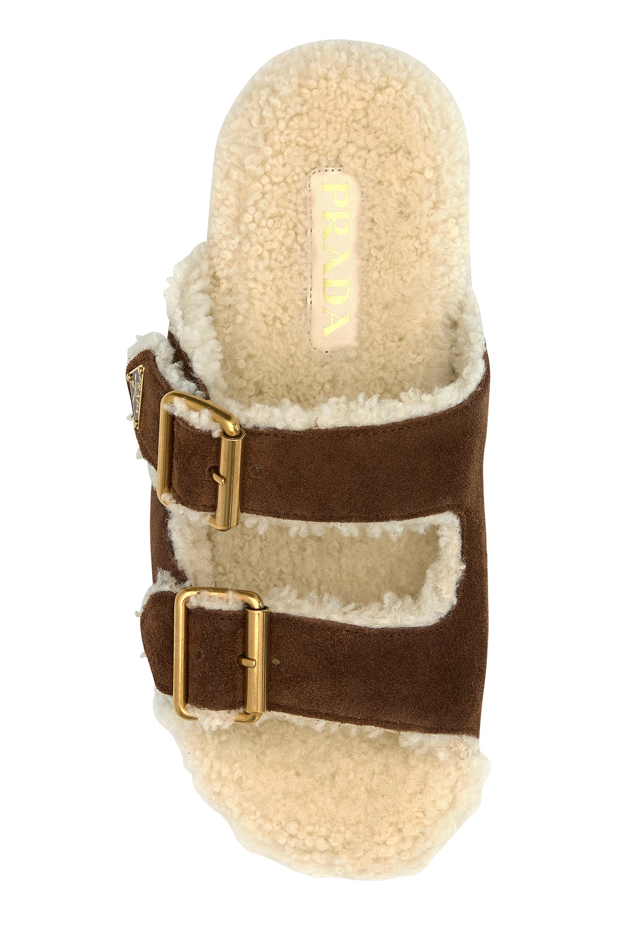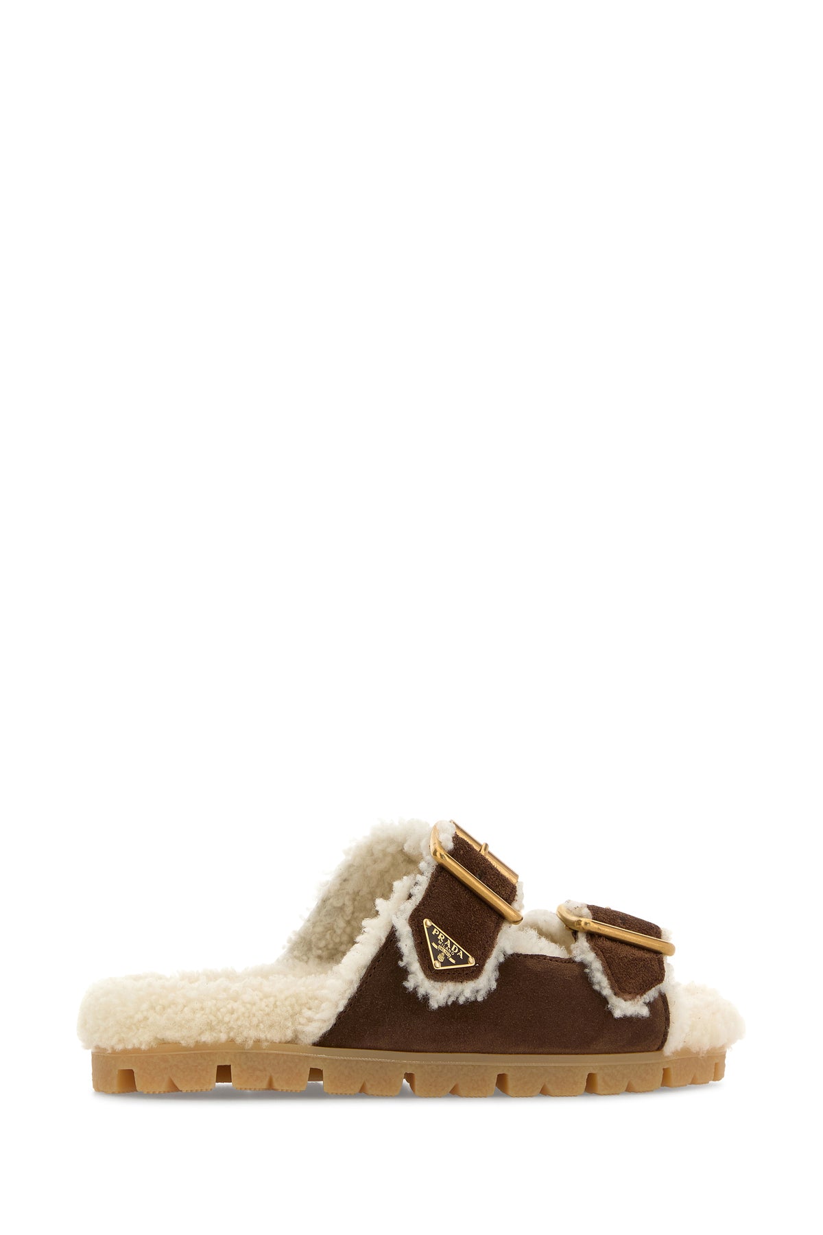 Slippers realized in suede enriched by metal iconic logoed triangle on the side.