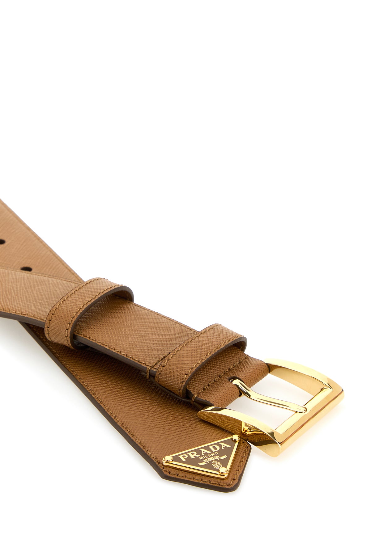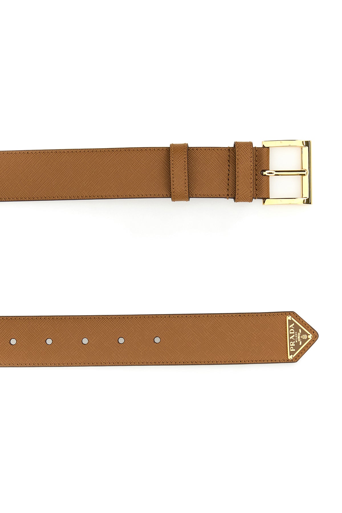 Belt realized in Saffiano leather enriched by metal iconic logoed triangle.