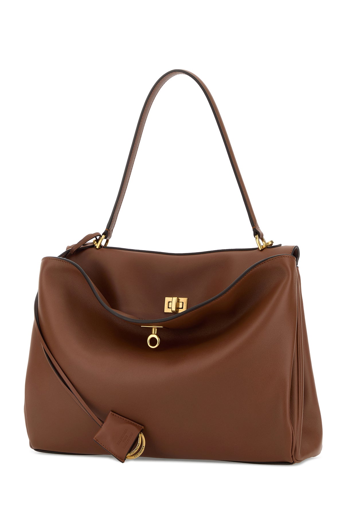 Handbag realized in smooth calf leather enriched by detachable tonal leather accessory with metal rings.