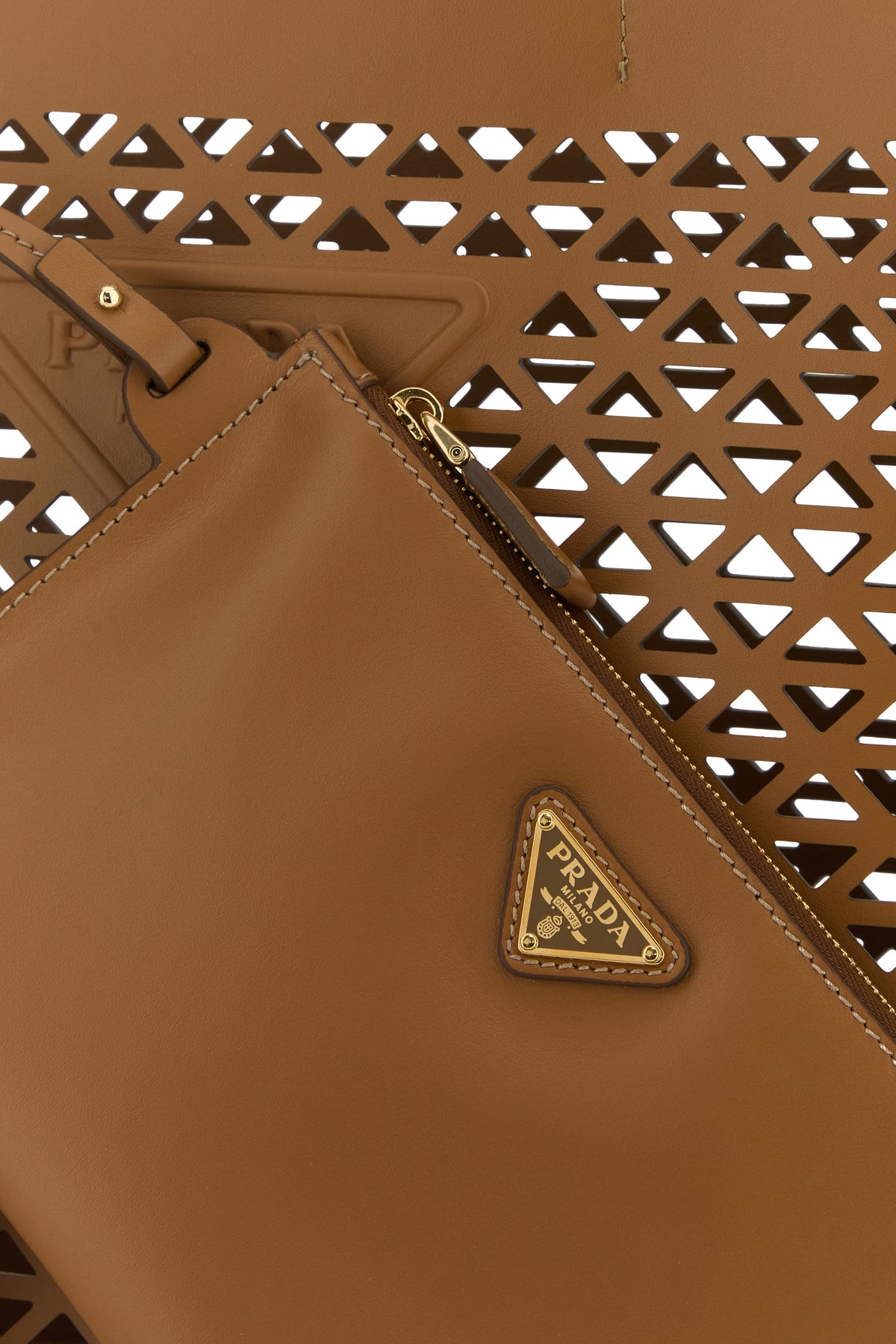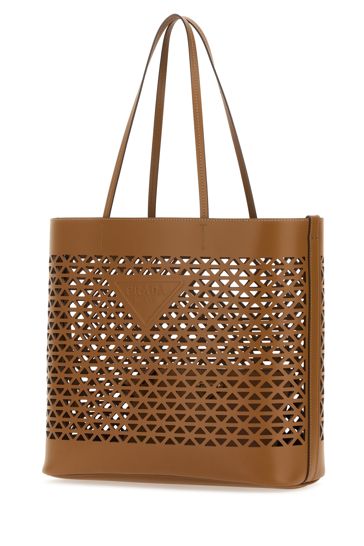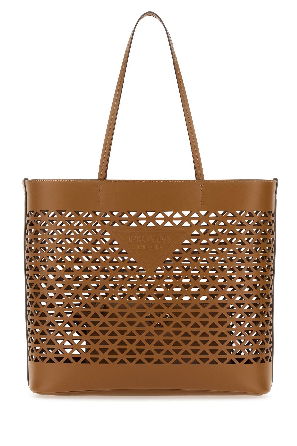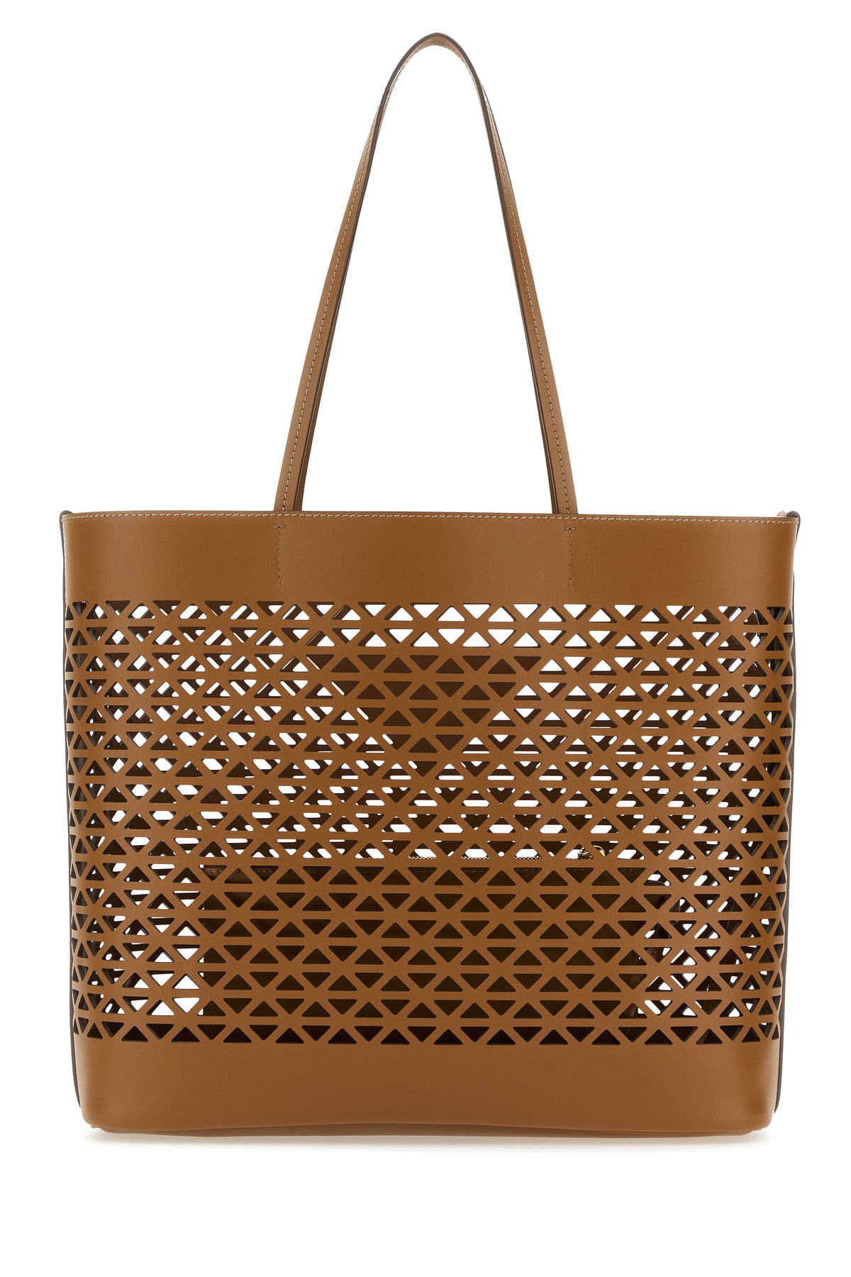 Shopping bag realized in leather characterized by peculiar cut-out details on the entire surface and tonal logo in relief at the front.