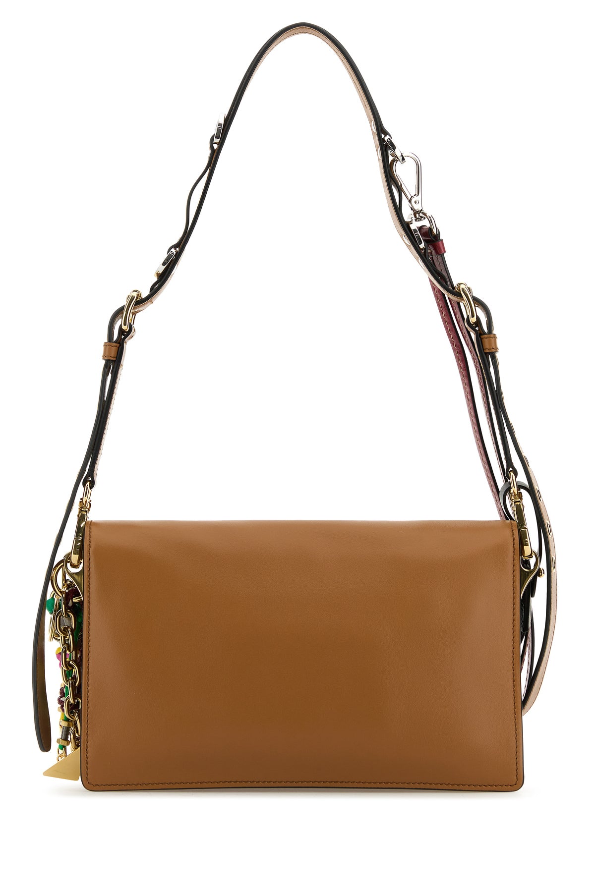 Shoulder bag realized in slightly pebble leather enriched by logoed metal detail at the front and detachable peculiar accessories on the shoulder strap.