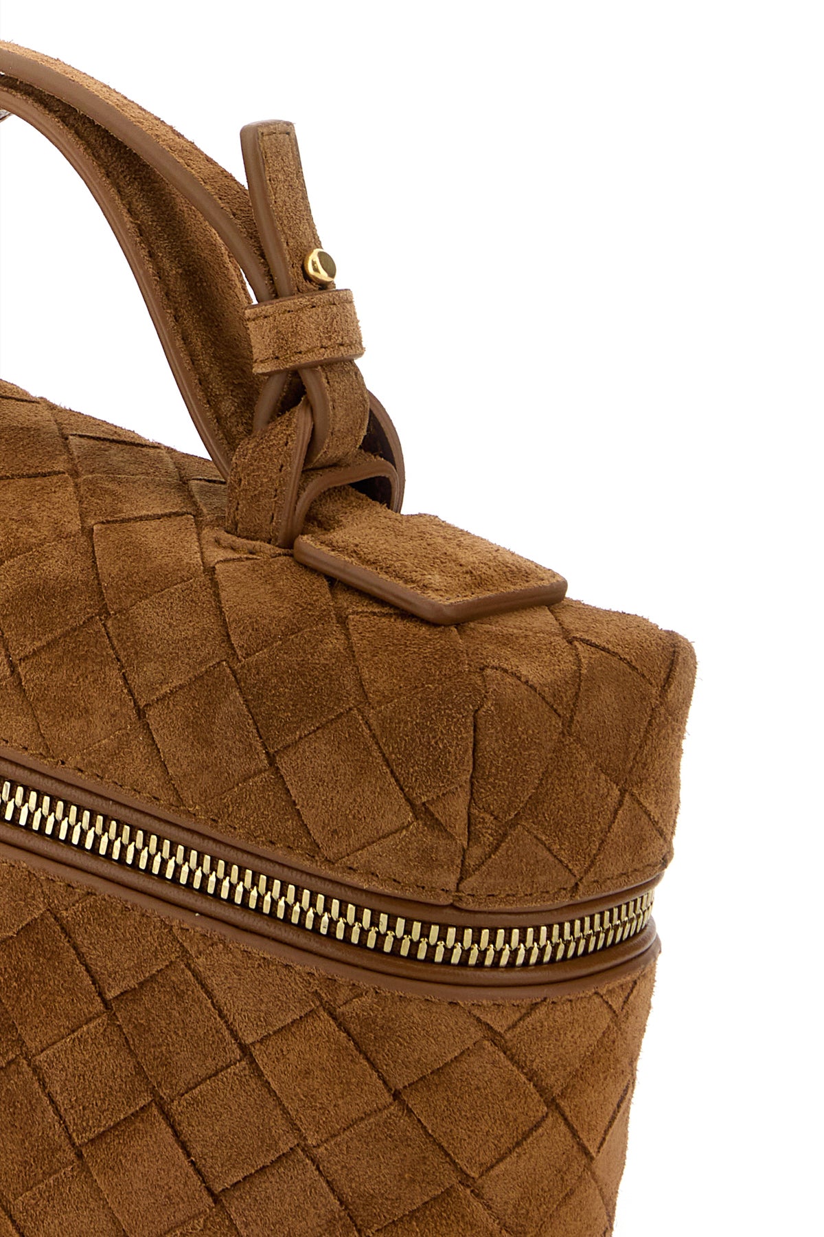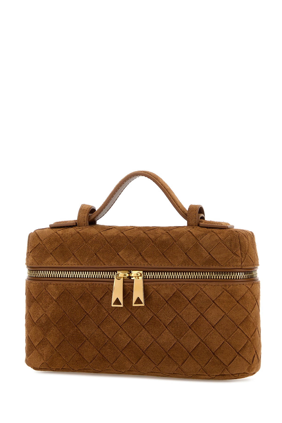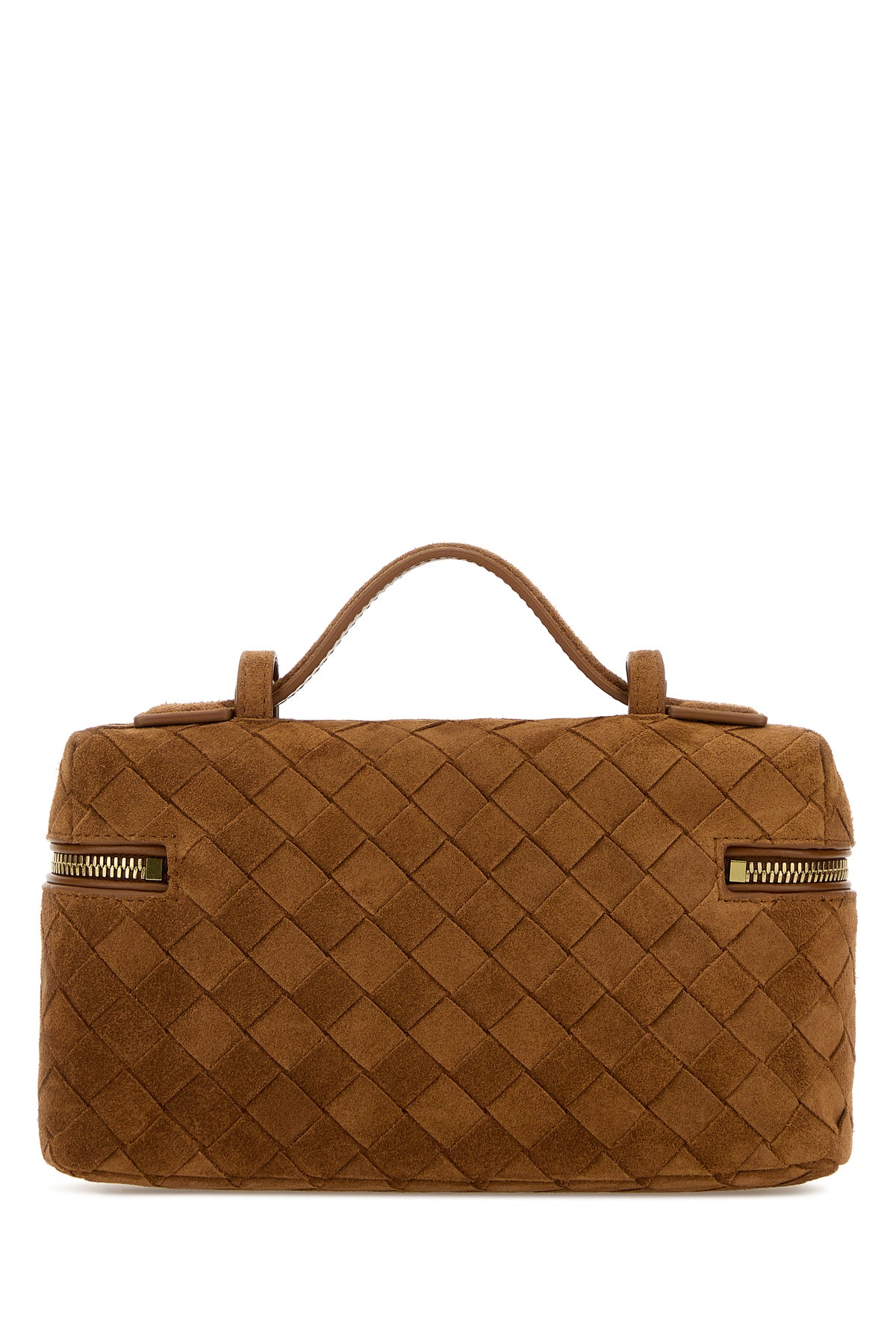 Handbag realized in calf suede characterized by iconic Intrecciato motif on the entire surface.