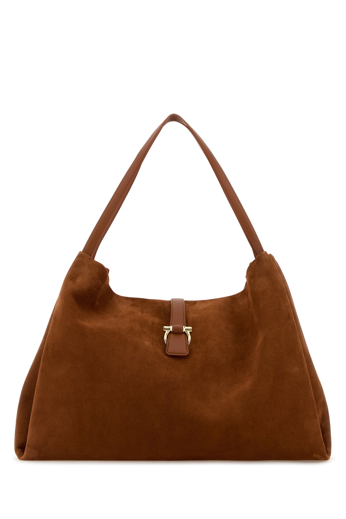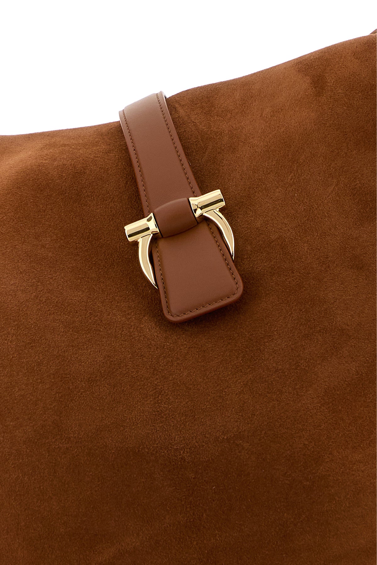 Crossbody bag realized in calf suede enriched by metal Gancini detail at the front.