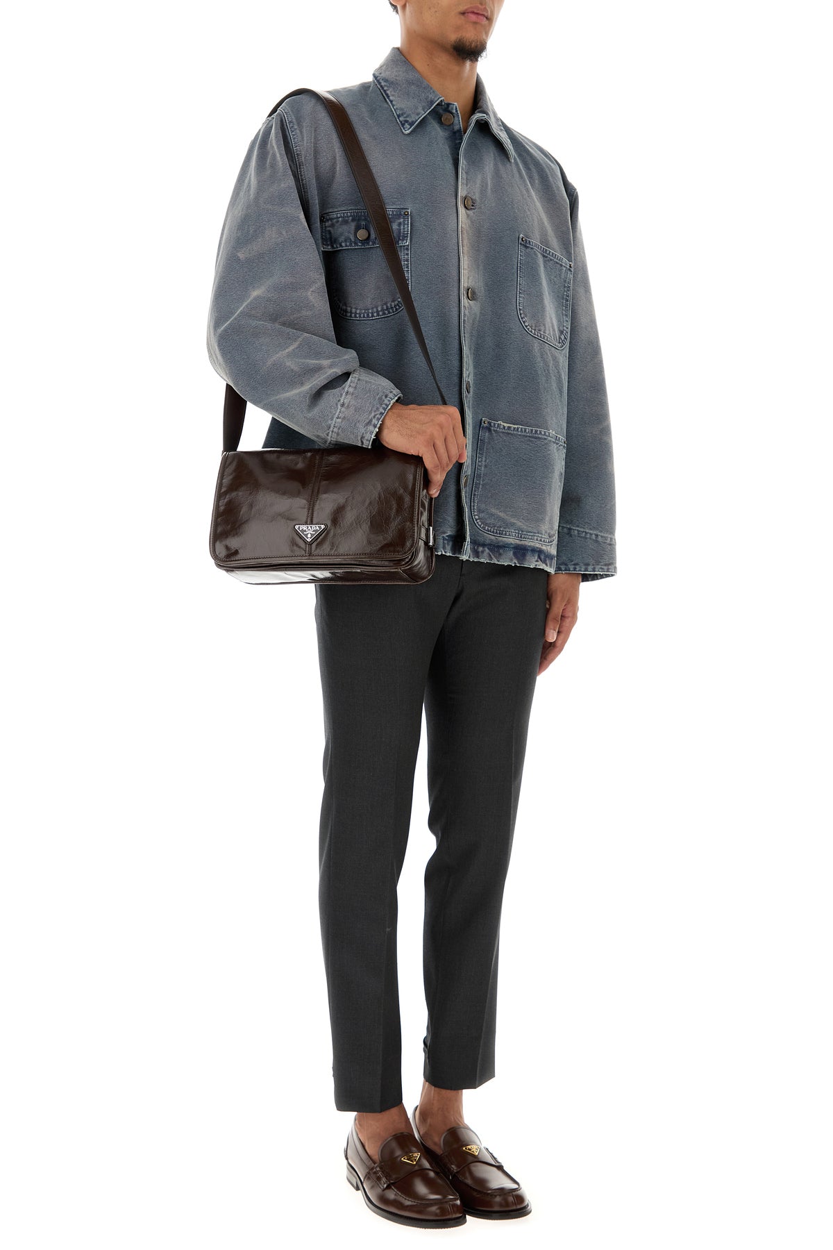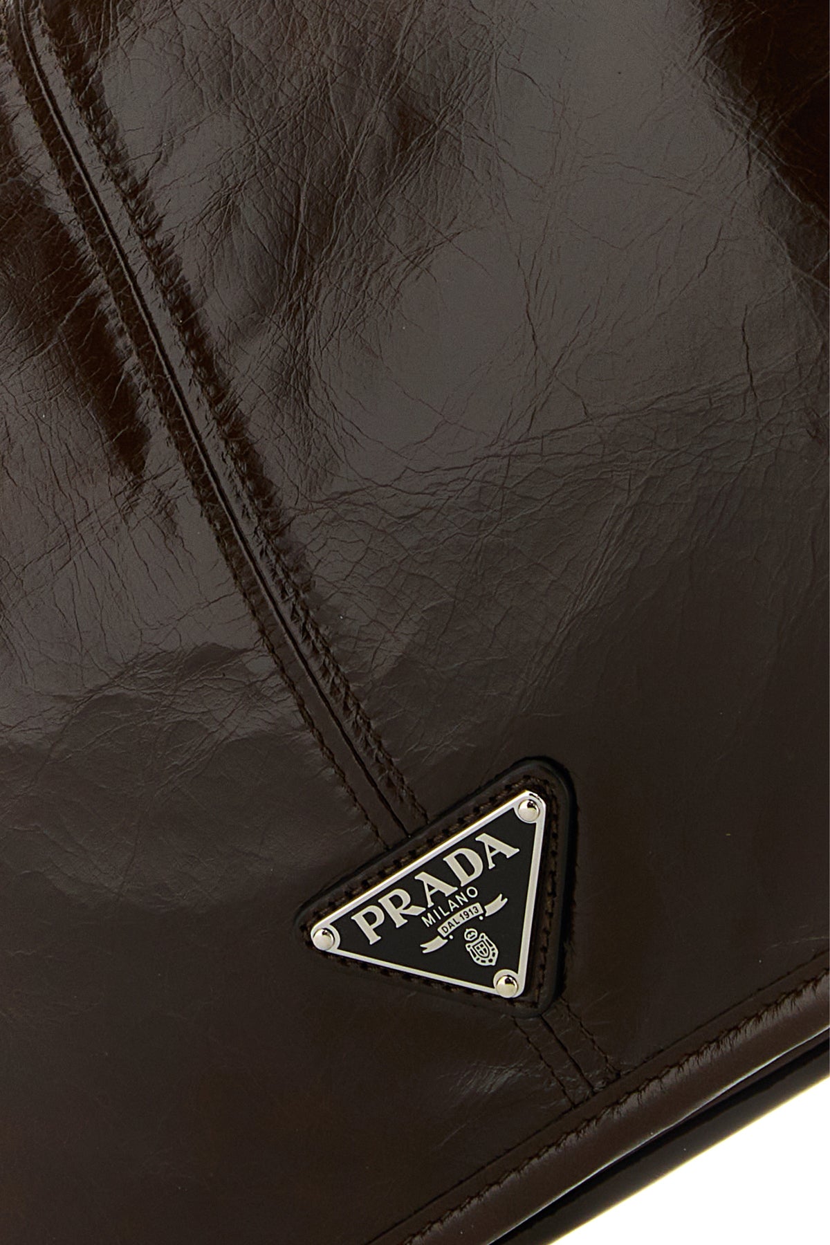 Crossbody bag realized in polished-finish leather enriched by iconic metal logoed triangle at the front.