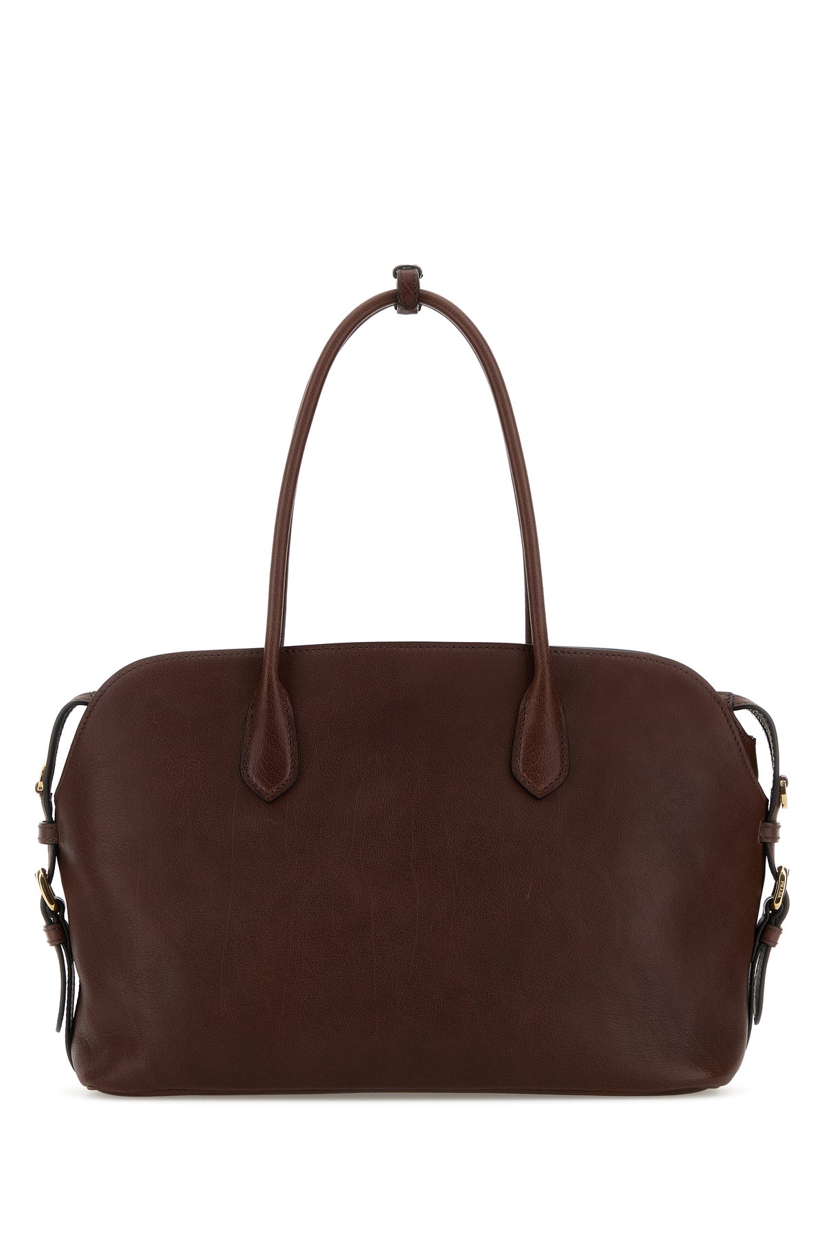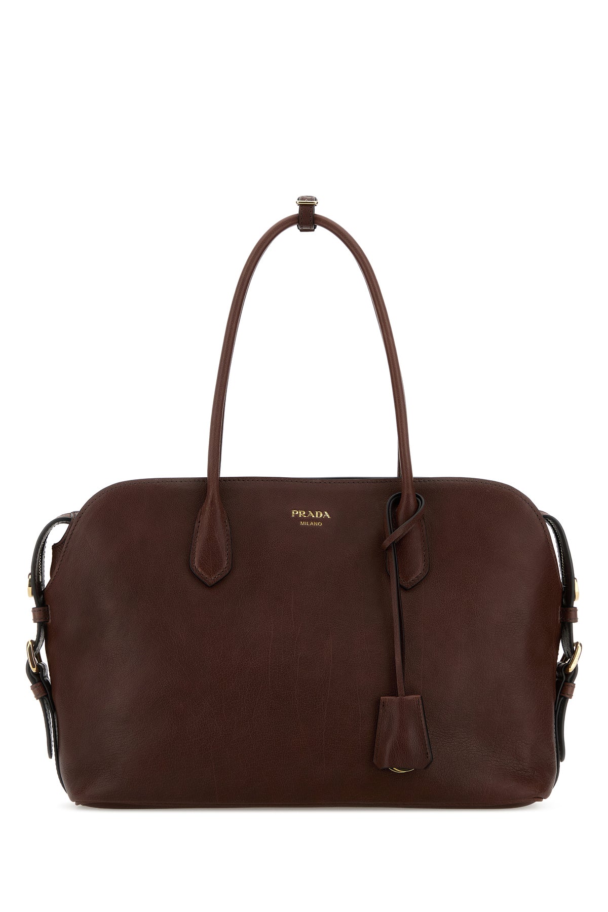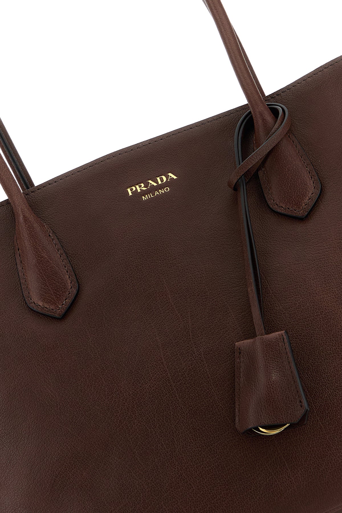 Shopping bag realized in pebble leather characterized by laminated printed logo at the front.