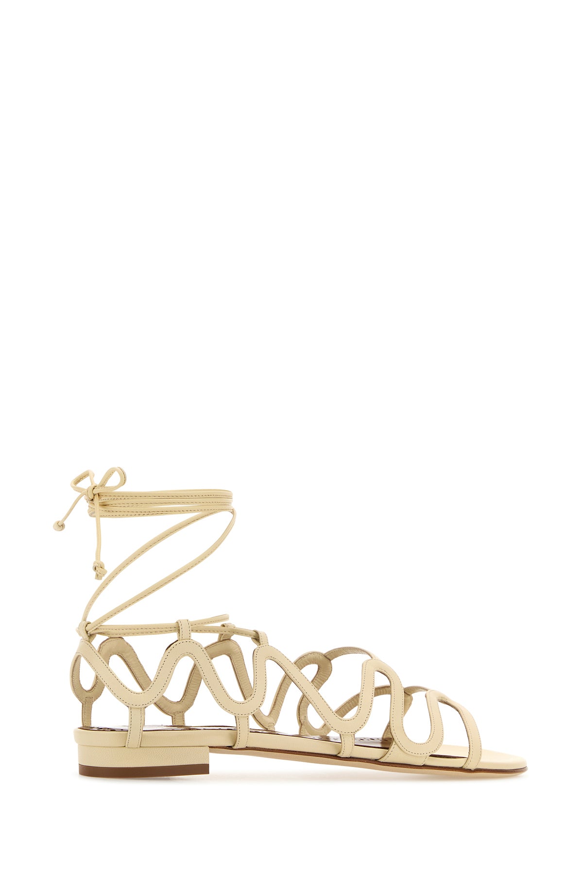 Sandals realized in leather characterized by laces to tie closure on the ankle.