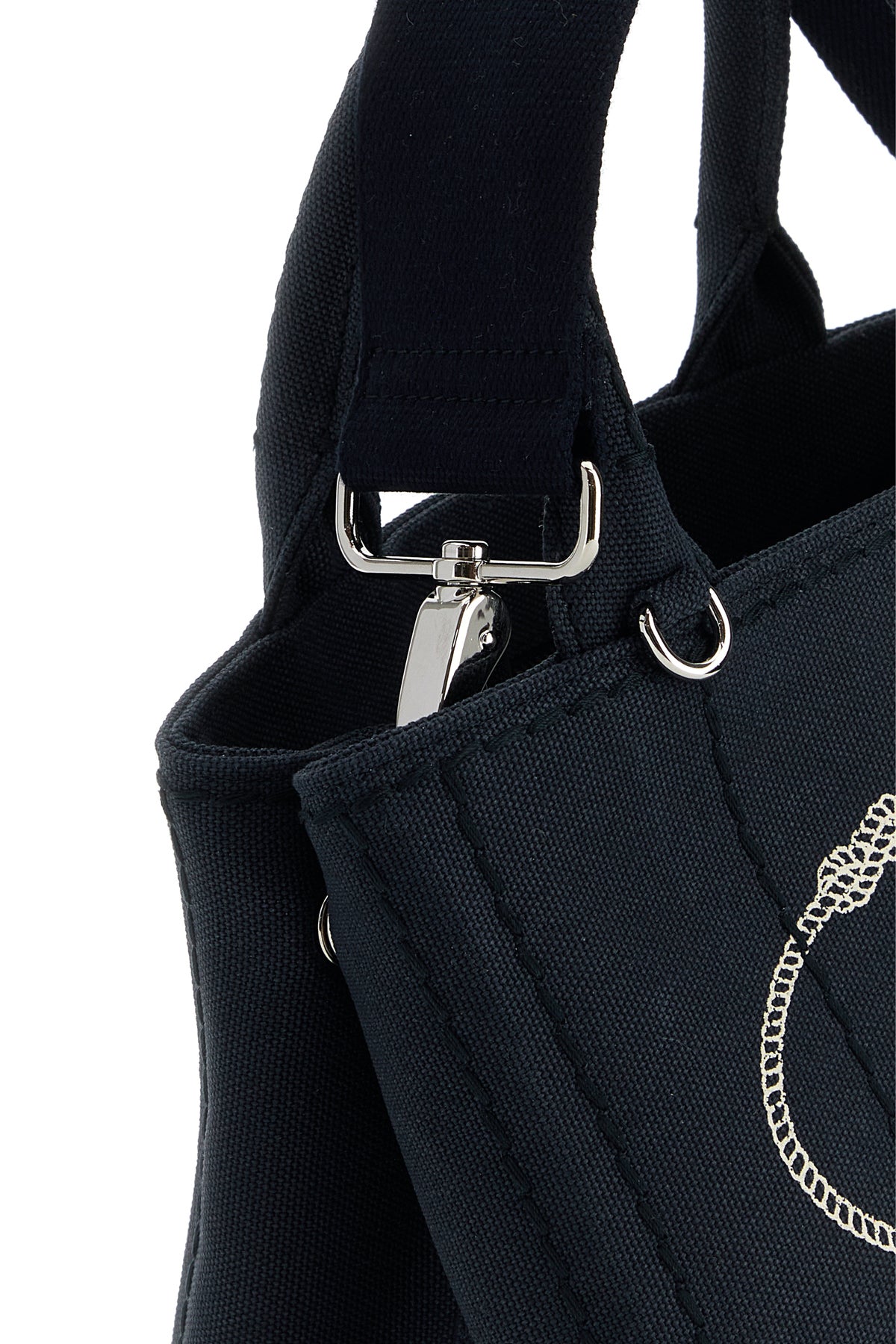 Handbag realized in canvas characterized by printed logo at the front enriched by iconic logoed metal triangle on the side.