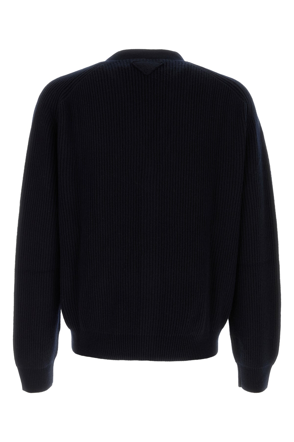 Cardigan realized in pure cashmere enriched by iconic tonal fabric triangle at the back.