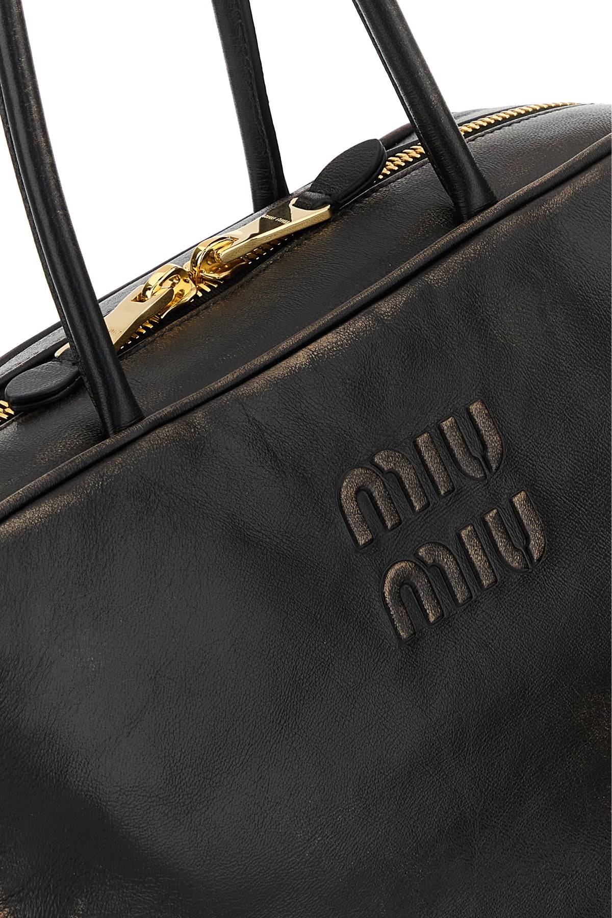 Handbag realized in vintage effect leather characterized by in relief logo at the front.