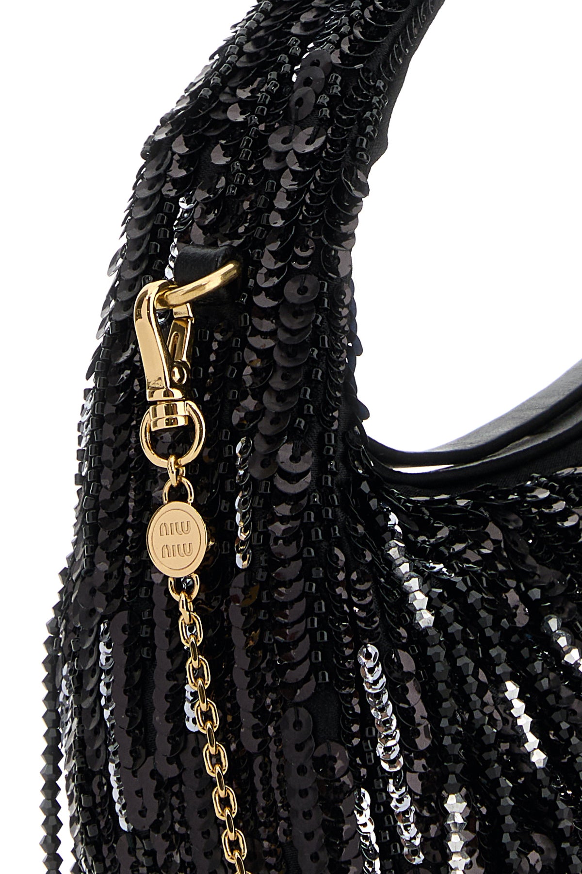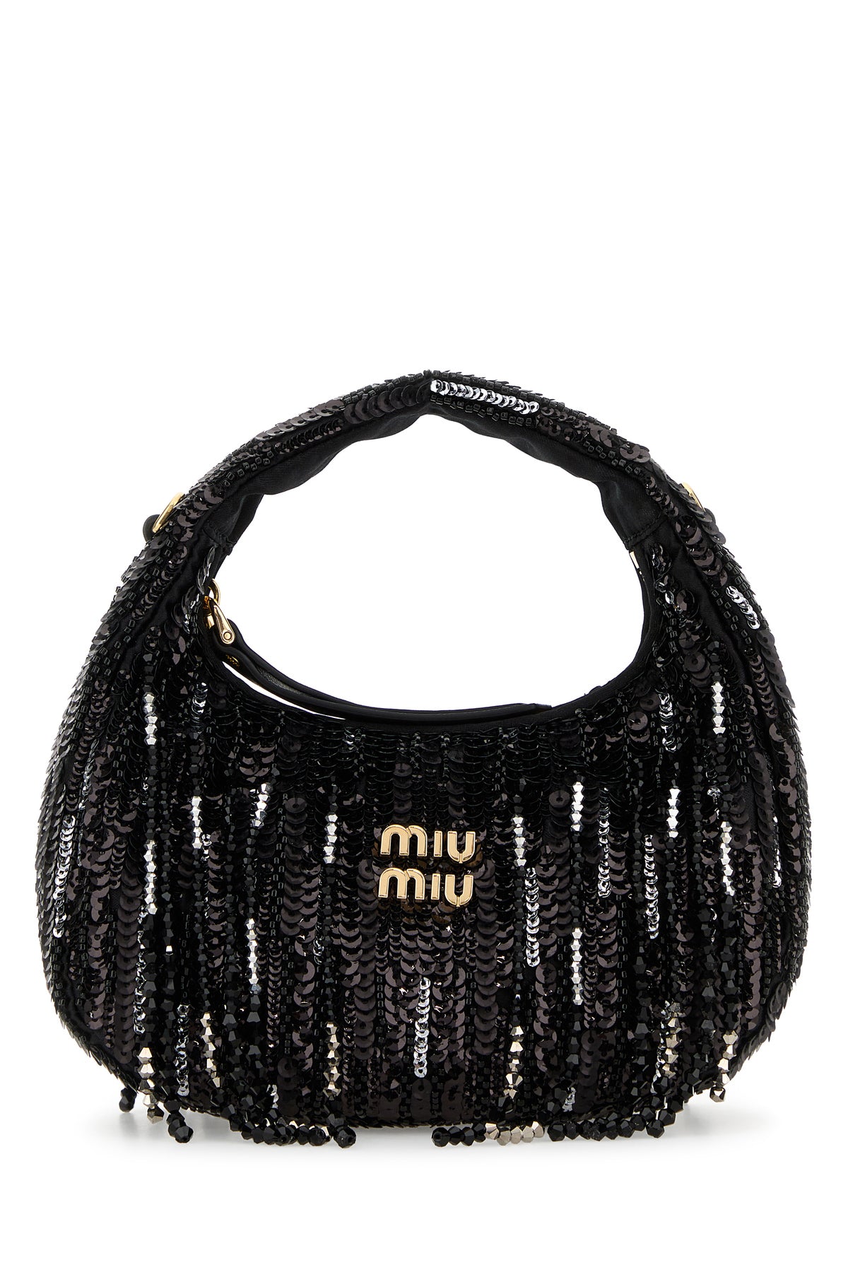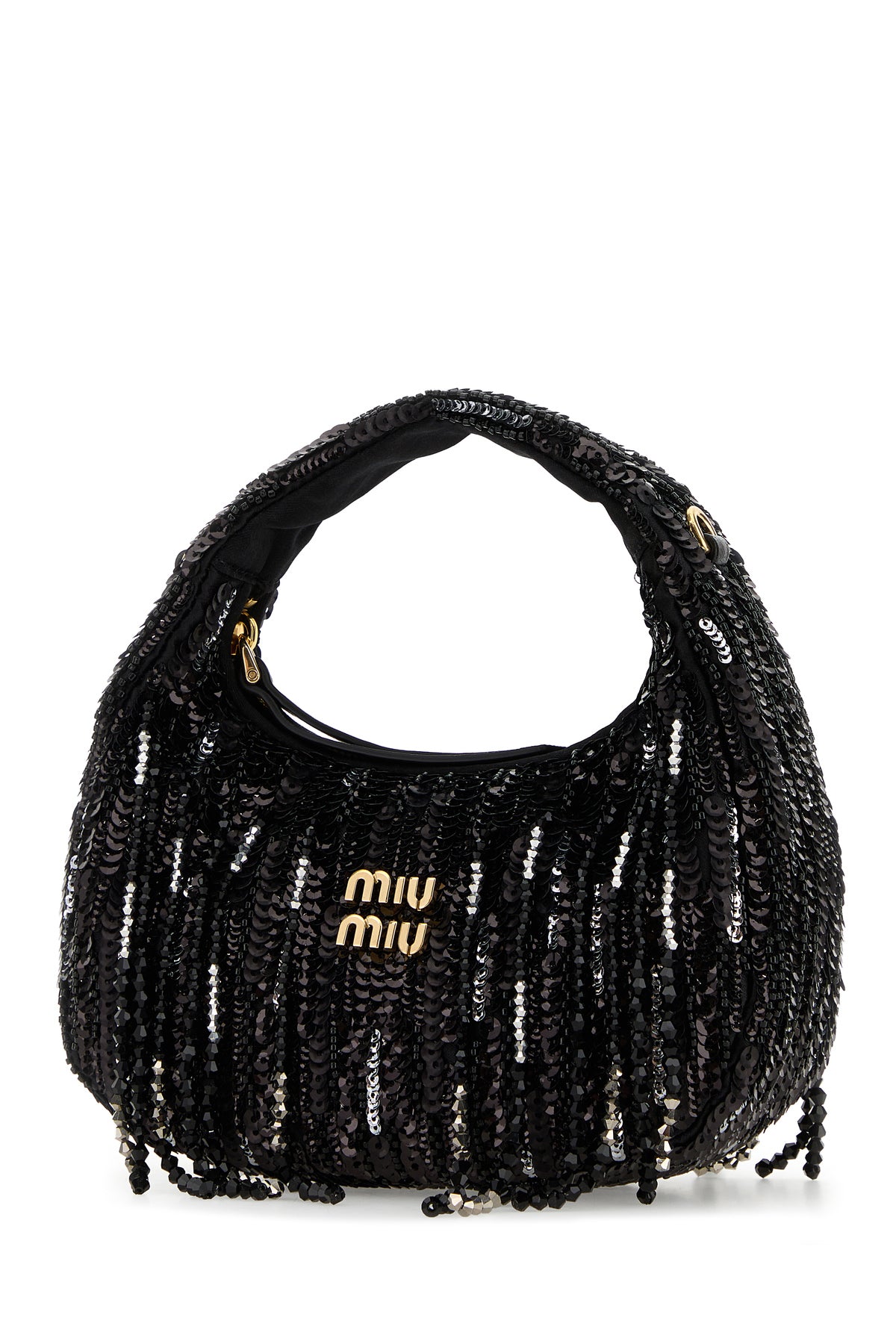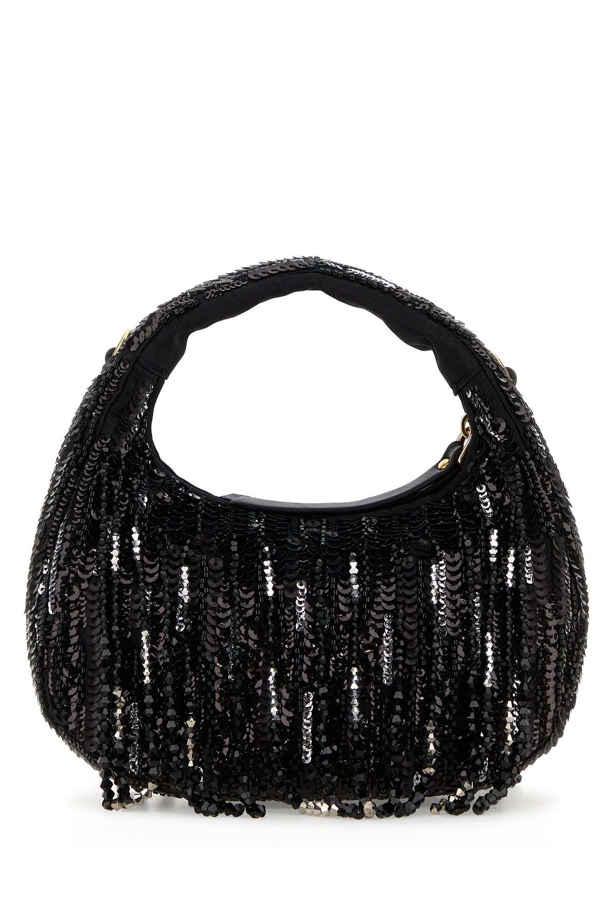 Handbag realized in fabric entirely covered by sequins and beads enriched by metal lettering logo at the front.