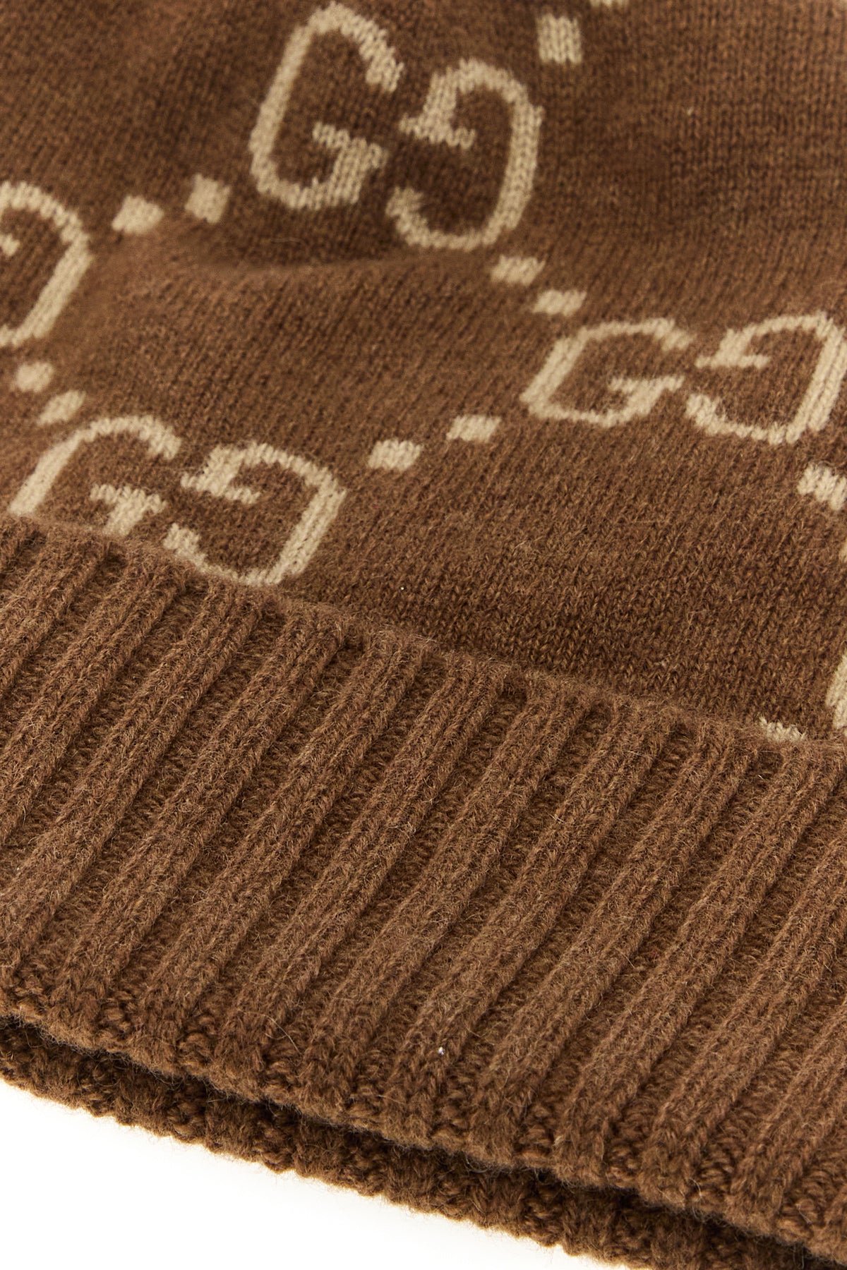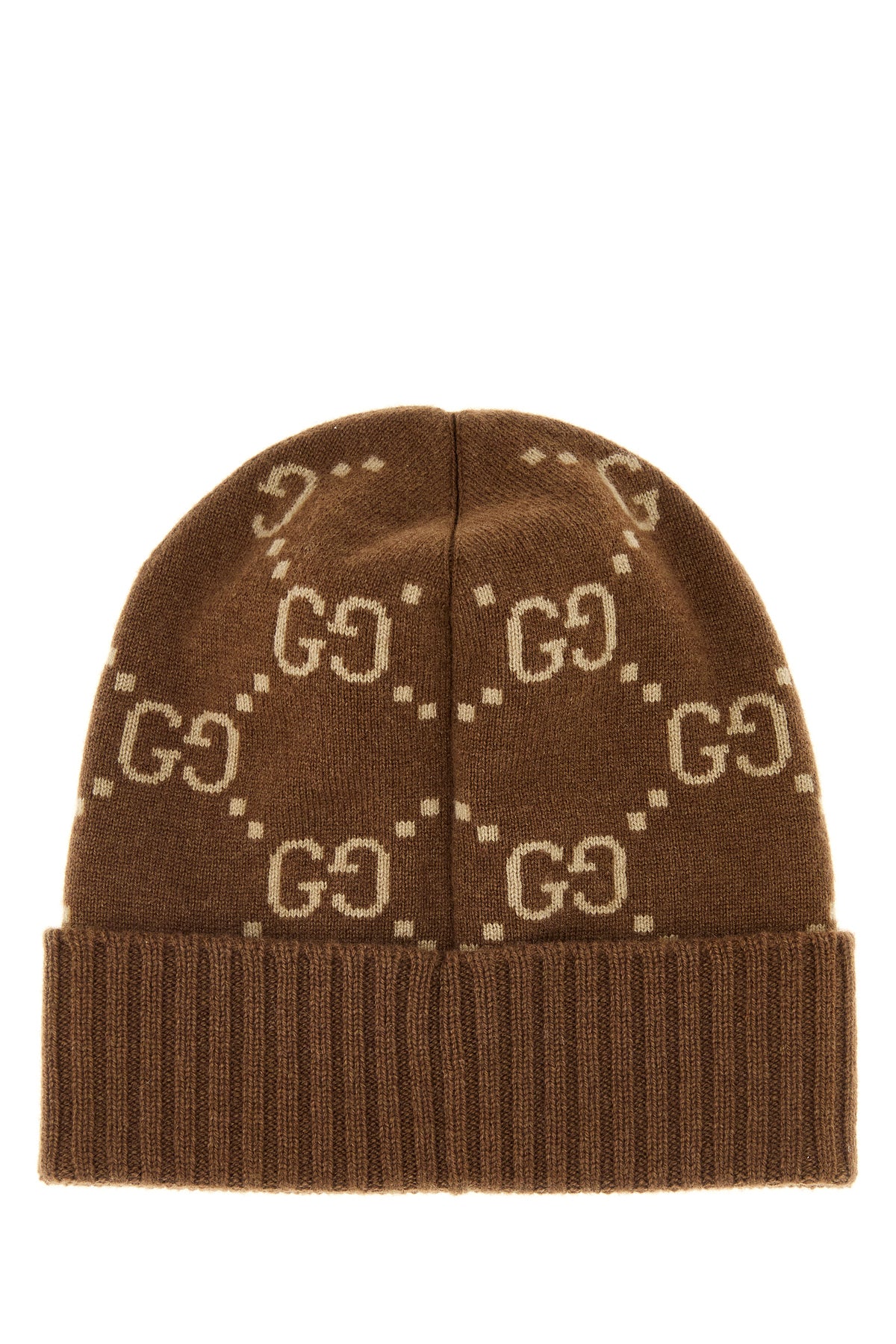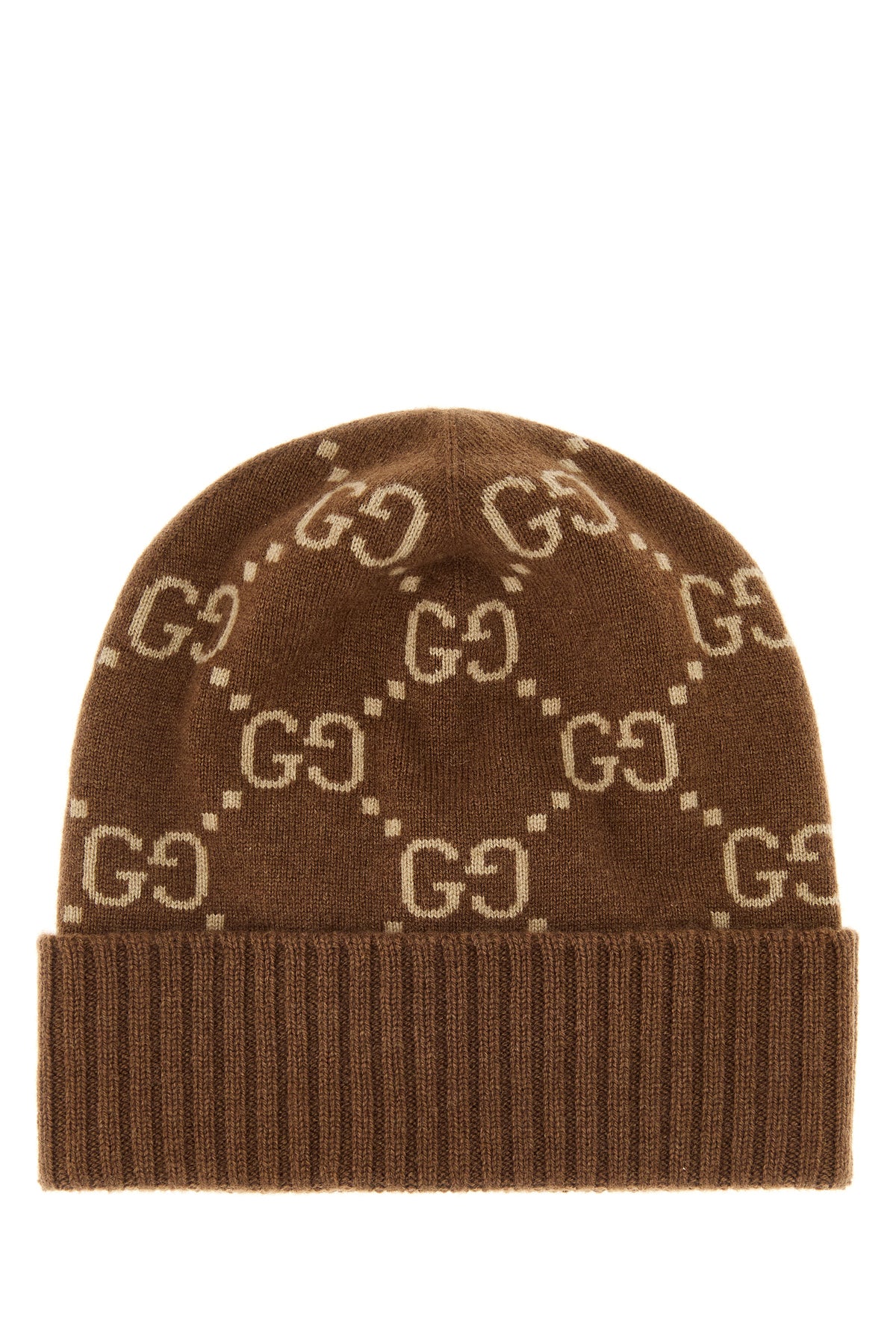 Beanie hat realized in pure cashmere characterized by GG motif embroidery on the entire surface.