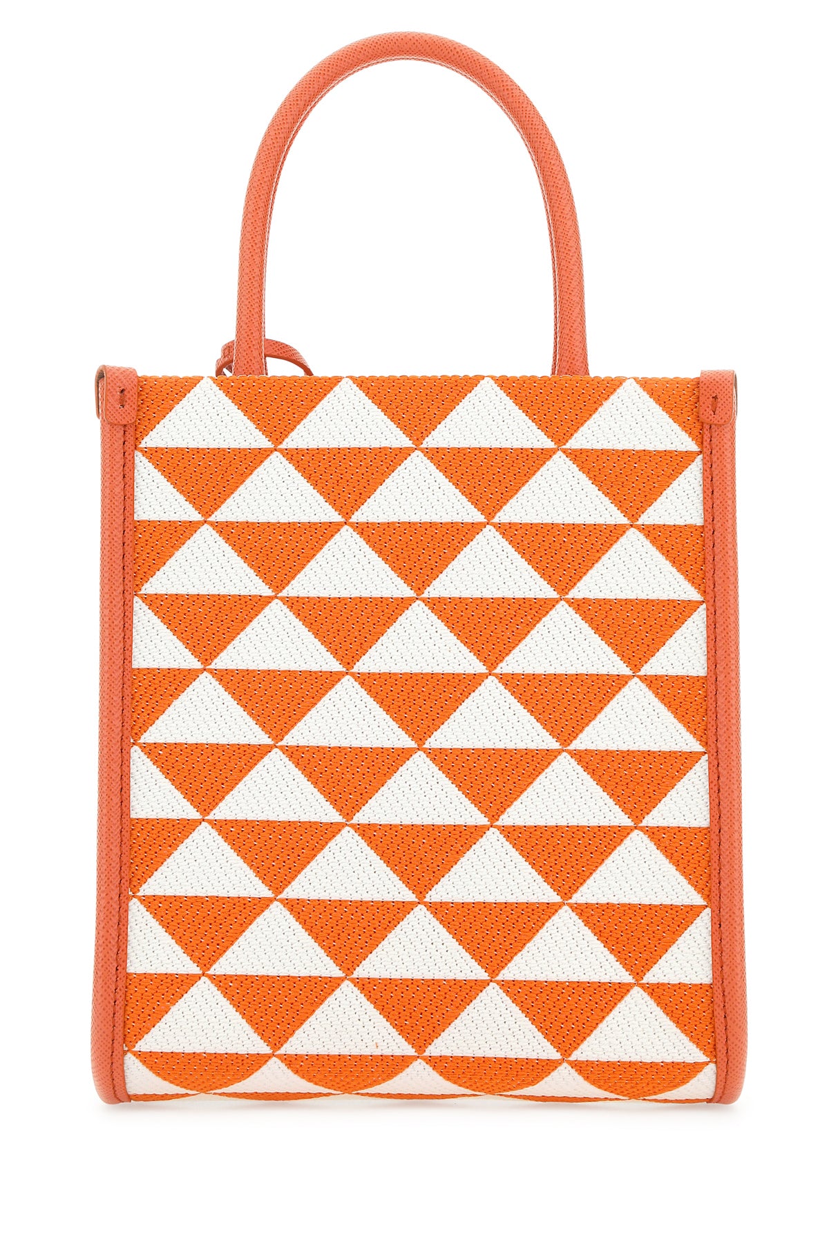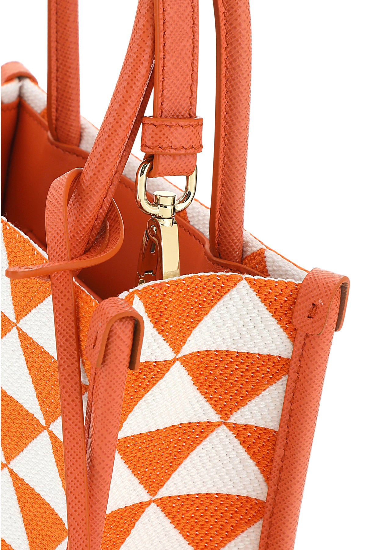 Handbag realized in fabric with Saffiano leather details enriched by iconic logoed triangle at the front.