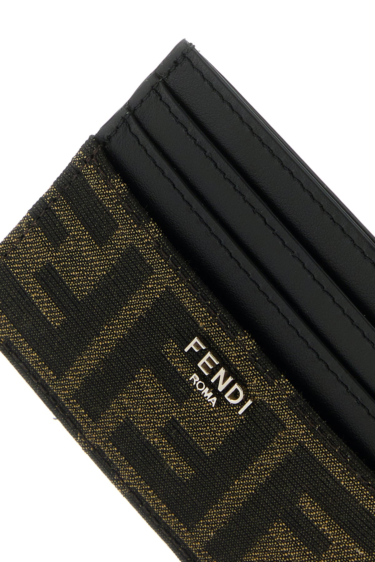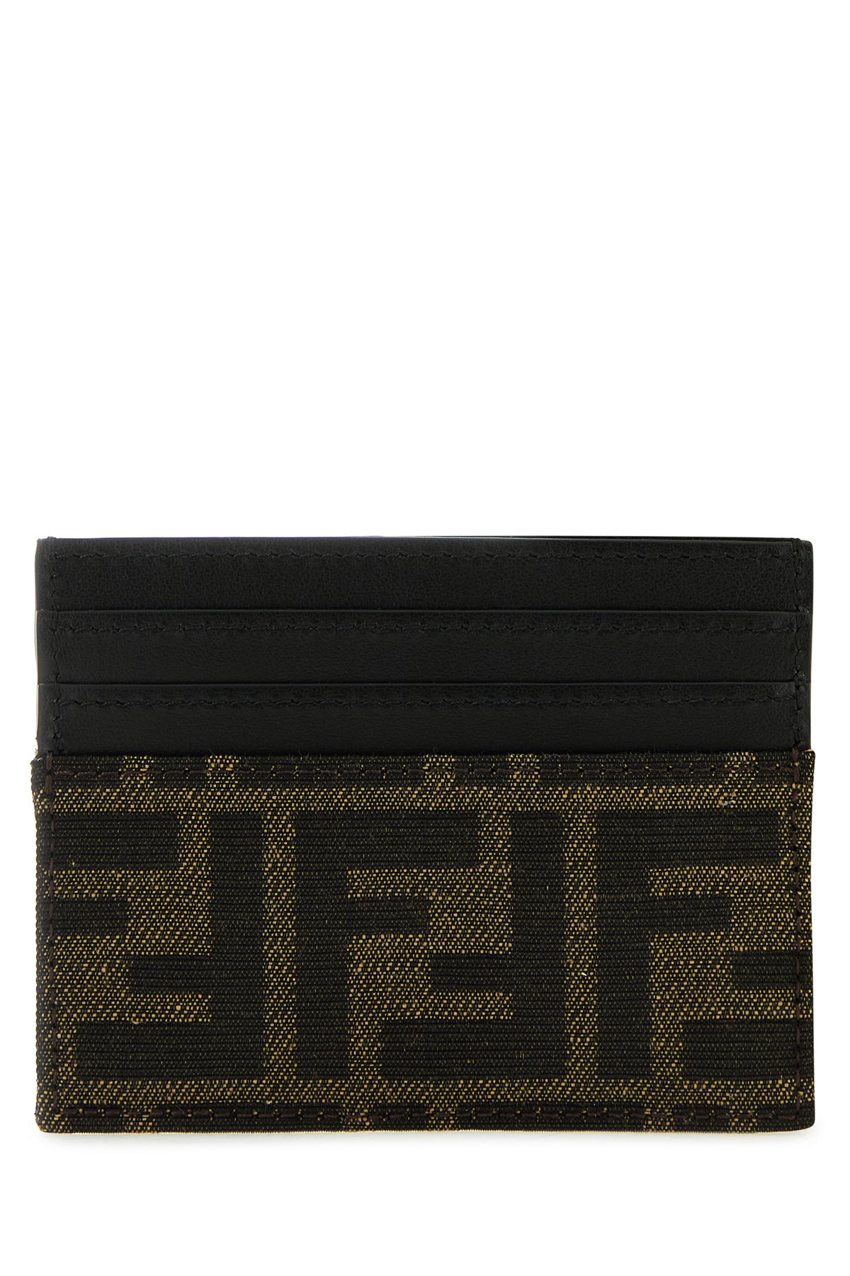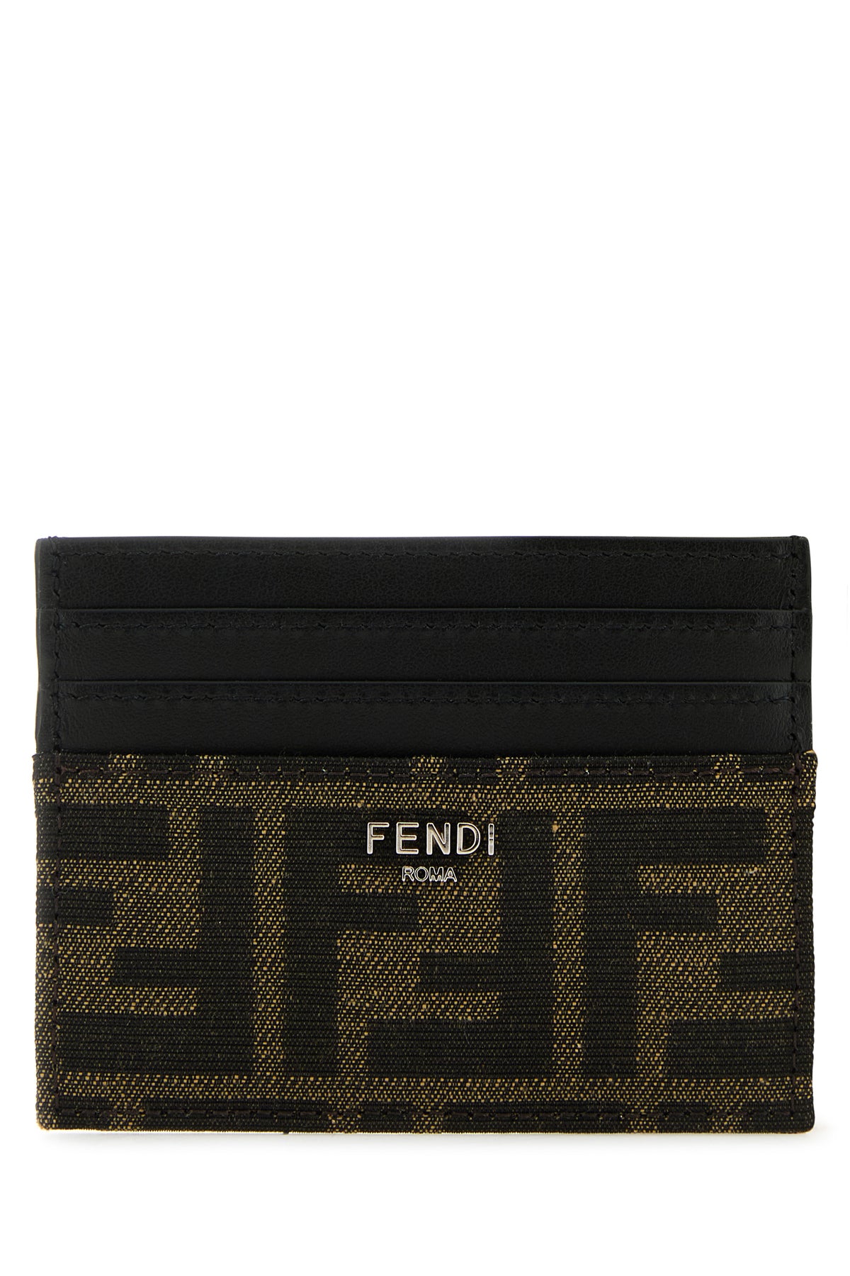 Card holder realized in jacquard with leather inserts characterized by FF motif embroidery enriched by metal lettering logo at the front.