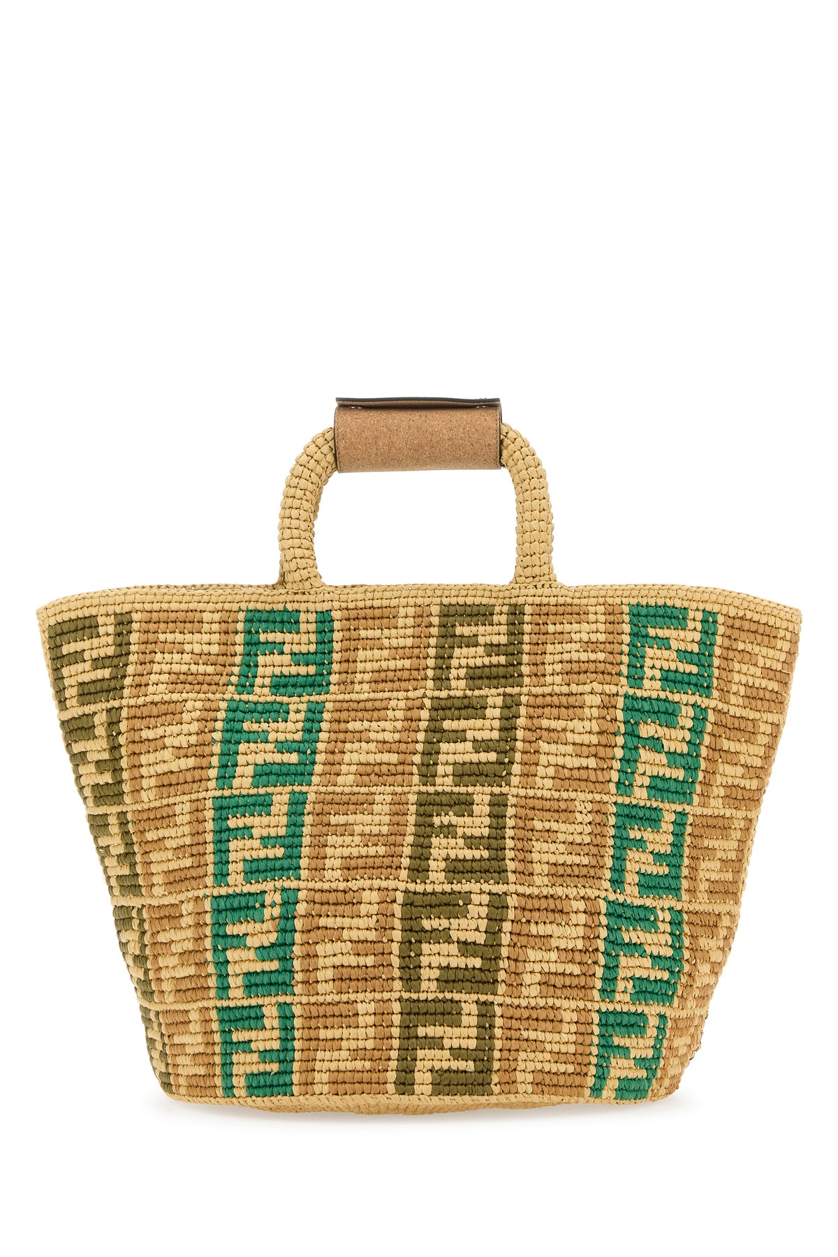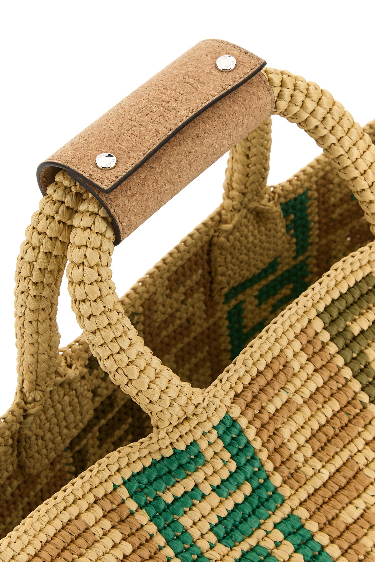 Shopping bag realized in woven raffia characterized by FF embroidery on the entire surface.