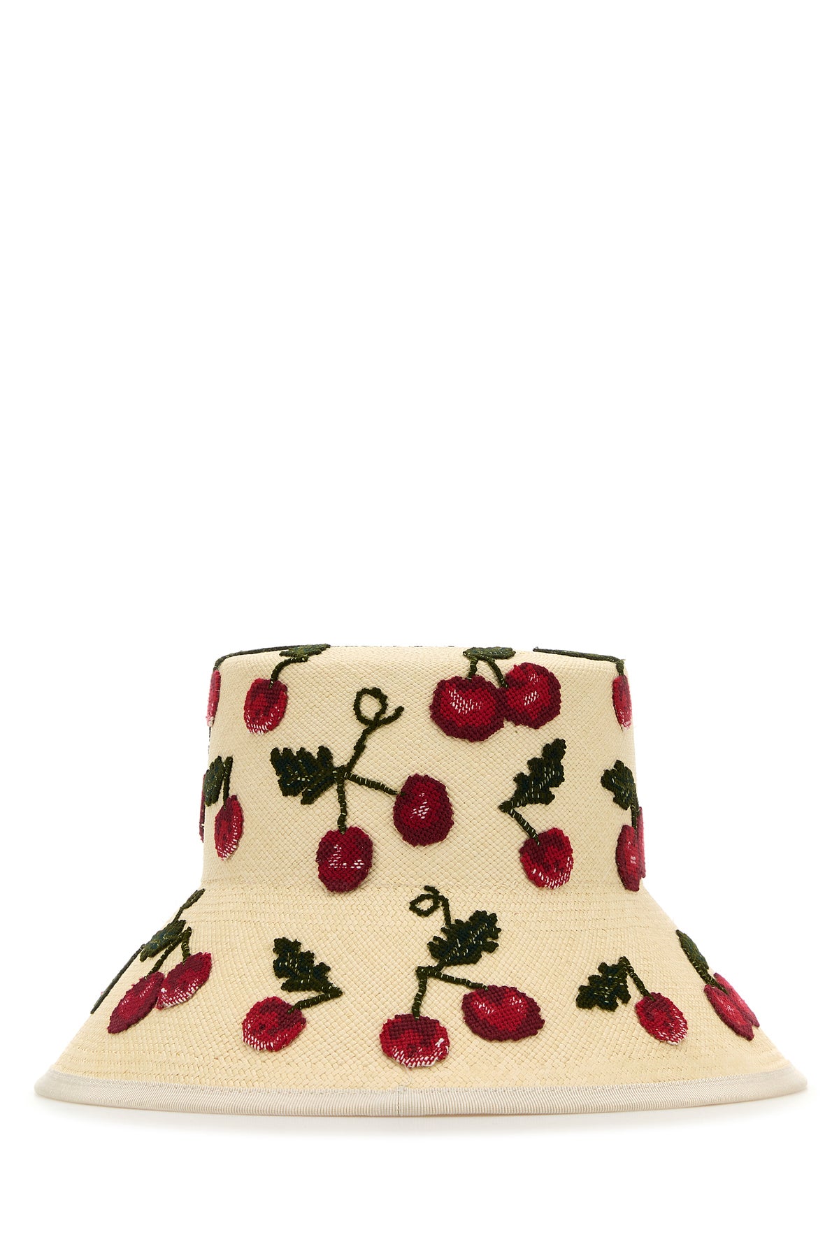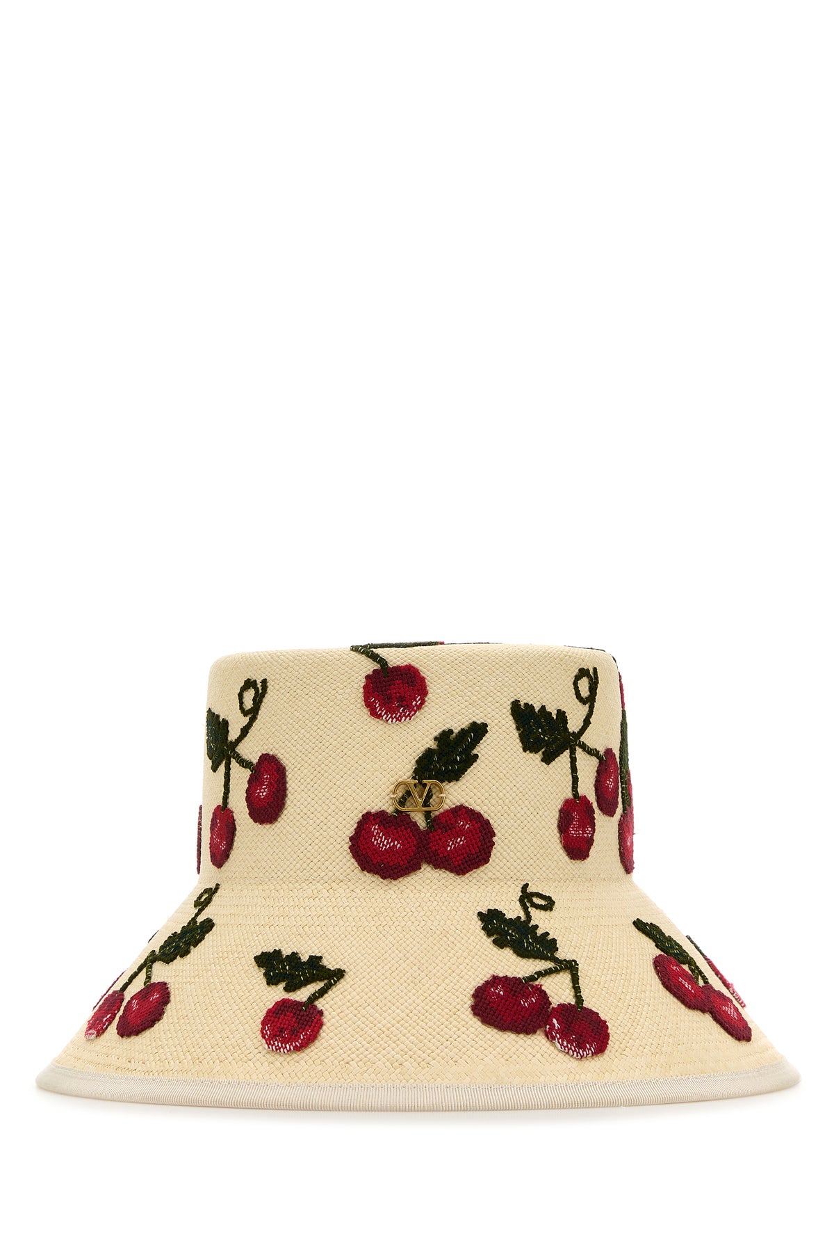 Hat realized in straw characterized by Cherryfic motif embroidery on the entire surface enriched by metal VLogo detail at the front.