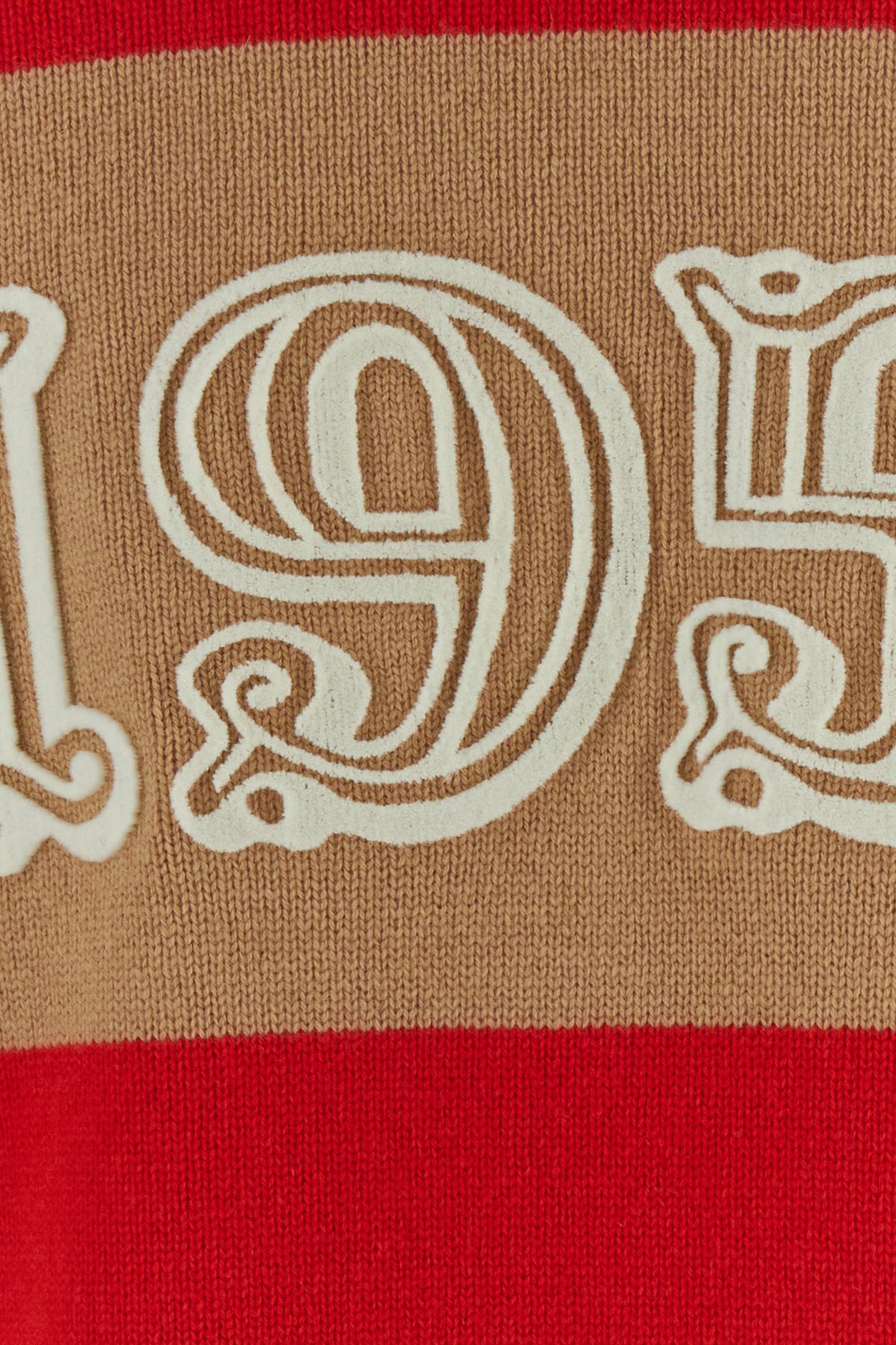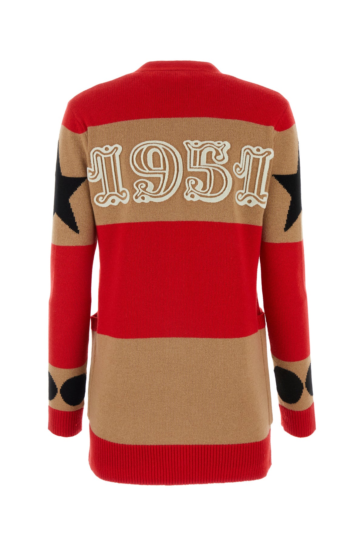 Cardigan realized in wool and cashmere characterized by peculiar striped embroidery on the entire surface, peculiar embroideries on the sleeves and flocked 1951 embroidery at the back.