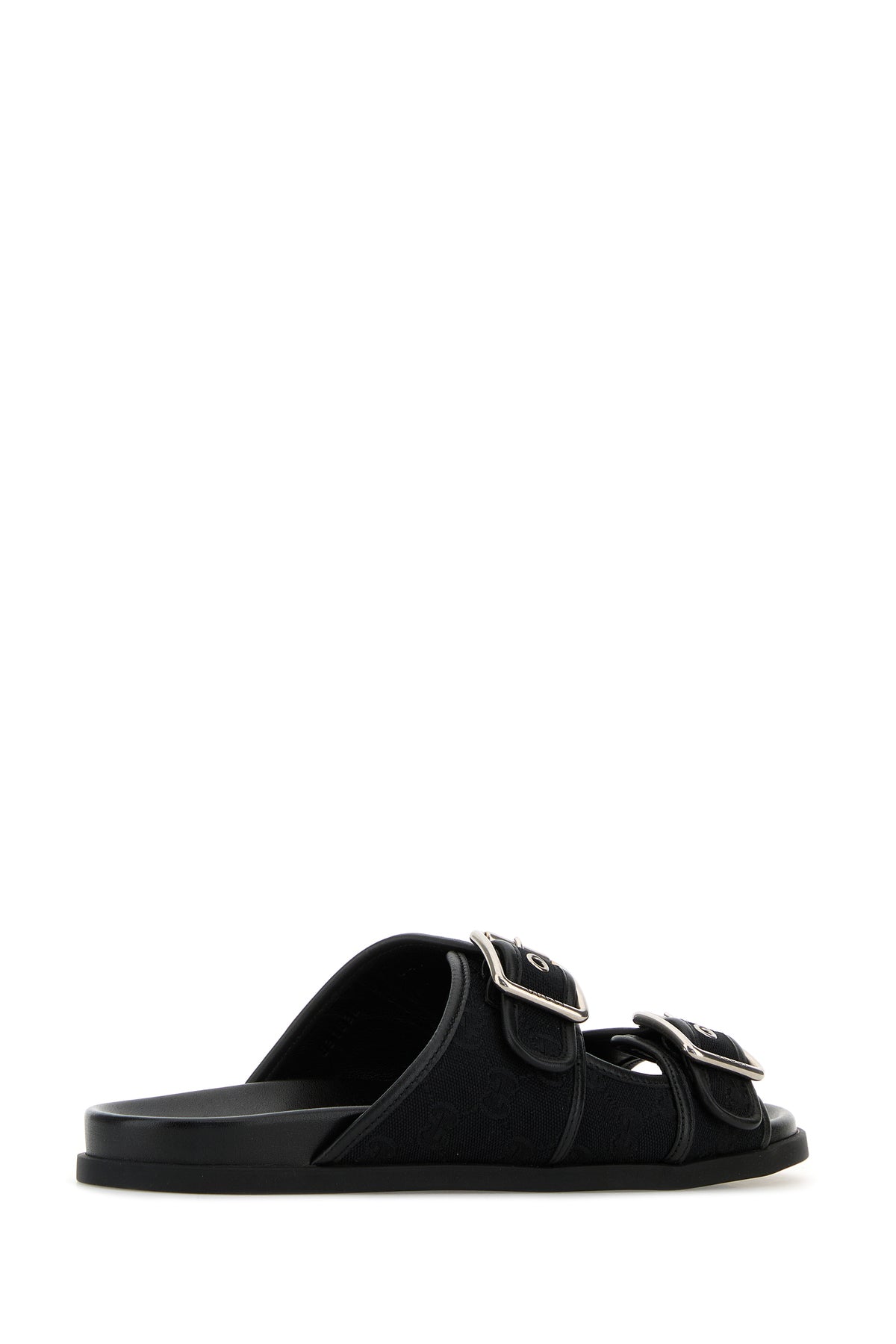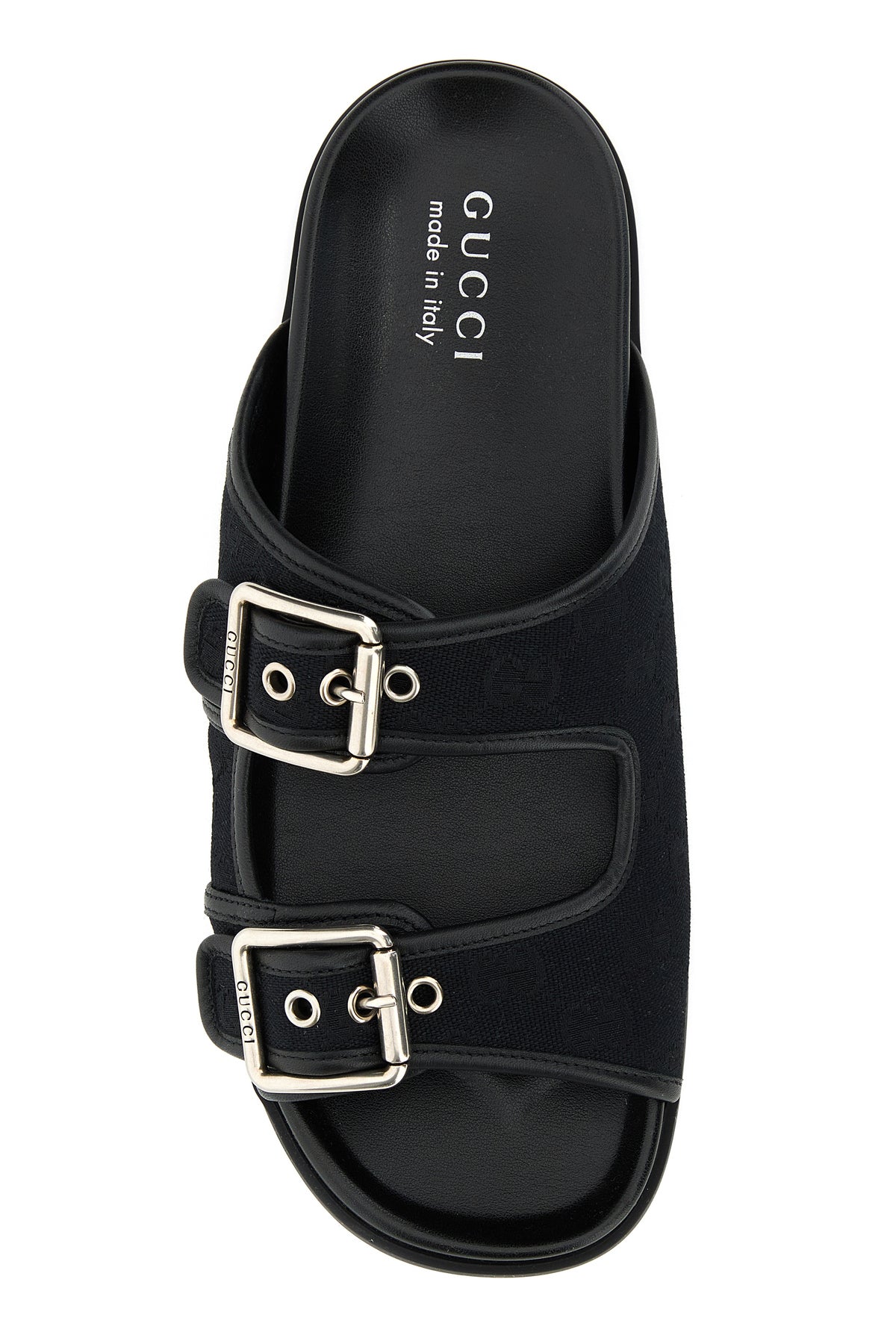 Slippers realized in GG fabric characterized by adjustable straps on the instep.