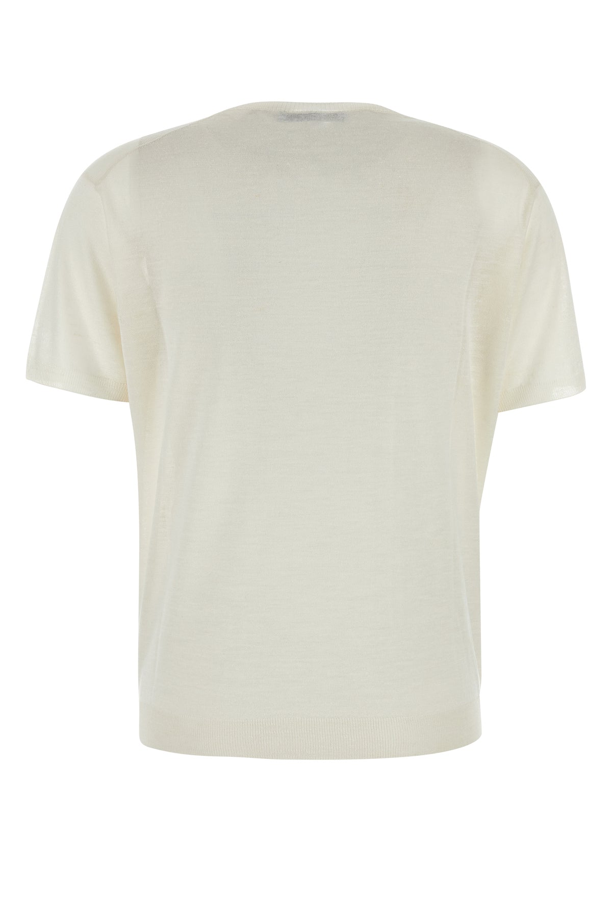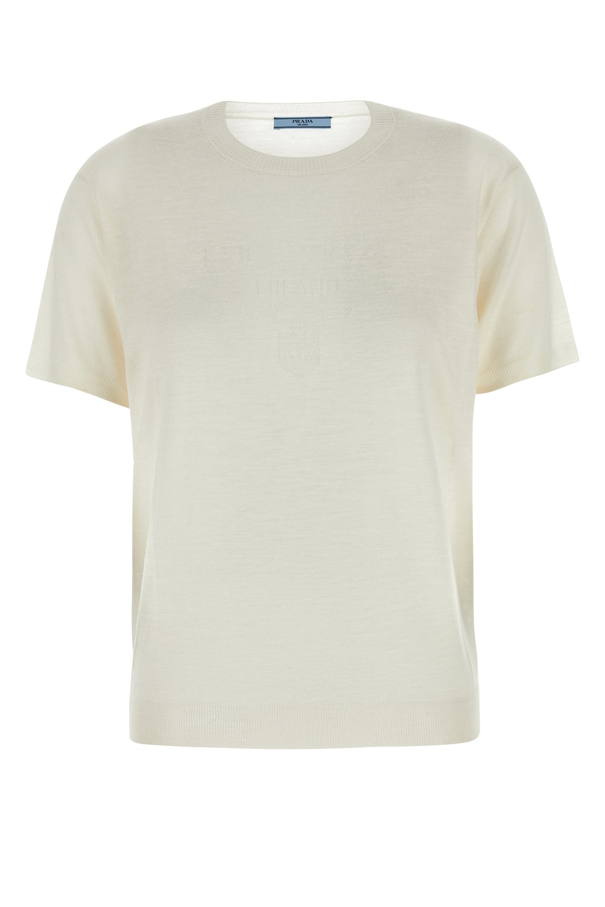 Short-sleeves sweater realized in pure cashmere enriched by iconic fabric triangle and tonal logoed label at the back.