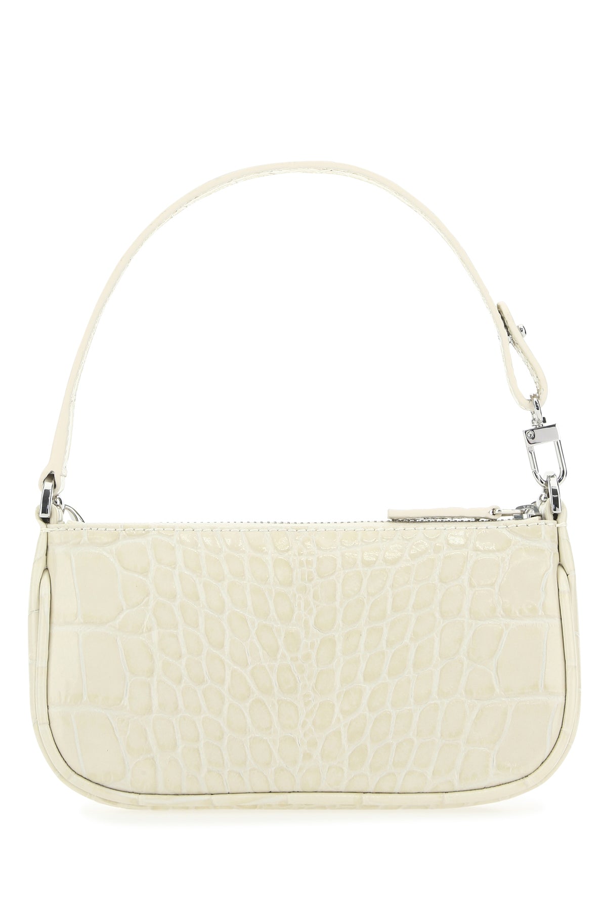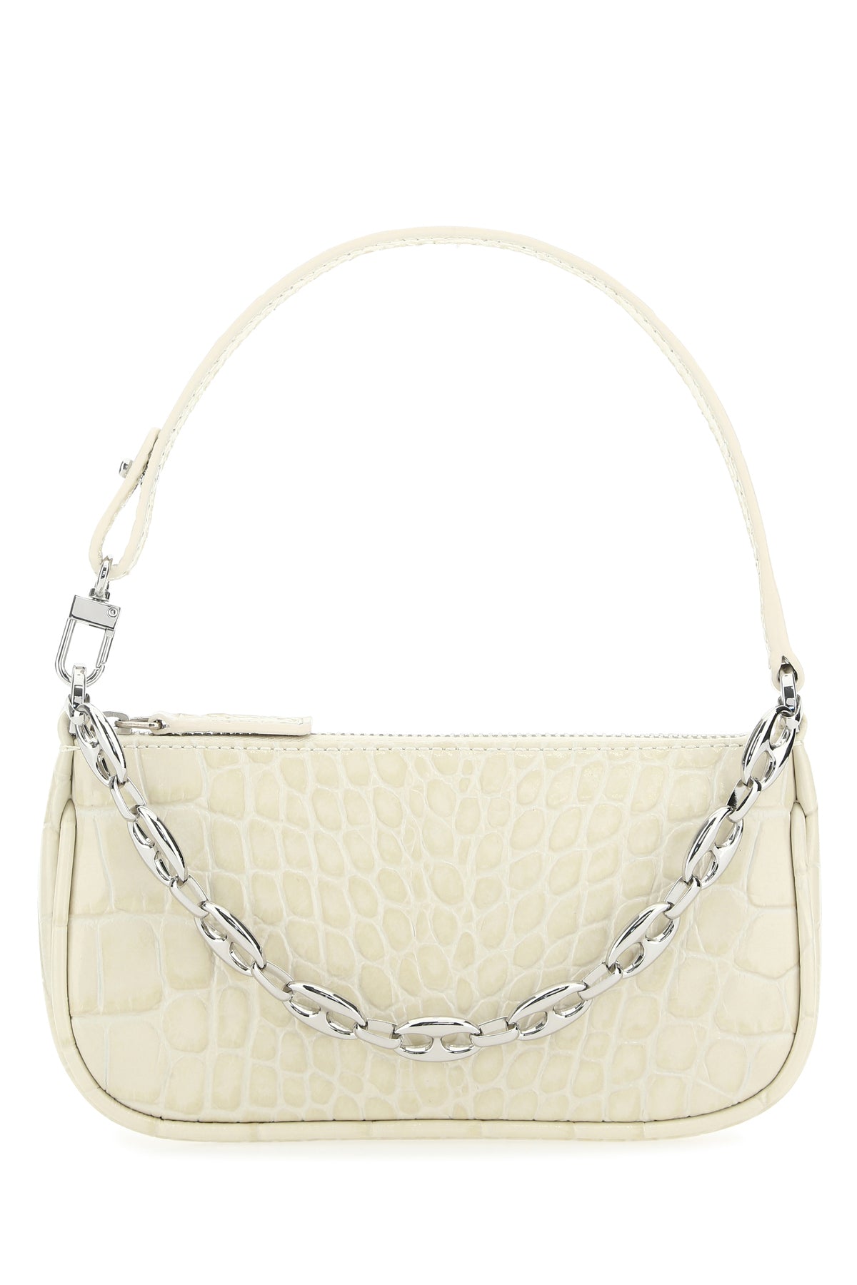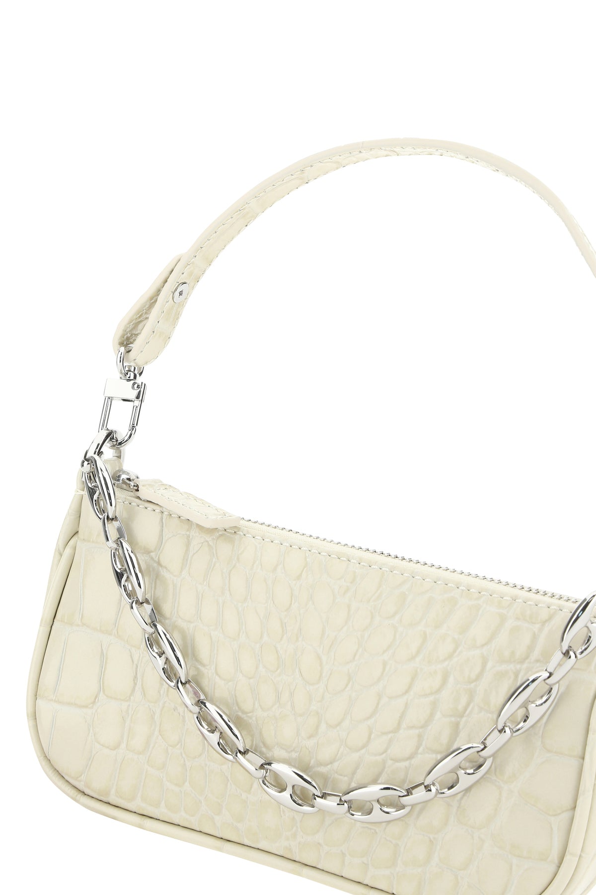 Handbag realized in crocodile motif embossed leather enriched by metal chain insert.