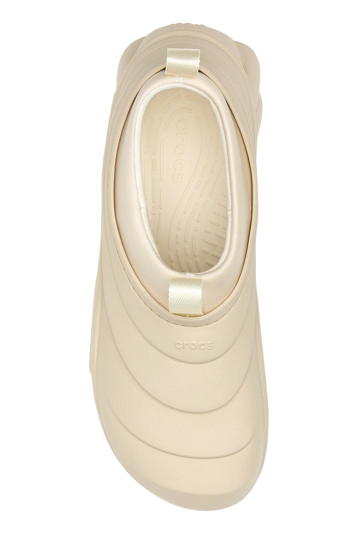 Slip ons realized in rubber with fabric insert on the ankle characterized by logo in relief on the instep.