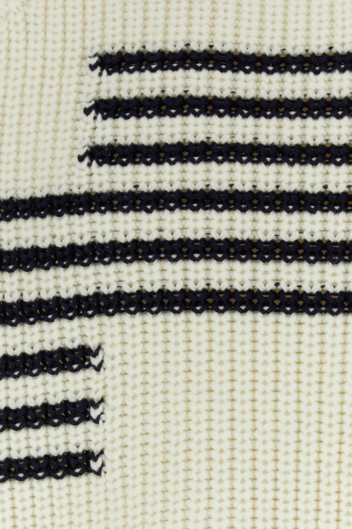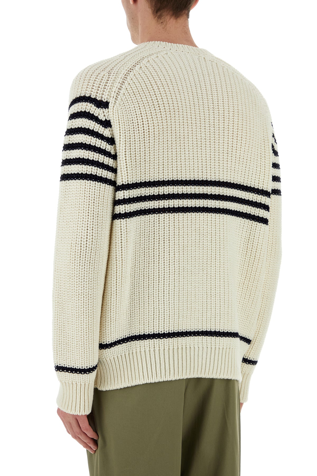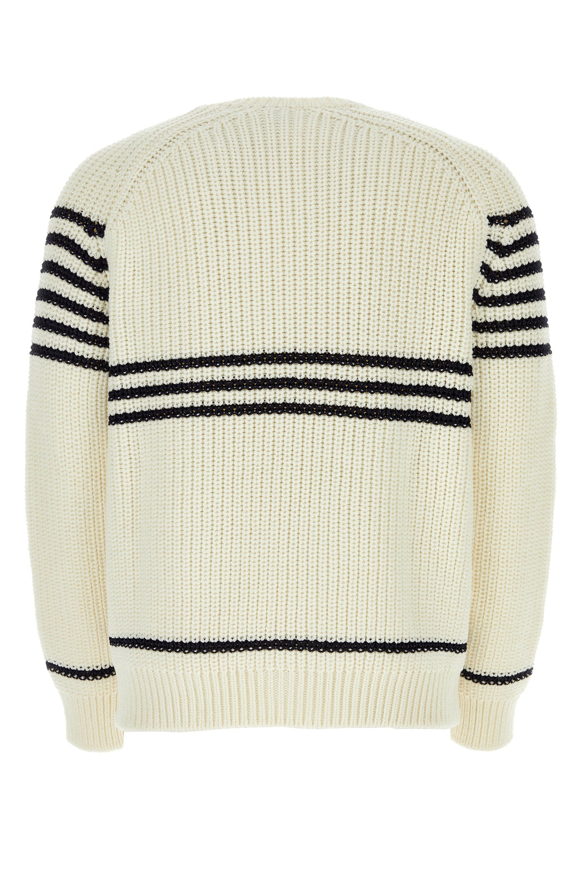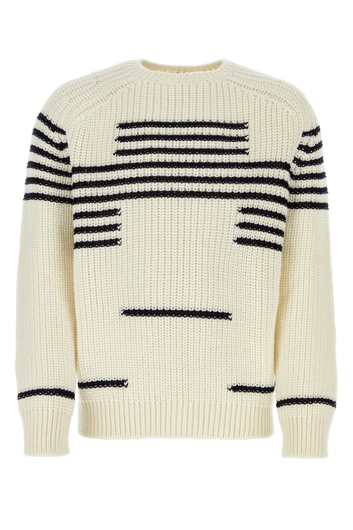 Sweater realized in wool blend characterized by striped embroidery at the front and at the back.