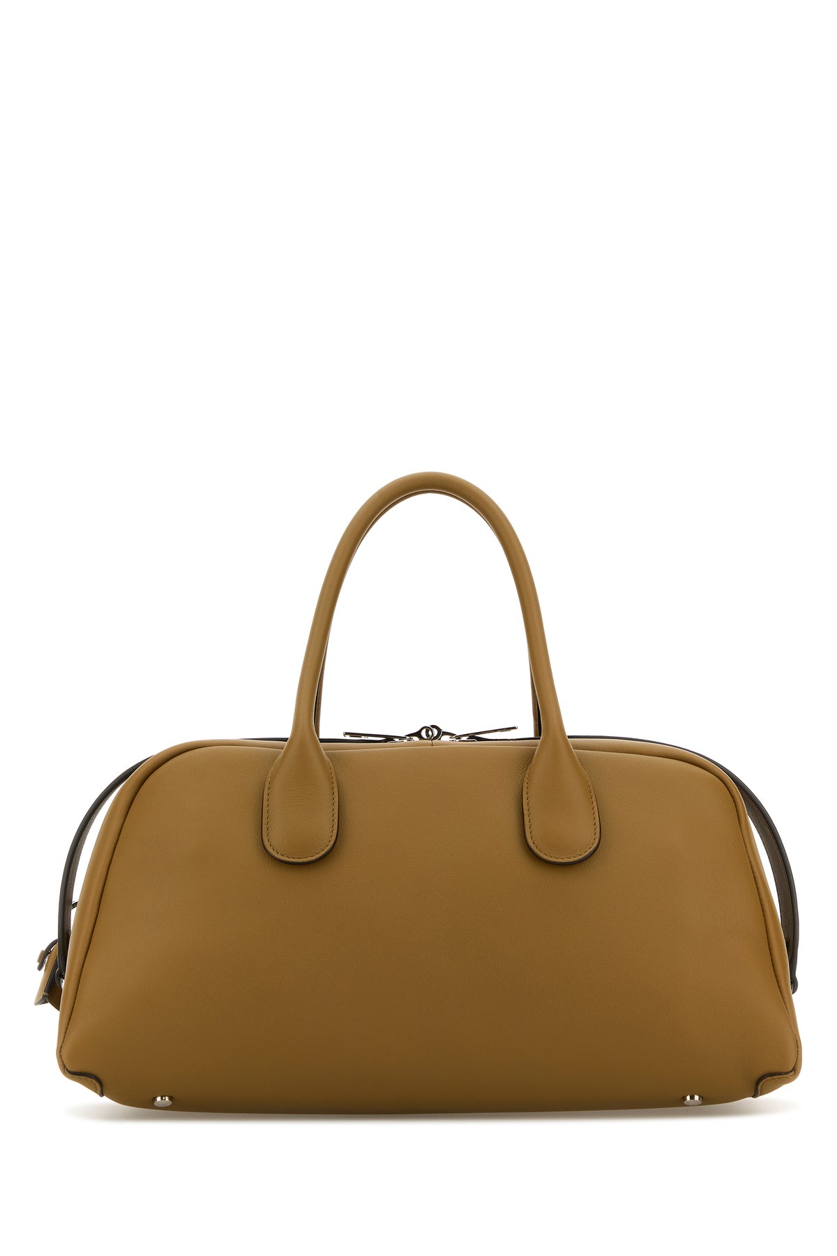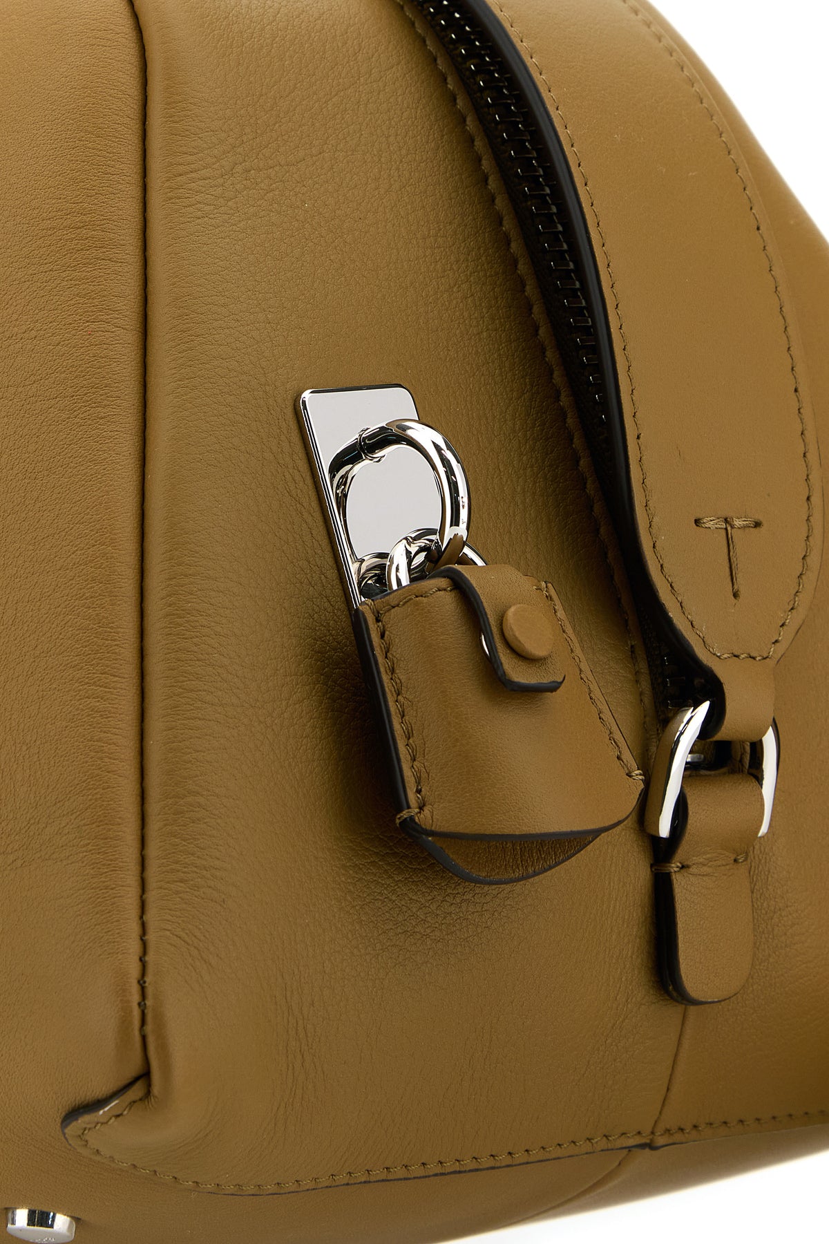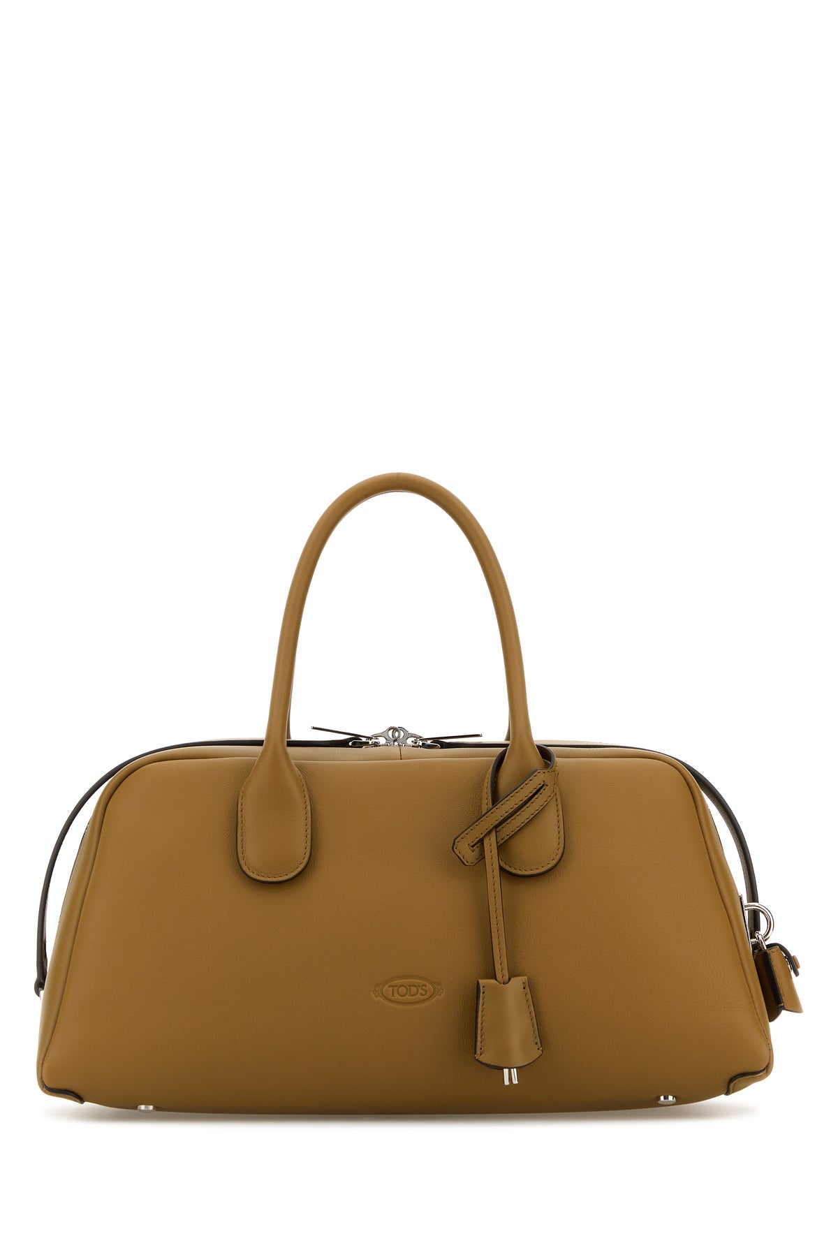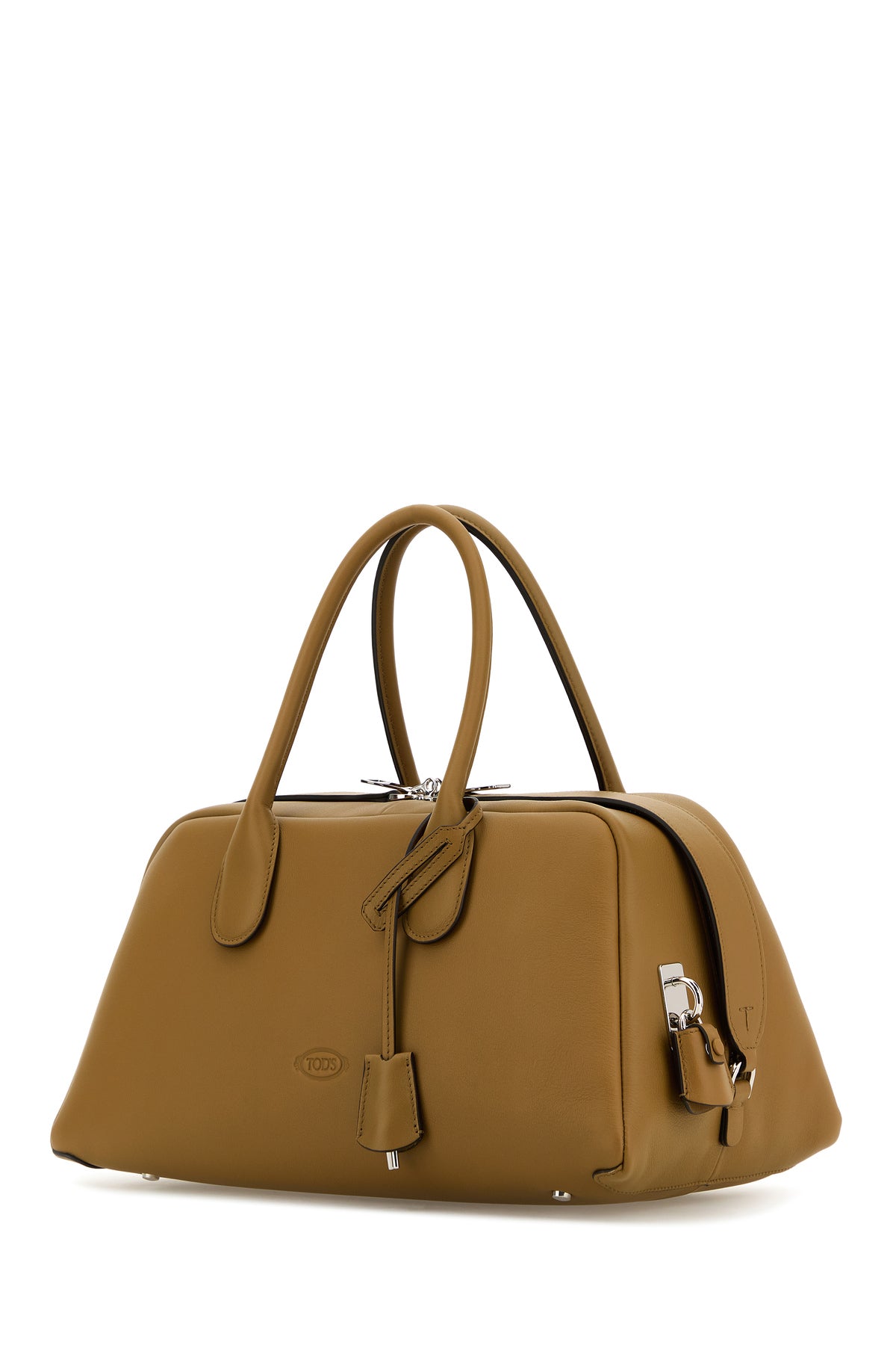 Handbag realized in slightly pebble leather characterized by embossed logo at the back enriched by detachable padlock and keys.