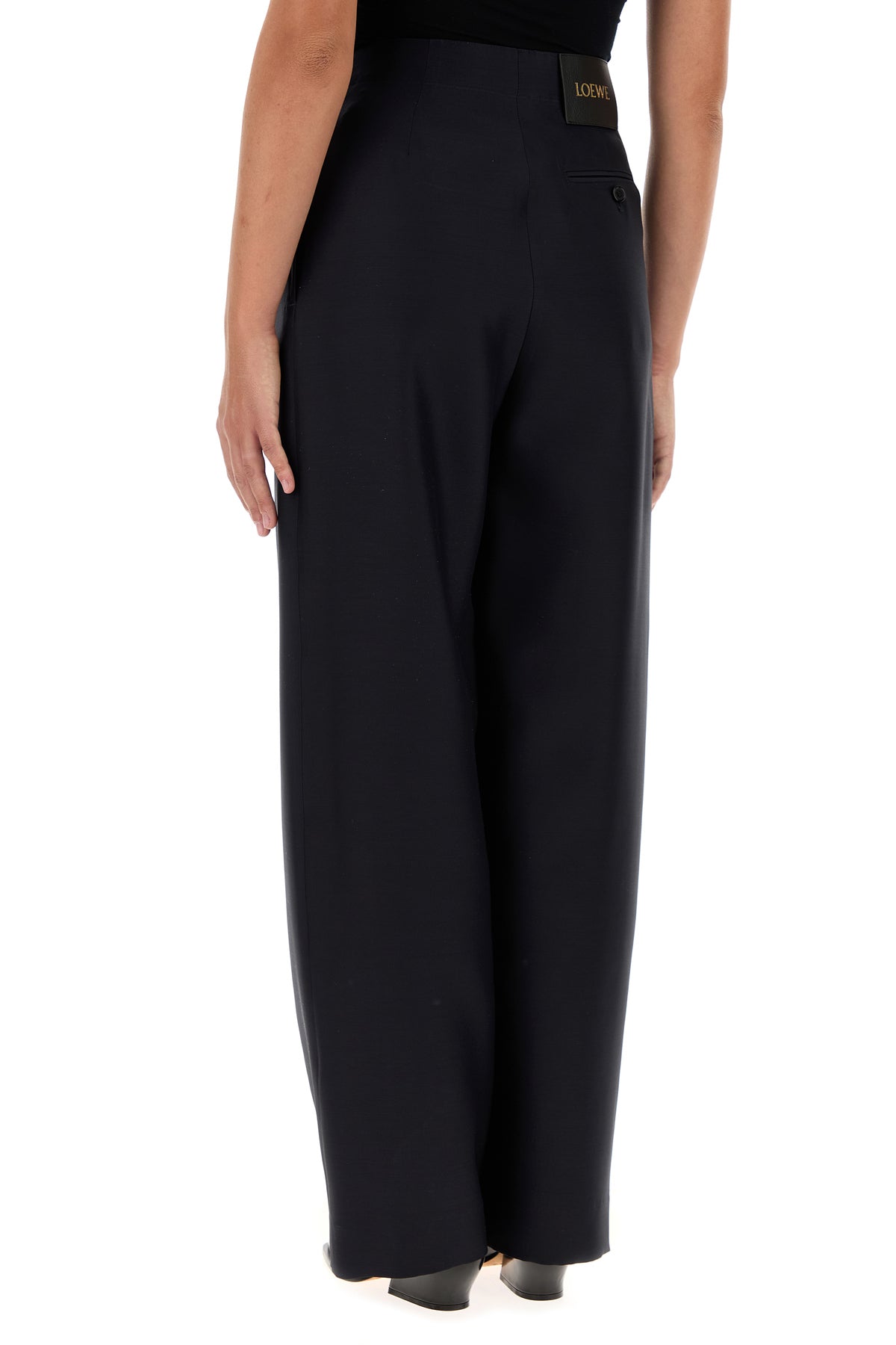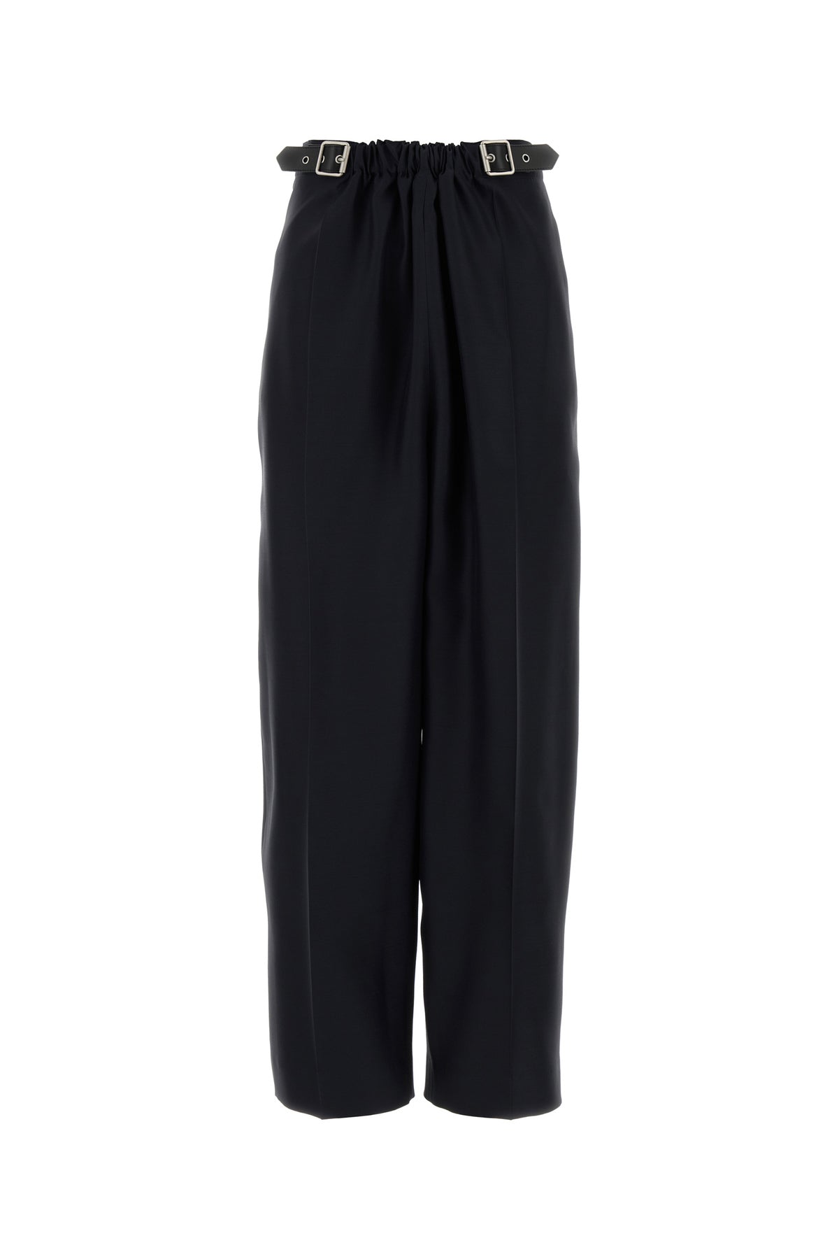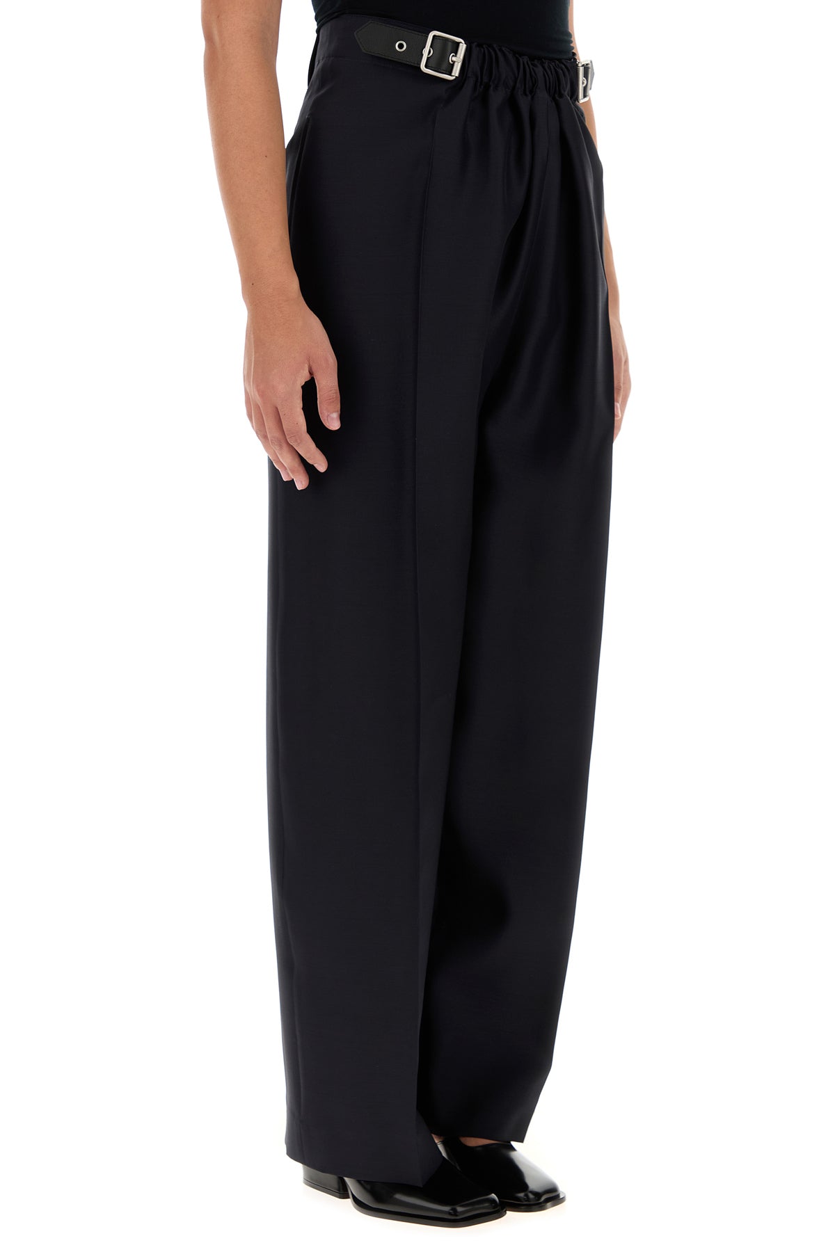 Wide-leg pant realized in wool and silk enriched by closure by adjustable leather straps at the waist.