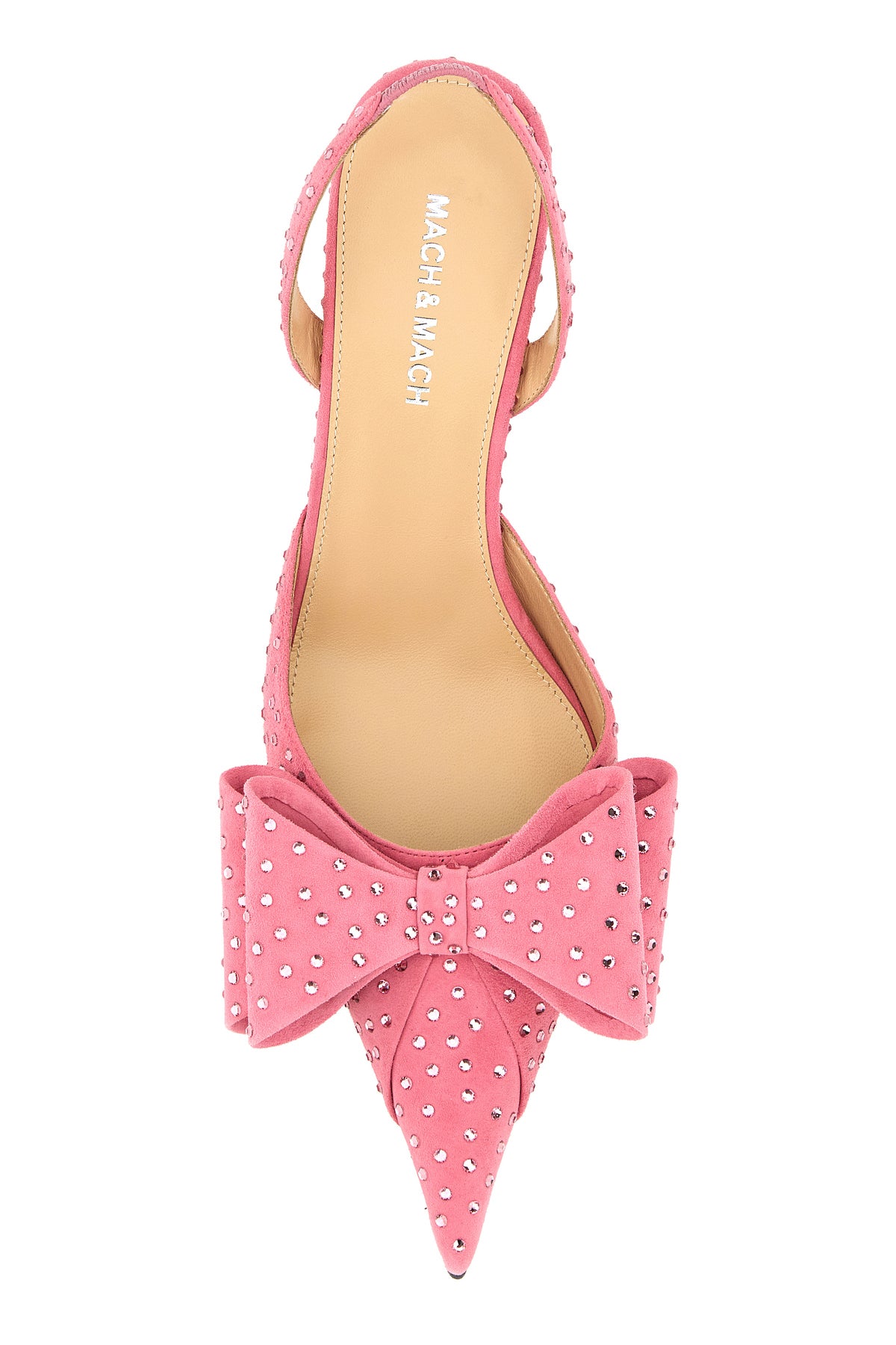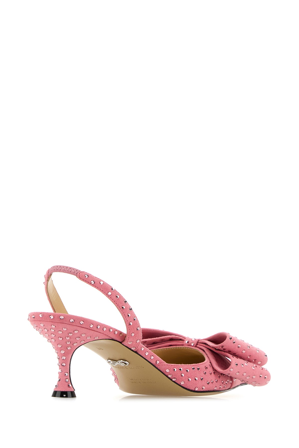 Slingback realized in suede entirely covered by rhinestones enriched by decorative bow on the instep.