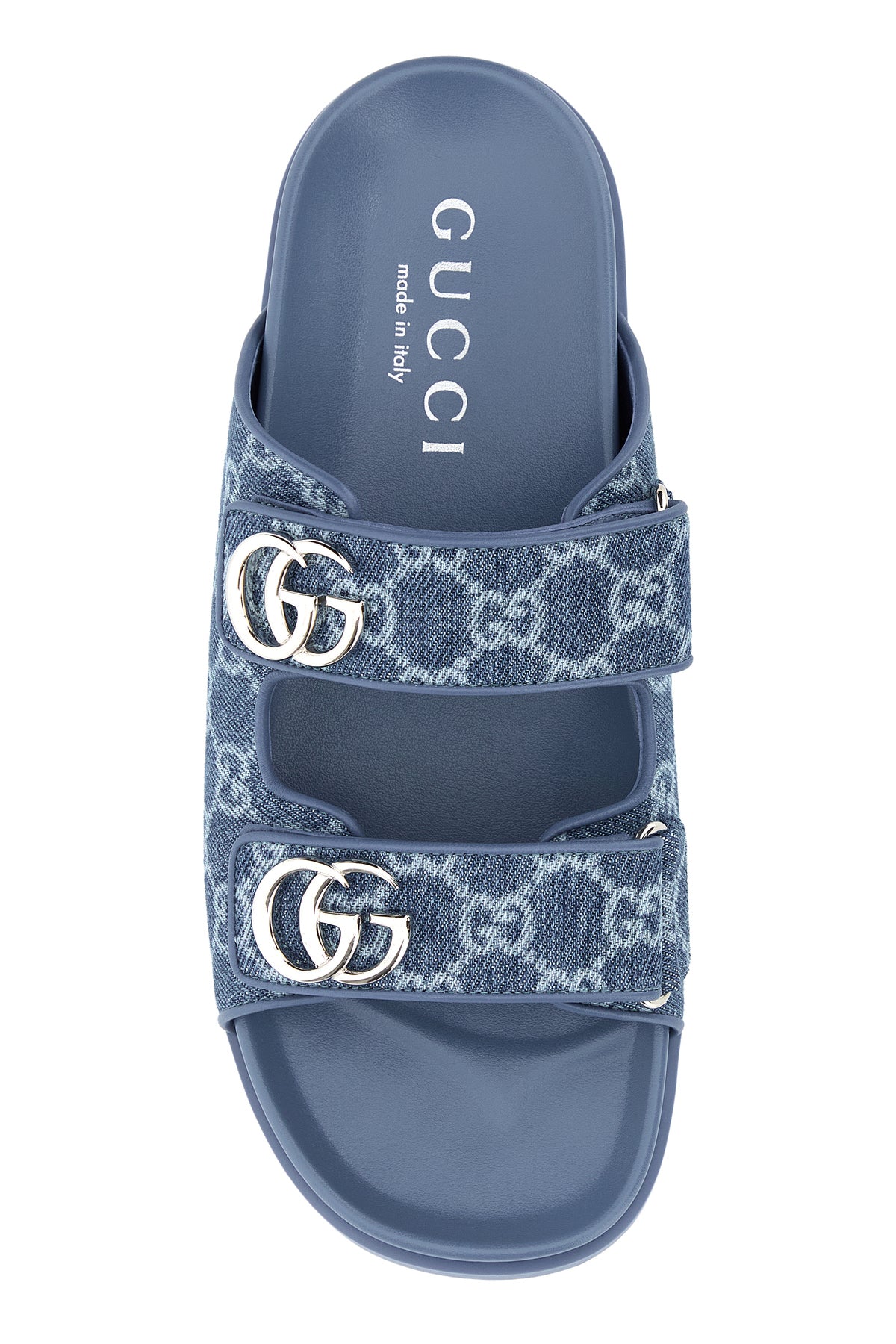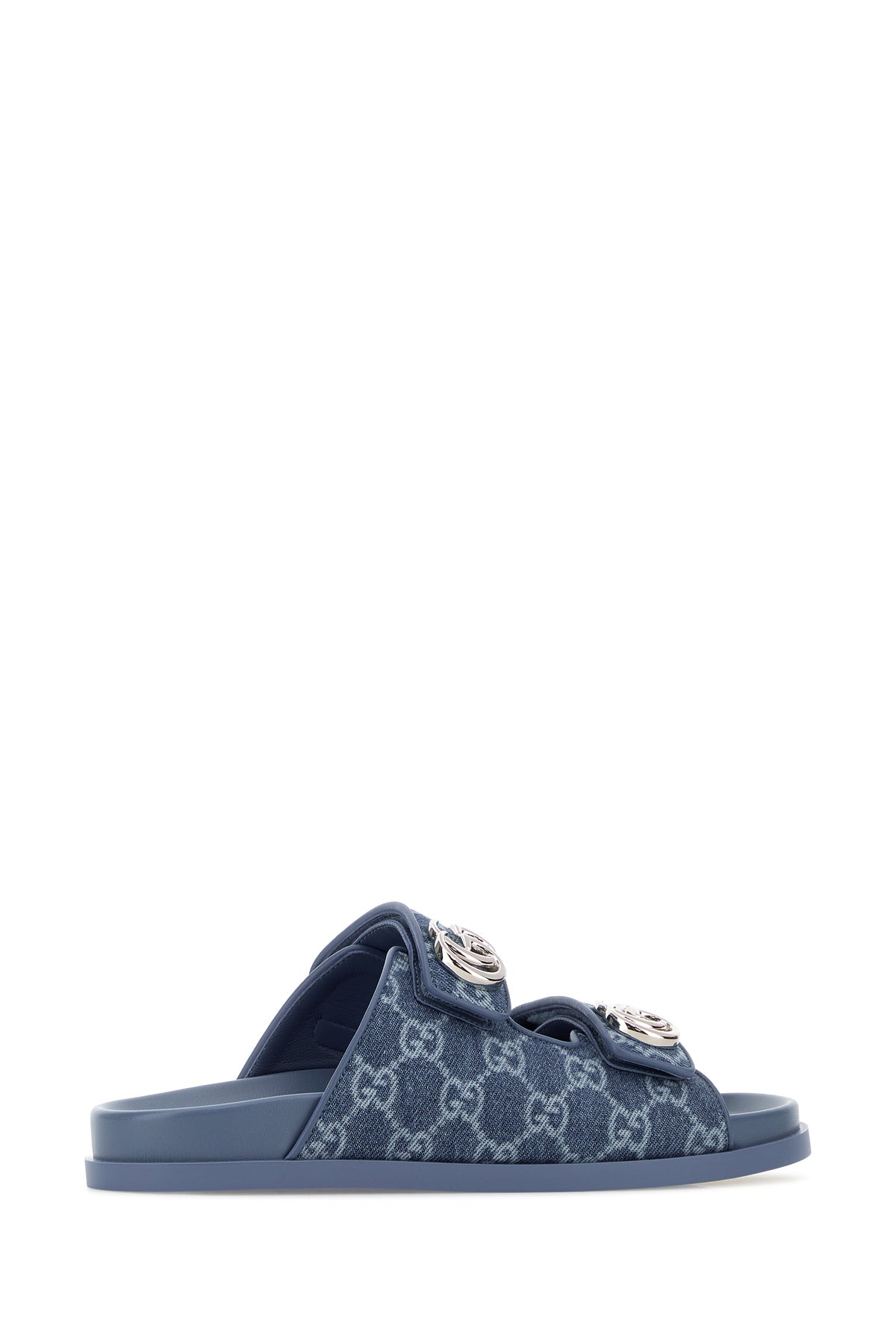 Slippers realized in denim characterized by GG print enriched by GG metal detail on the instep.