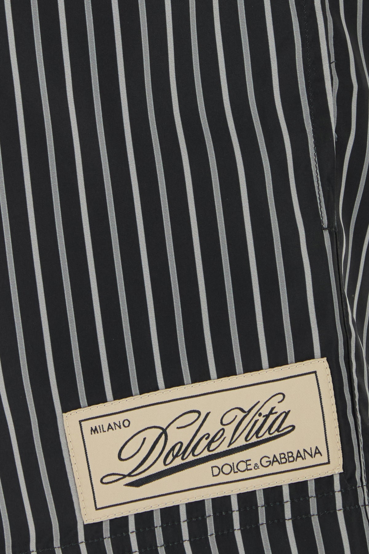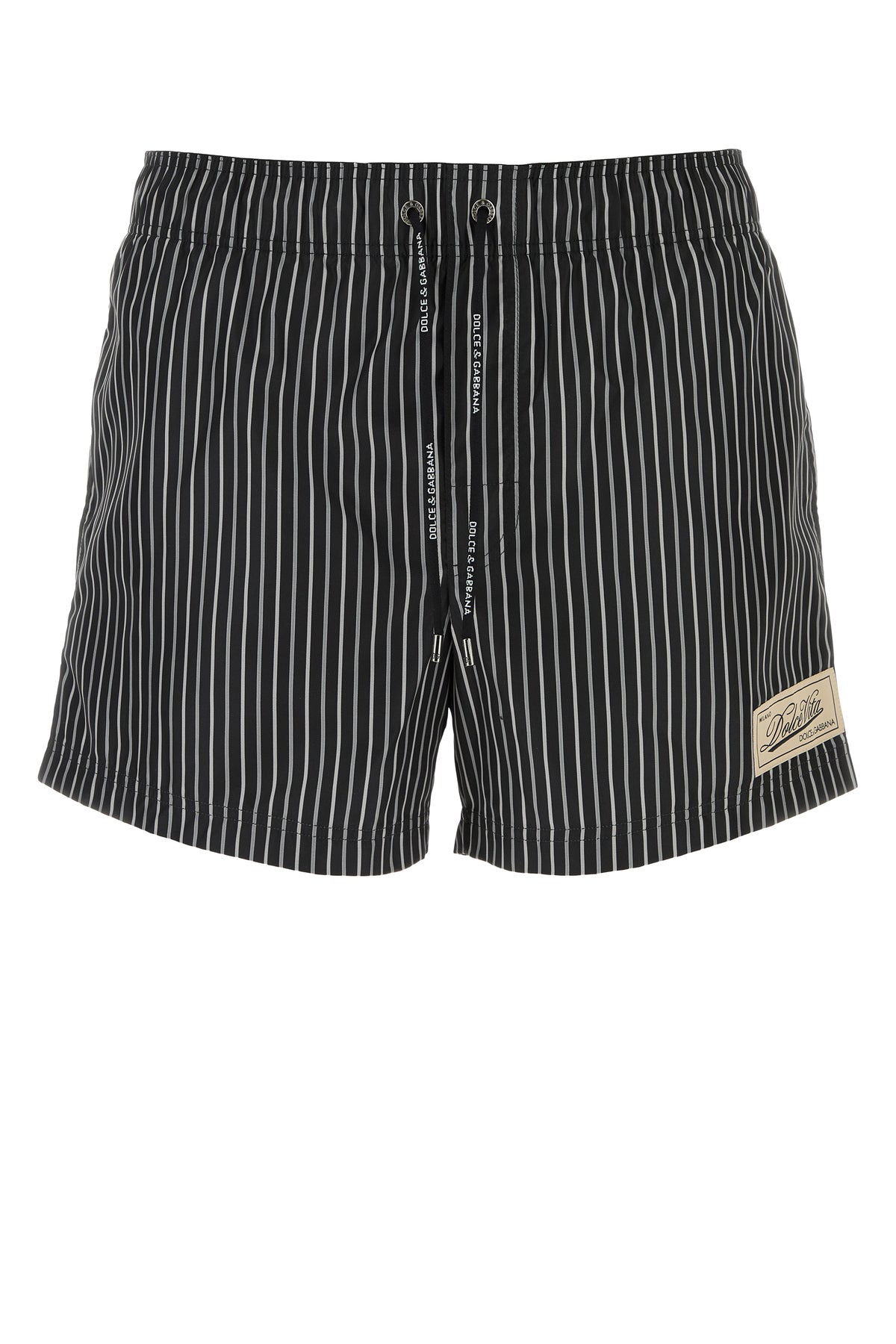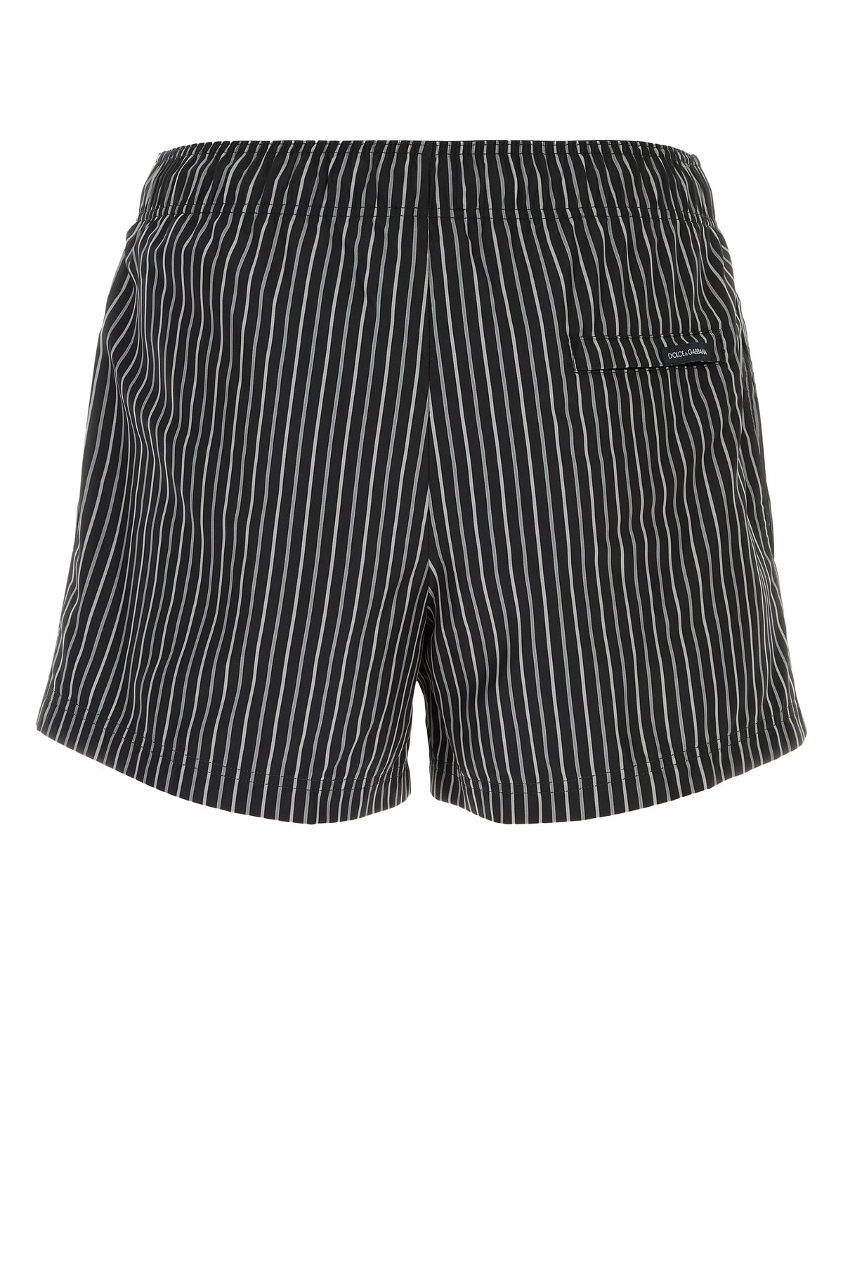 Swimming shorts realized in polyester characterized by striped print on the entire surface enriched by logoed label on the hemline.
