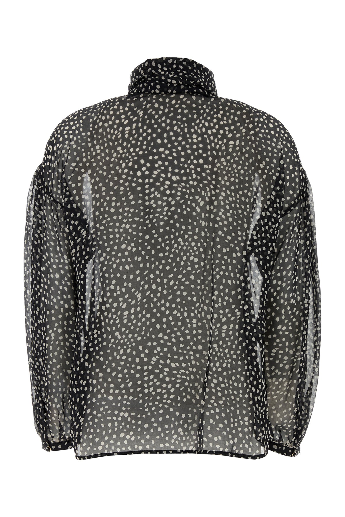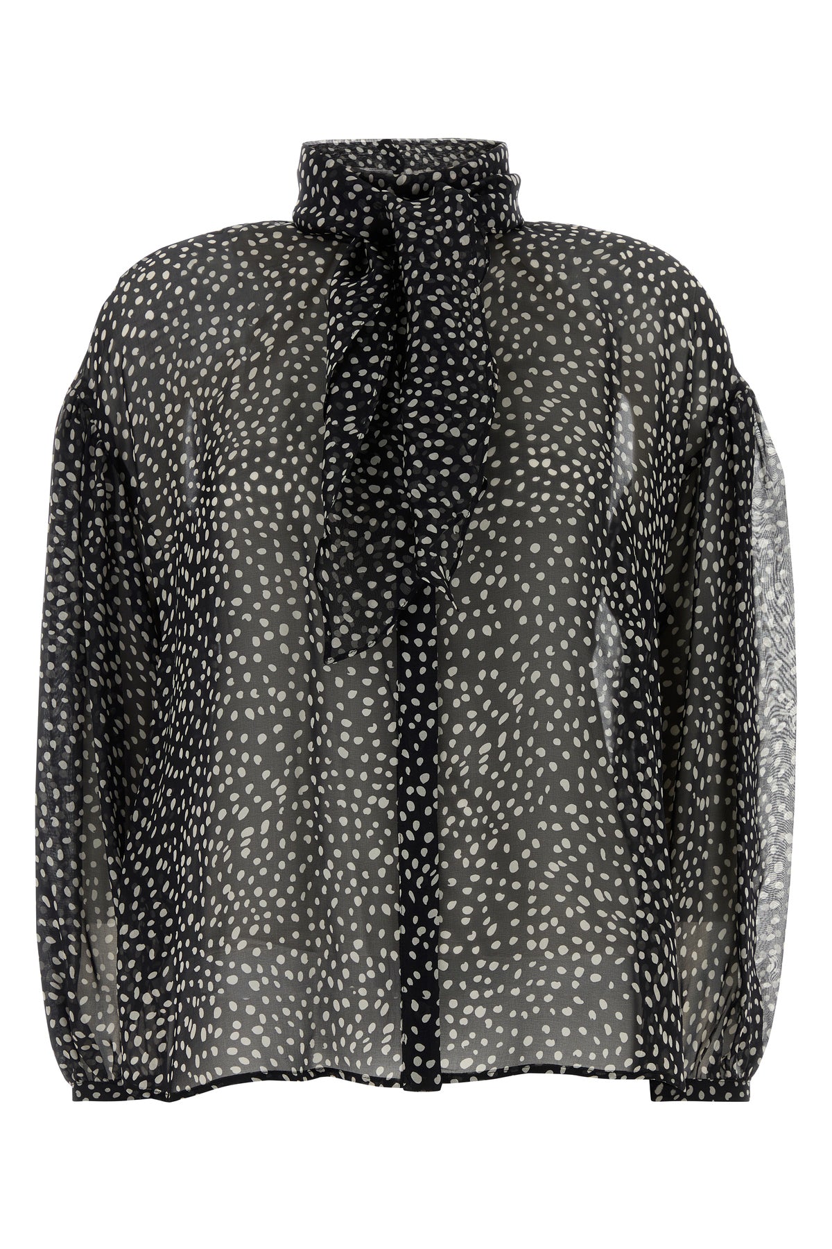 Semi-transparent blouse realized in pure silk characterized by peculiar print on the entire surface.