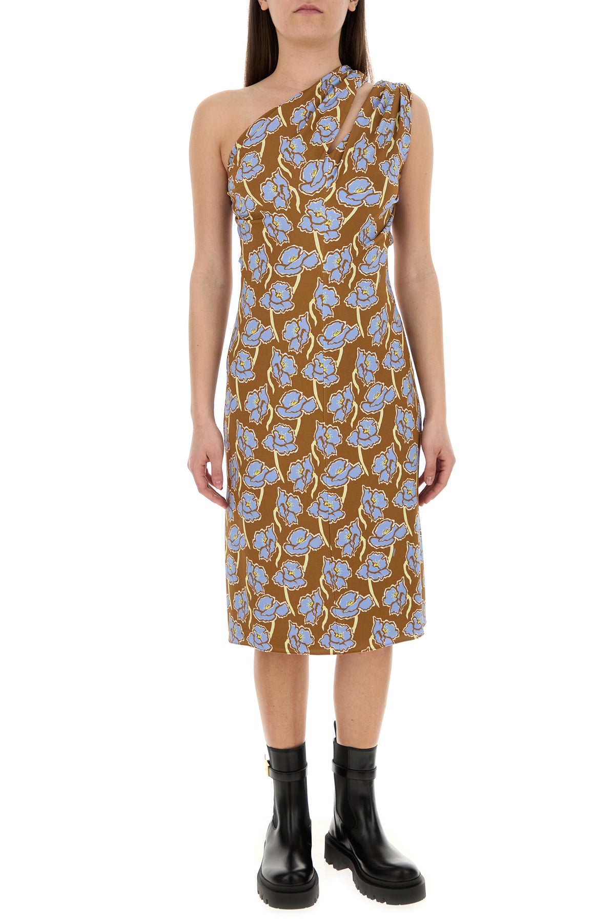 One-shoulder dress realize in stretch viscose crepe characterized by Poppies print on the entire surface.