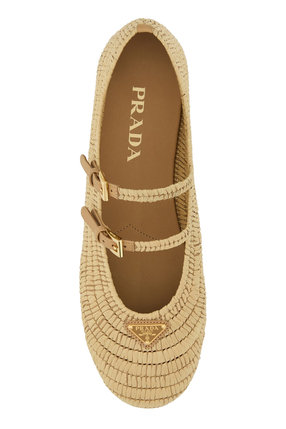 Ballerinas realized in raffia enriched by iconic logoed metal triangle on the toe.