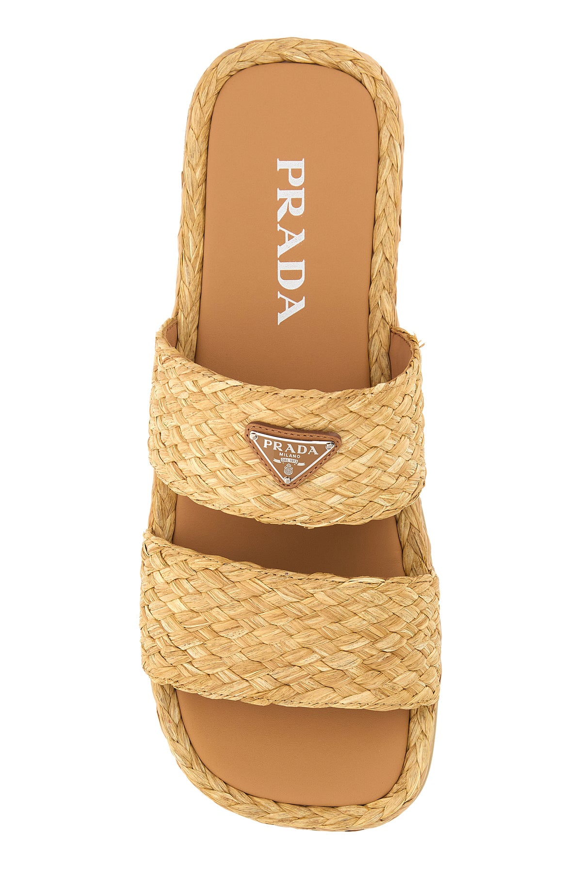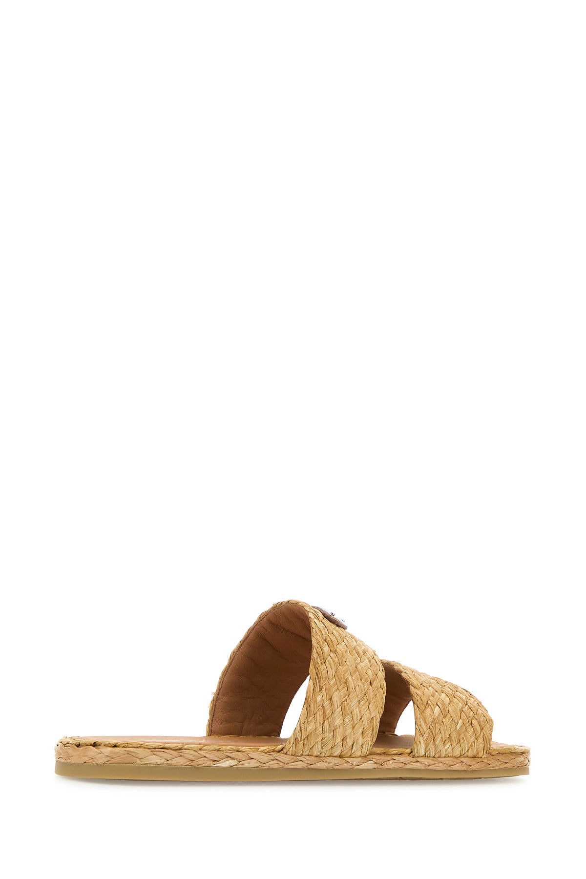 Slippers realized in raffia enriched by iconic logoed metal triangle on the instep.