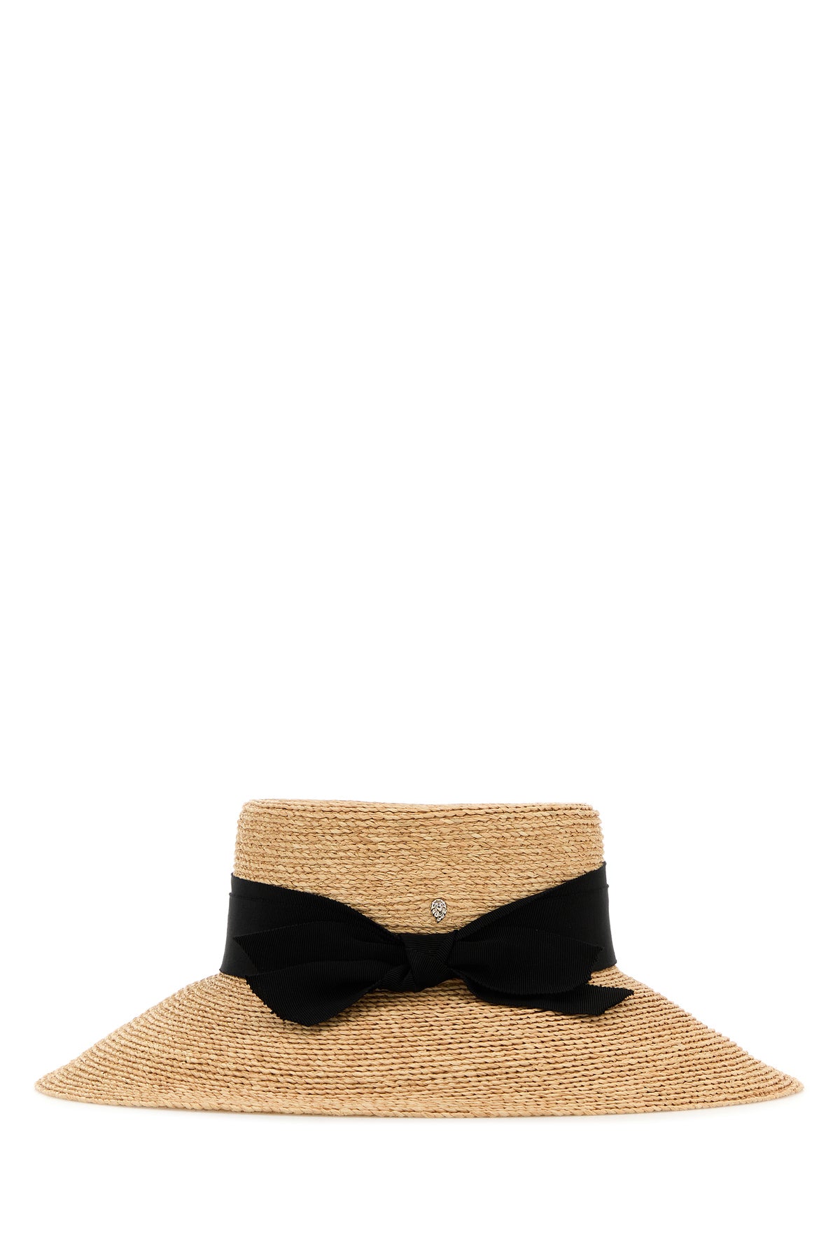 Hat realized in raffia enriched by band with decorative bow and logoed metal detail on the side.