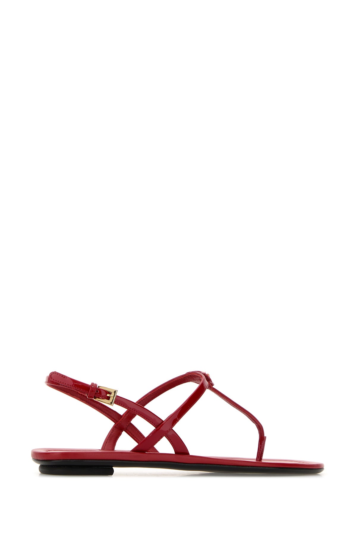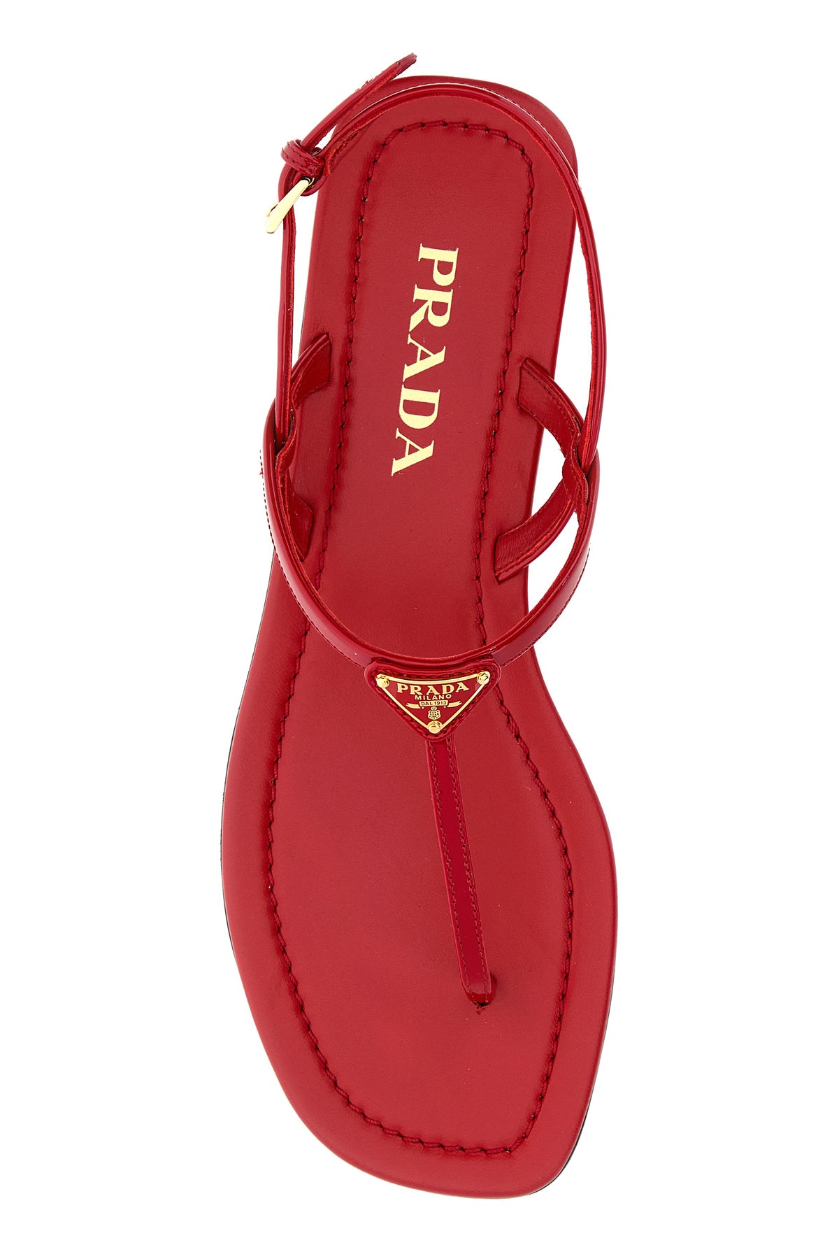 Thong sandals realized in patent leather enriched by iconic logoed metal triangle on the instep.