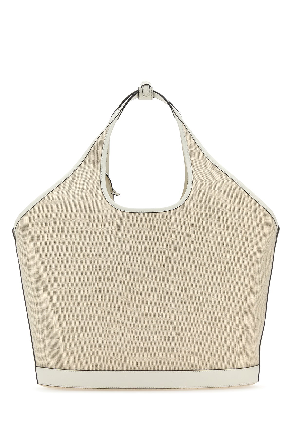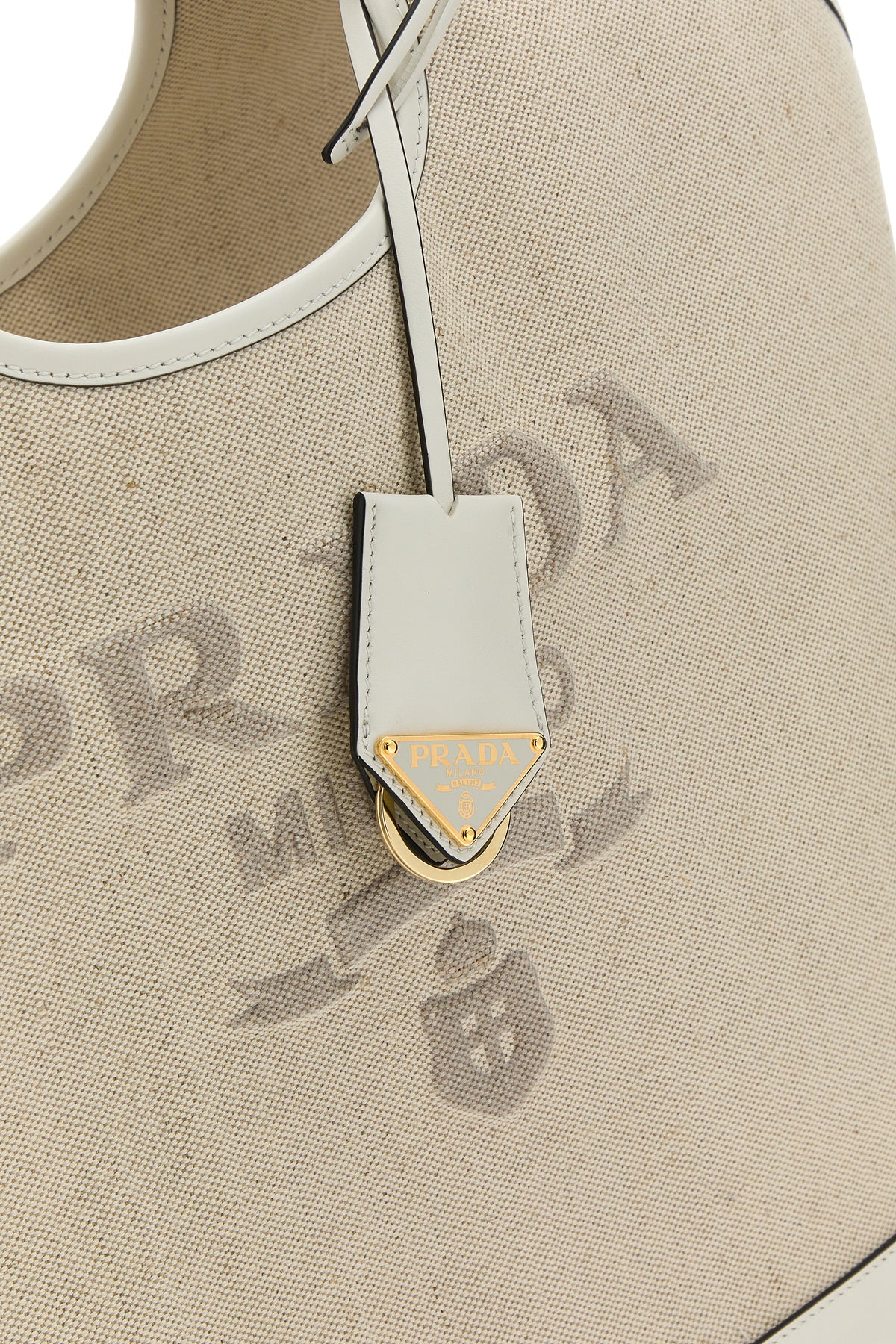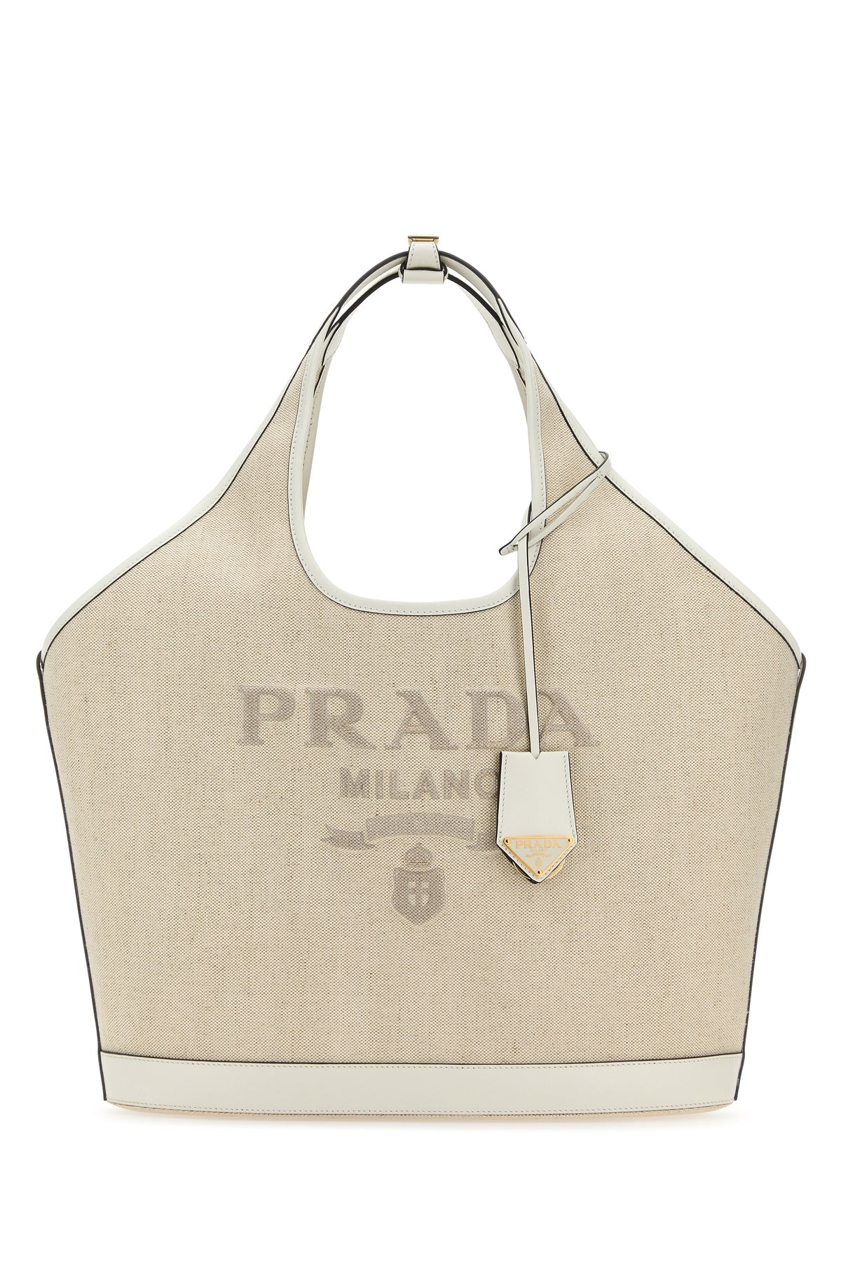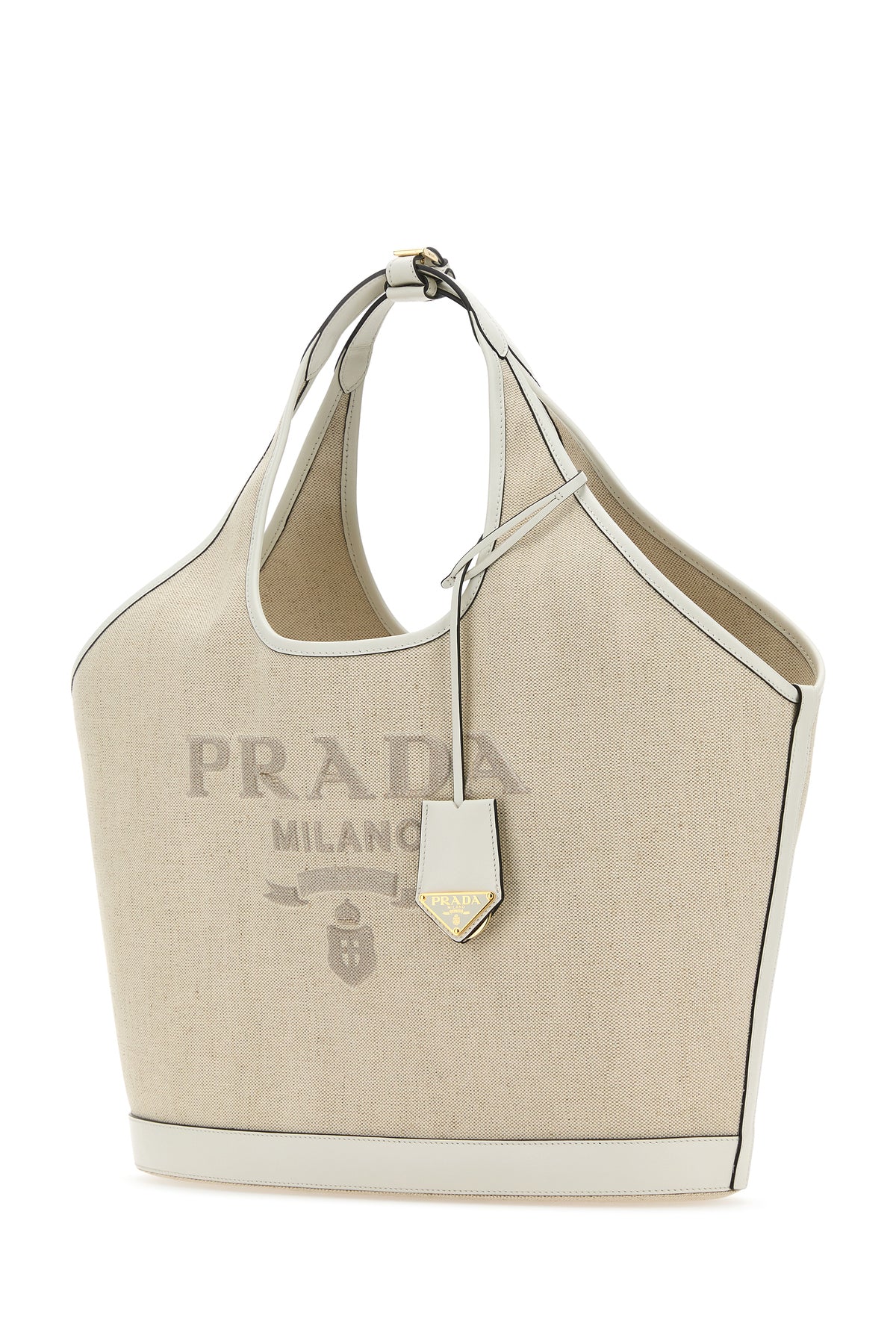 Shopping bag realized in pure linen canvas with contrasting leather inserts on the trimmings characterized by contrasting printed logo at the front enriched by detachable leather keyring accessory with iconic logoed metal triangle.