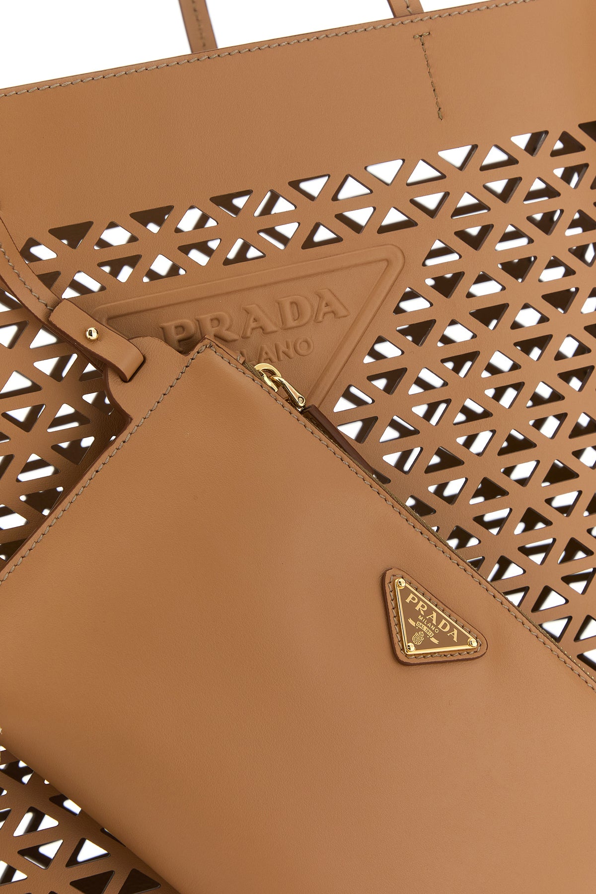 Shopping bag realized in leather characterized by peculiar cut-out details on the entire surface and tonal logo in relief at the front.