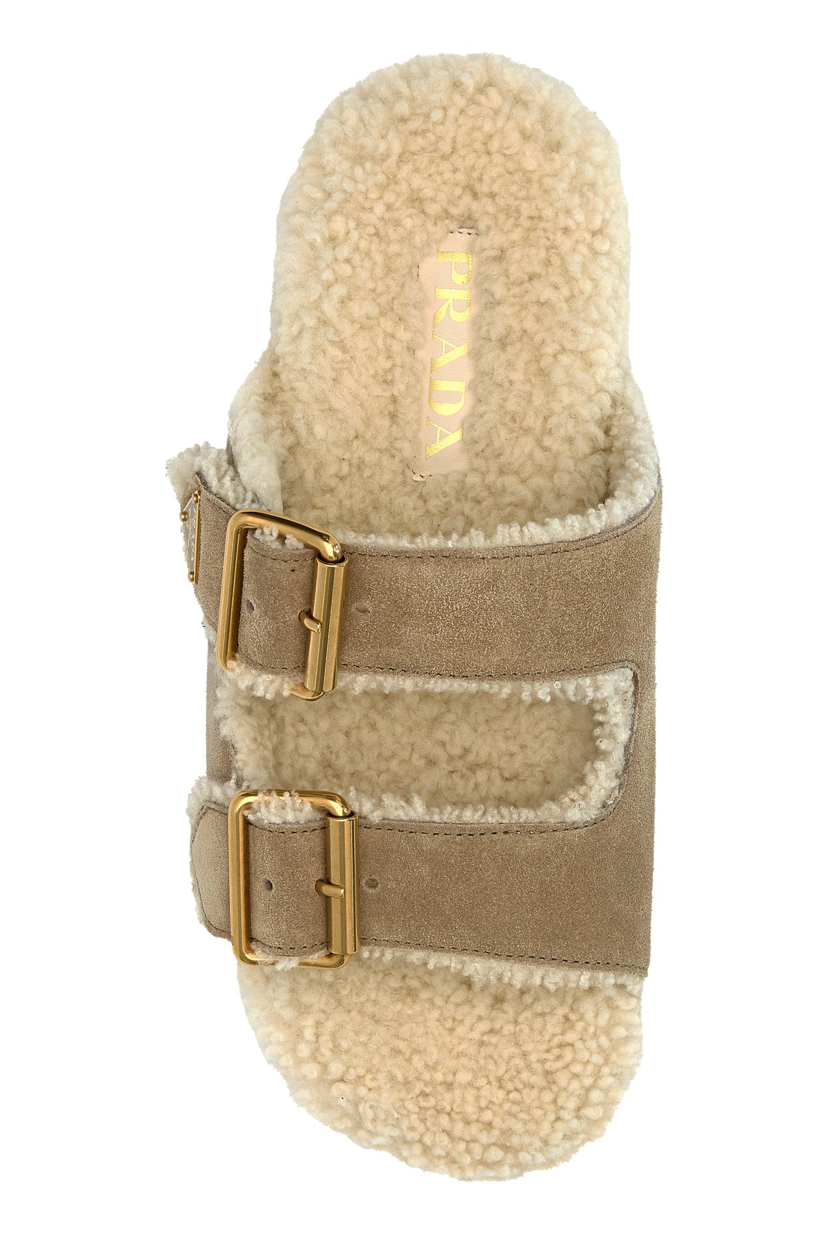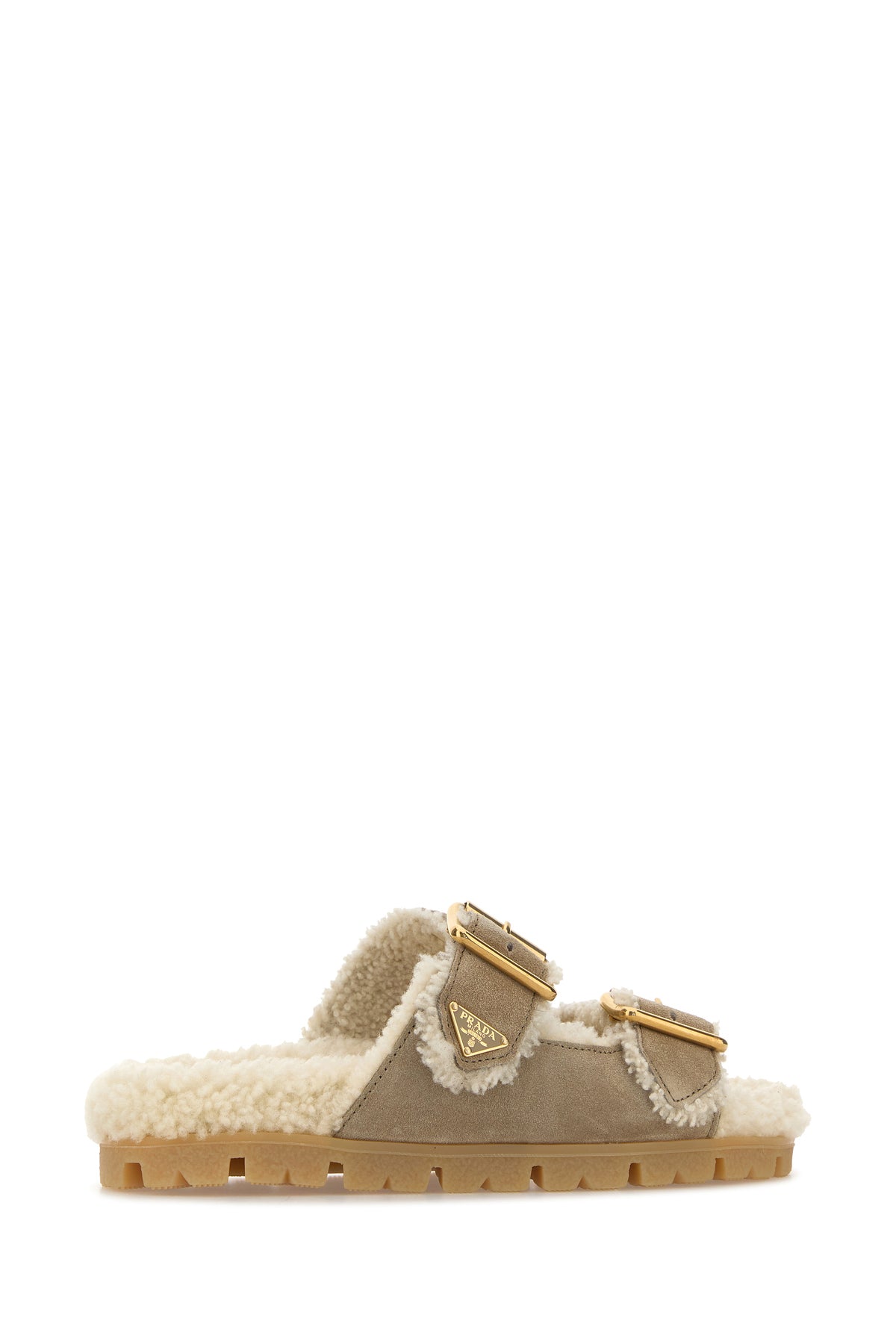 Slippers realized in suede enriched by metal iconic logoed triangle on the side.