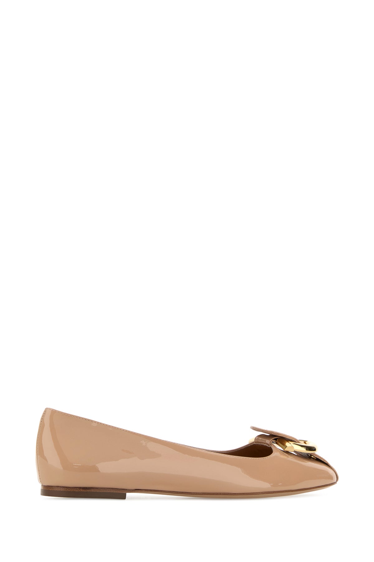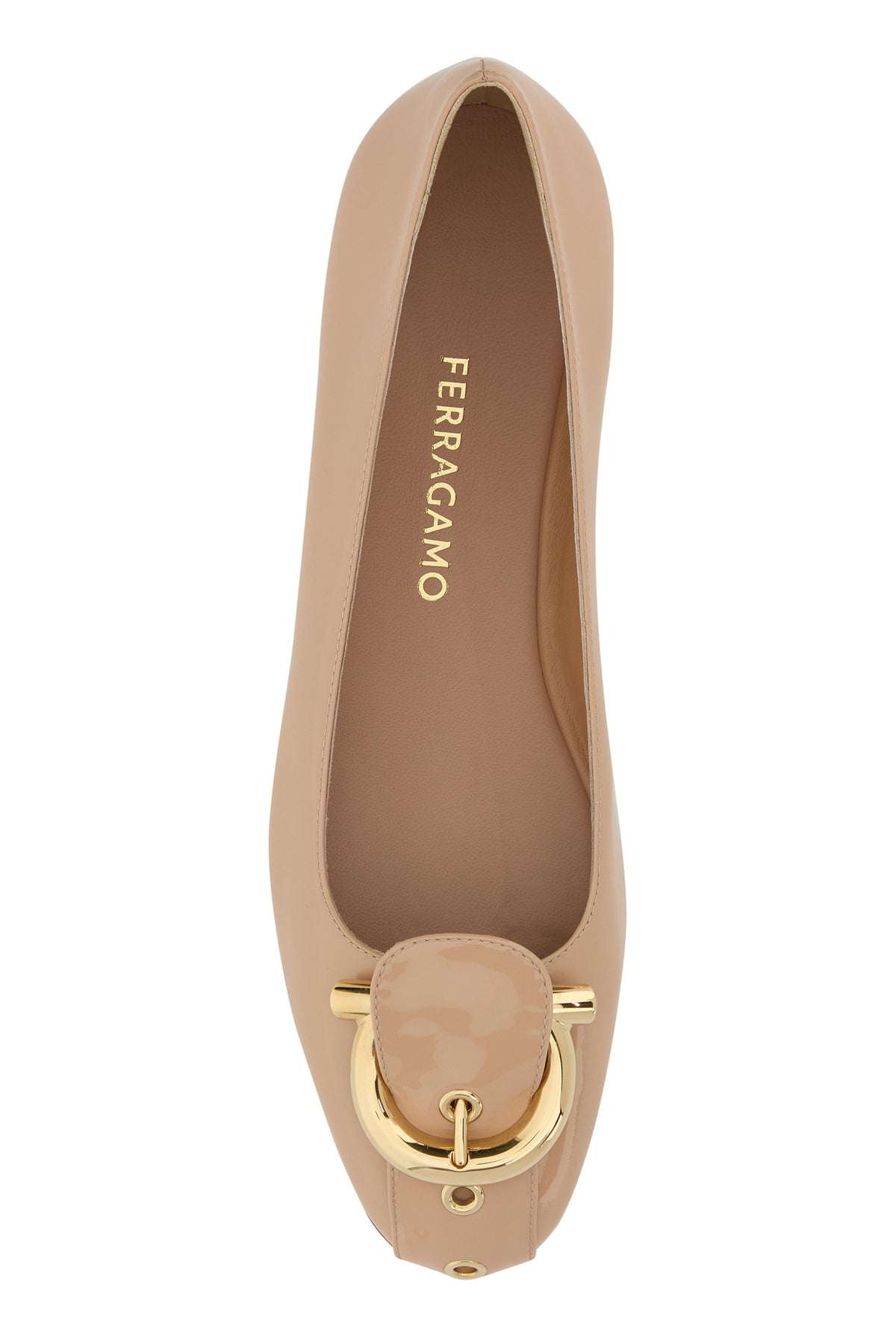Ballerinas realized in patent leather enriched by strap with Gancini metal buckle on the round toe.