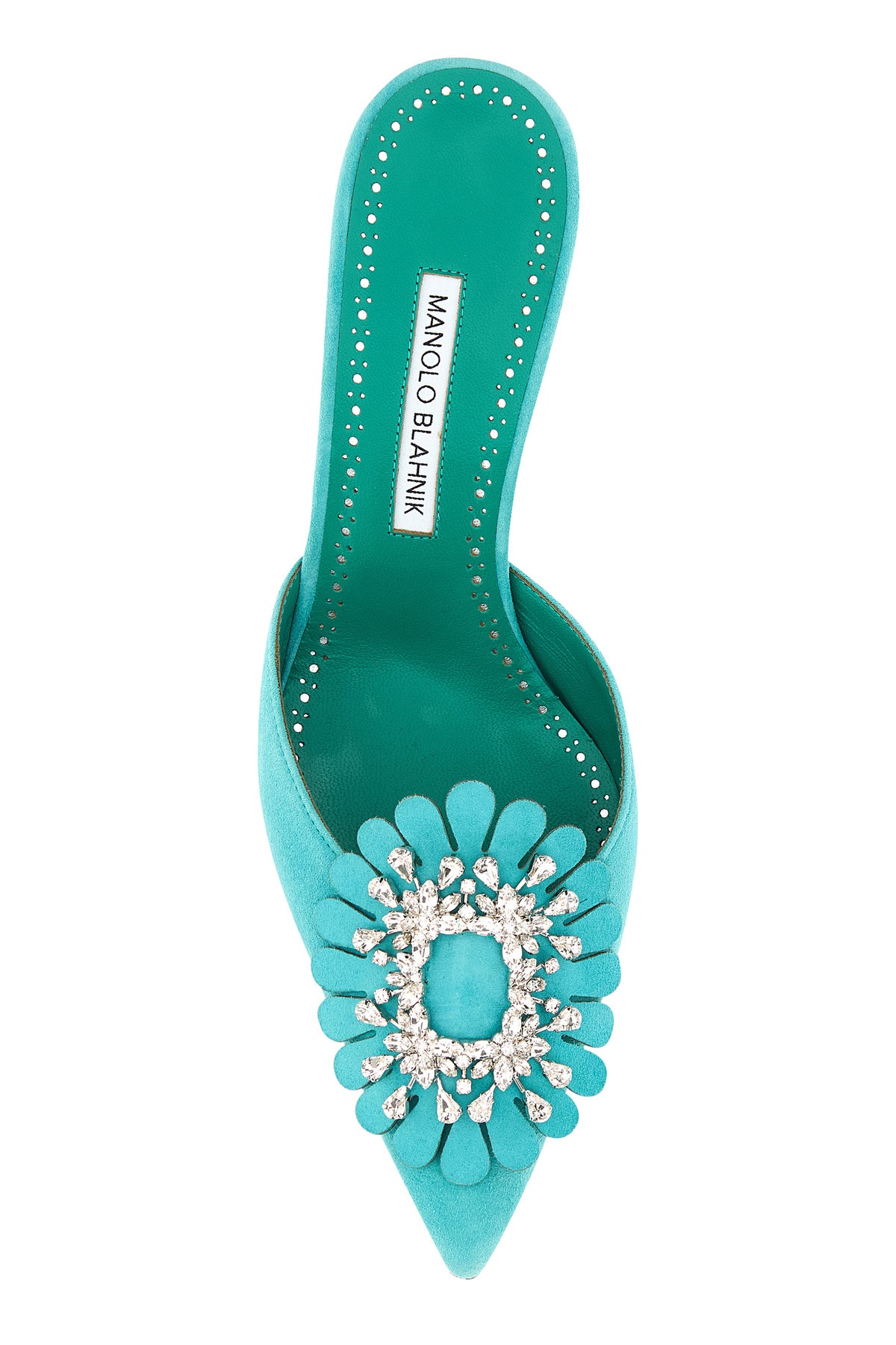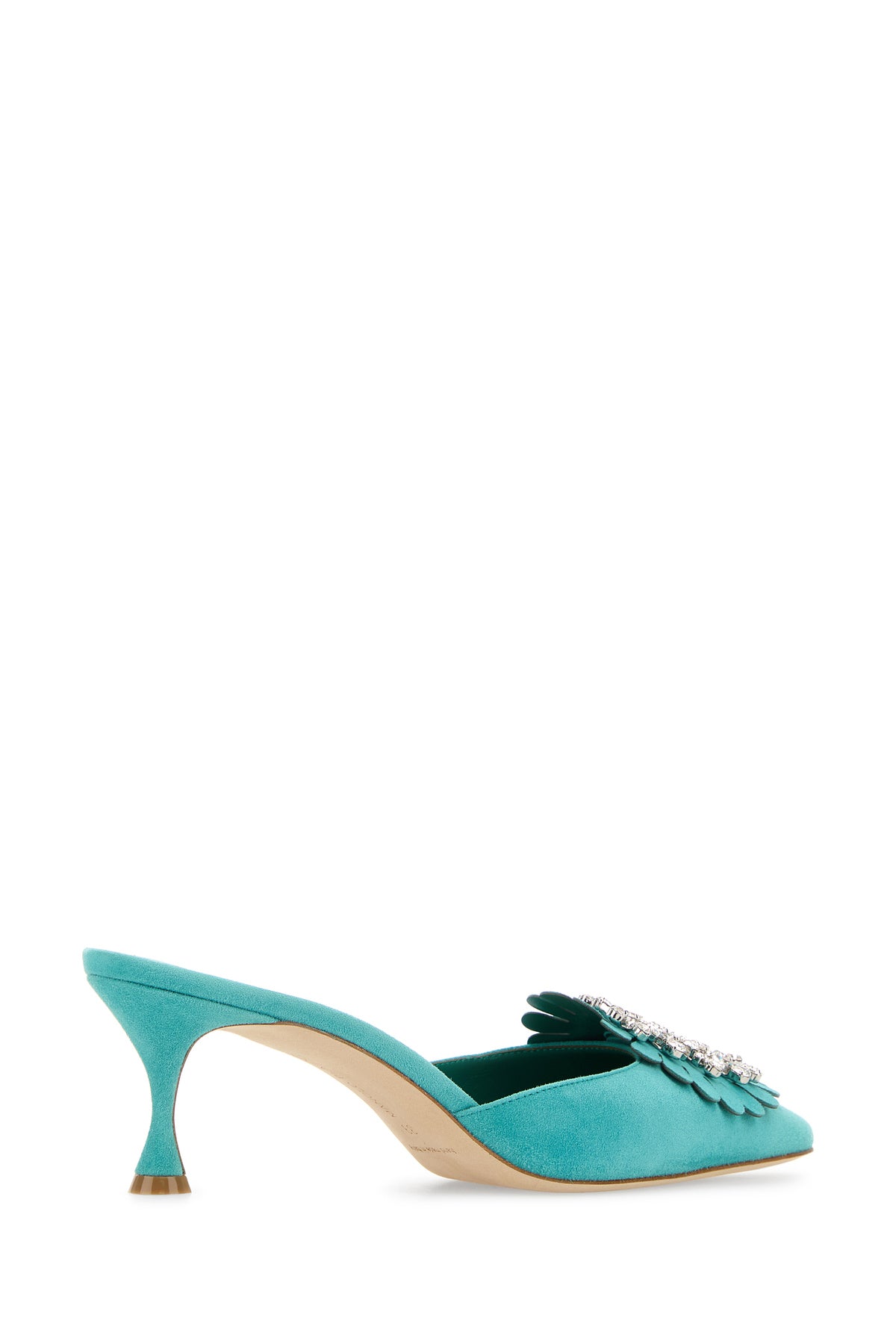 Mules realized in suede enriched by jewel embellishment on the toe.