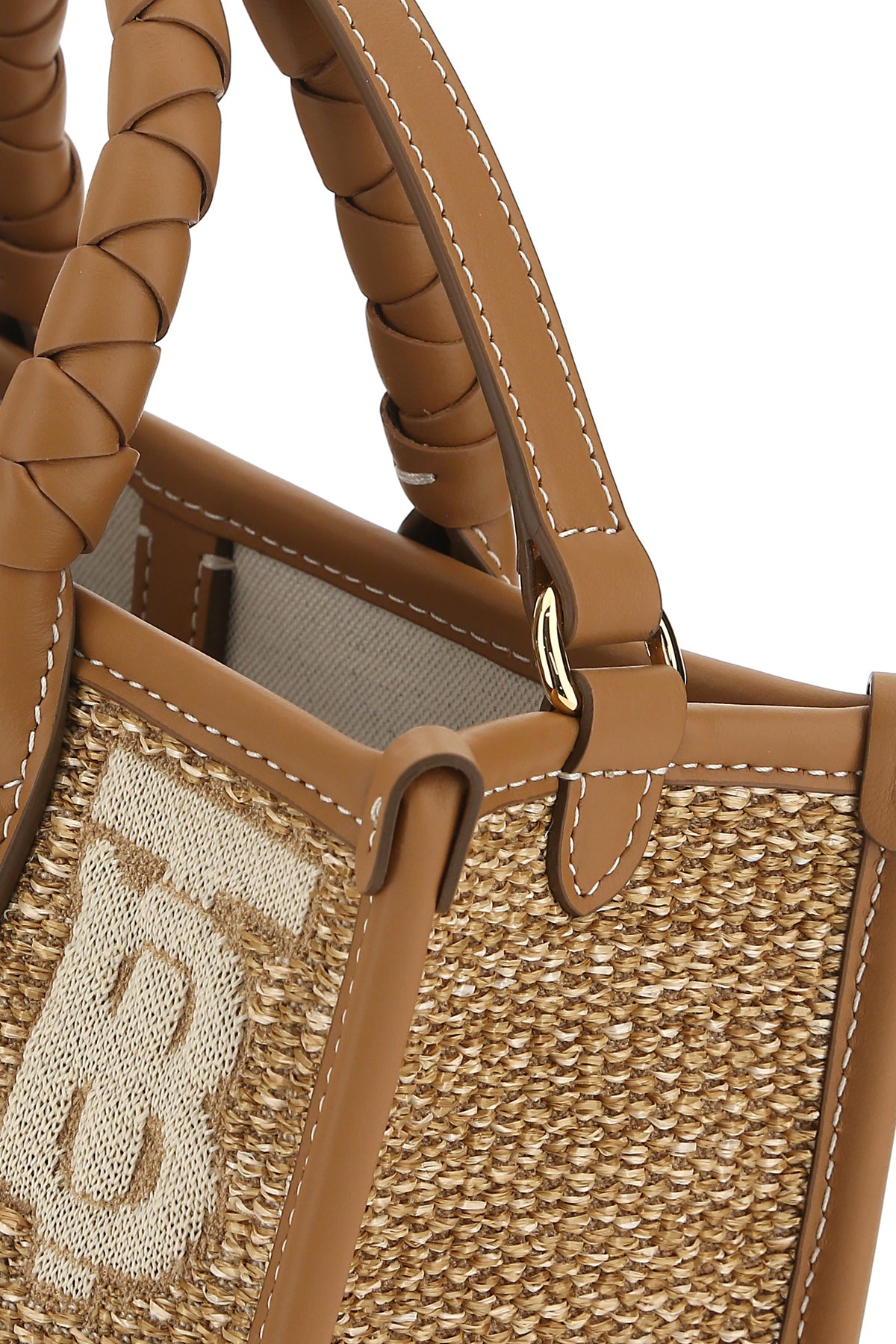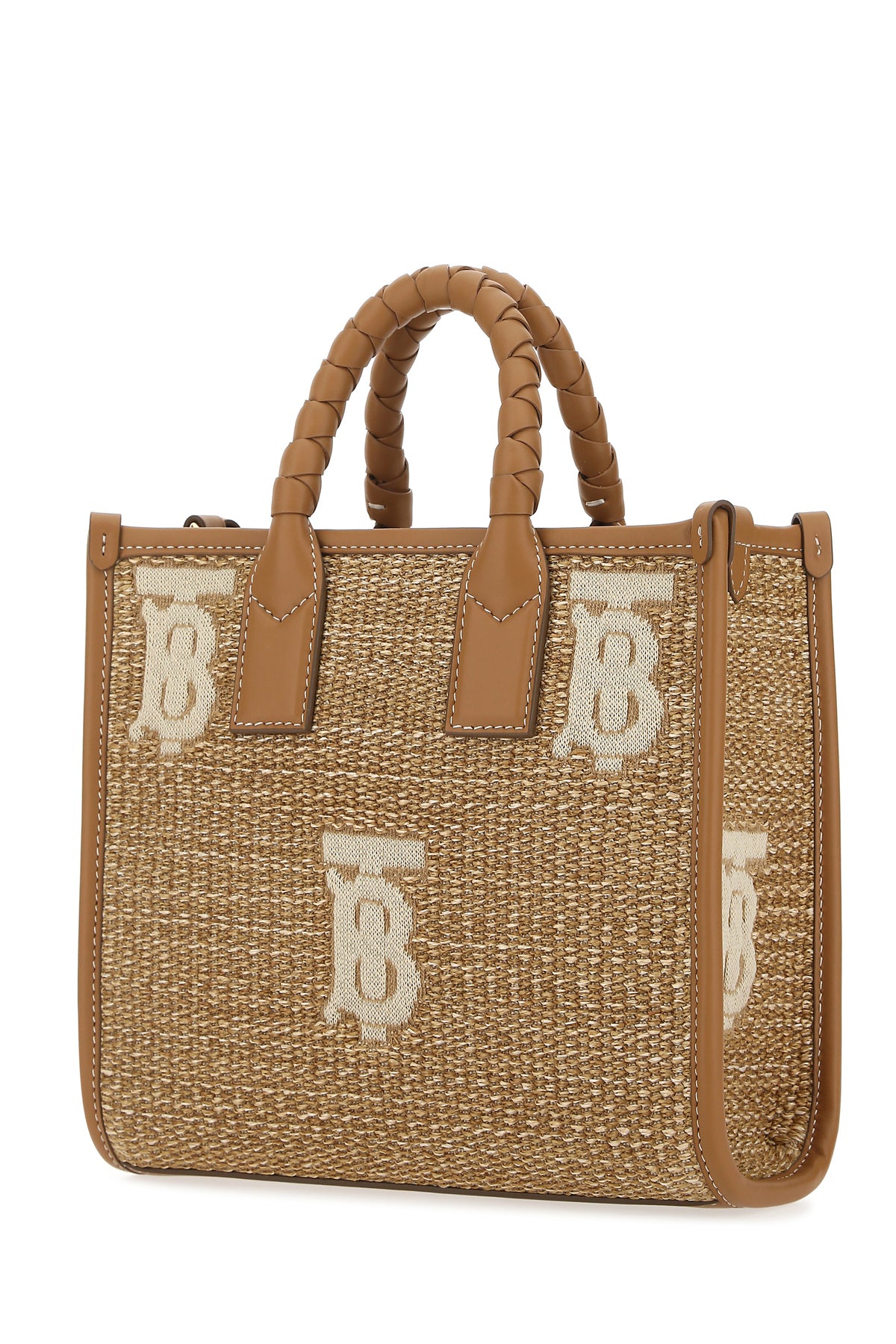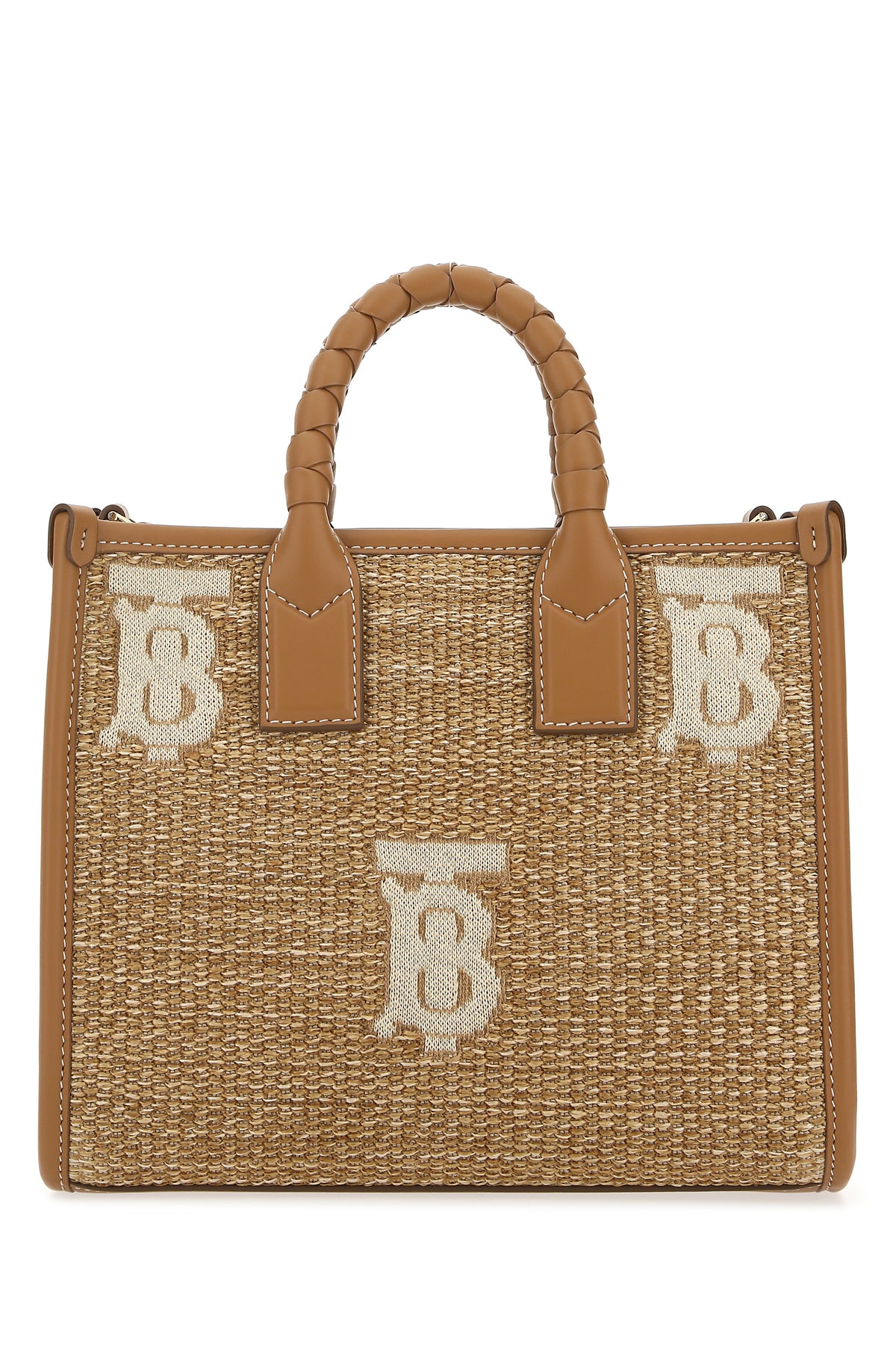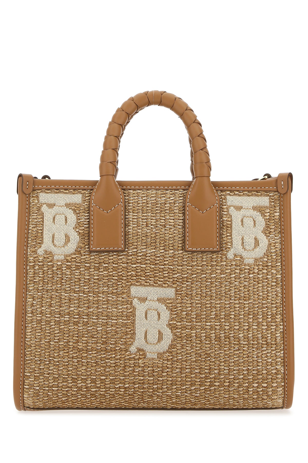 Handbag realized in raffia and smooth calf leather characterized by embroidered TB motif at the front and at the back.