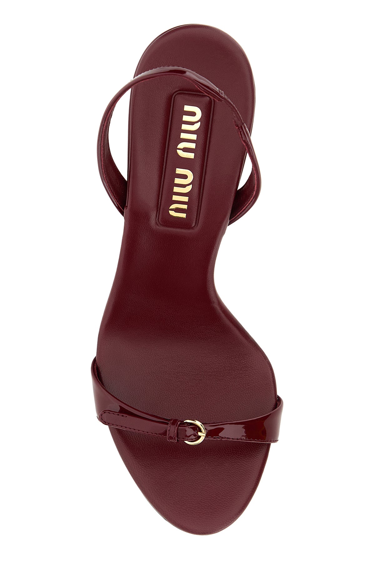 Sandals realized in patent leather characterized by decorative strap on the instep.